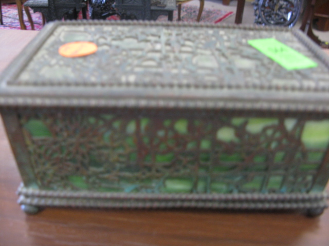 Tiffany and Company bronze and green slag glass box, top glass broken