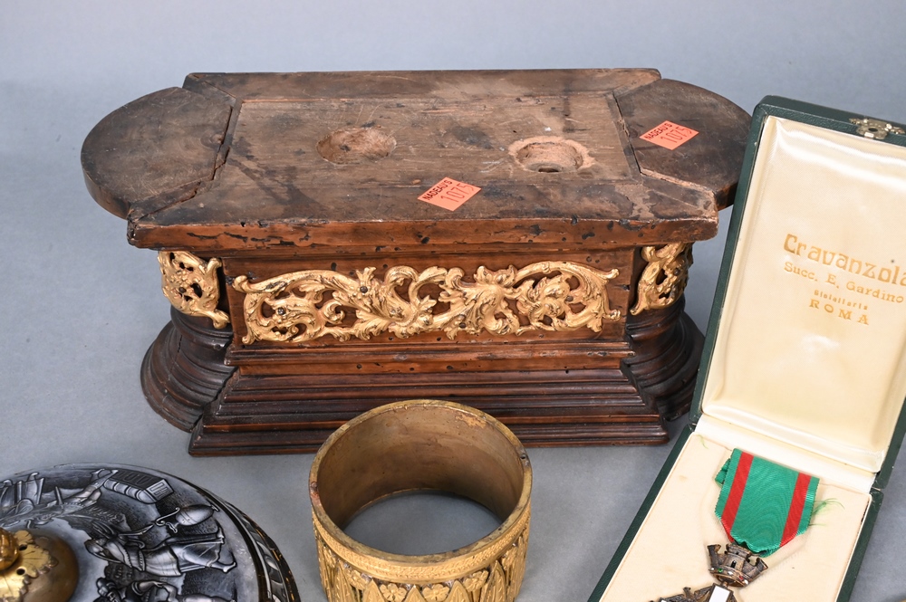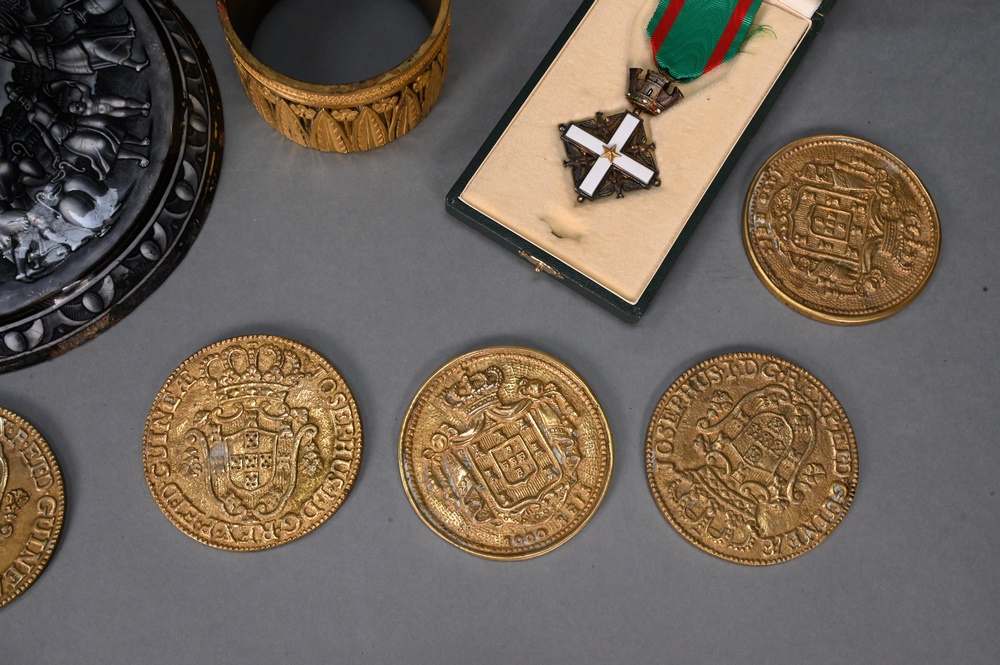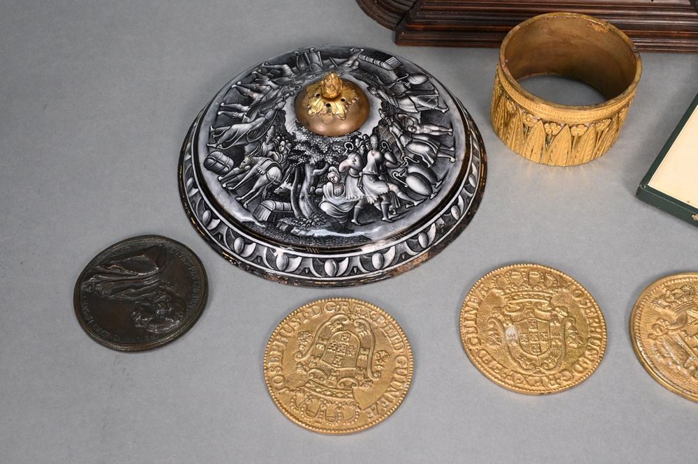 Lot 64: Tray Lot, to include Cheron portrait bronze medal of Gian Lorenzo Bernini, five round bronze, five gilt bronze medals to include 1000 Reis and Guineae Josephus, Cravanzola Roma medal, copper enameled cover with figural scene and a carved base with bronze mounts, along with a Russian icon.