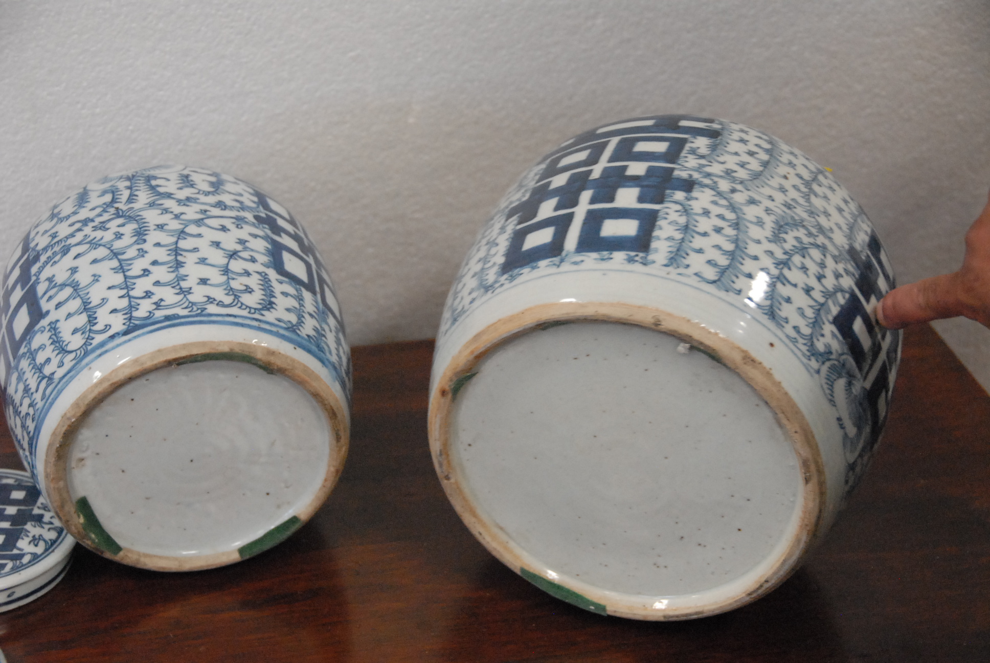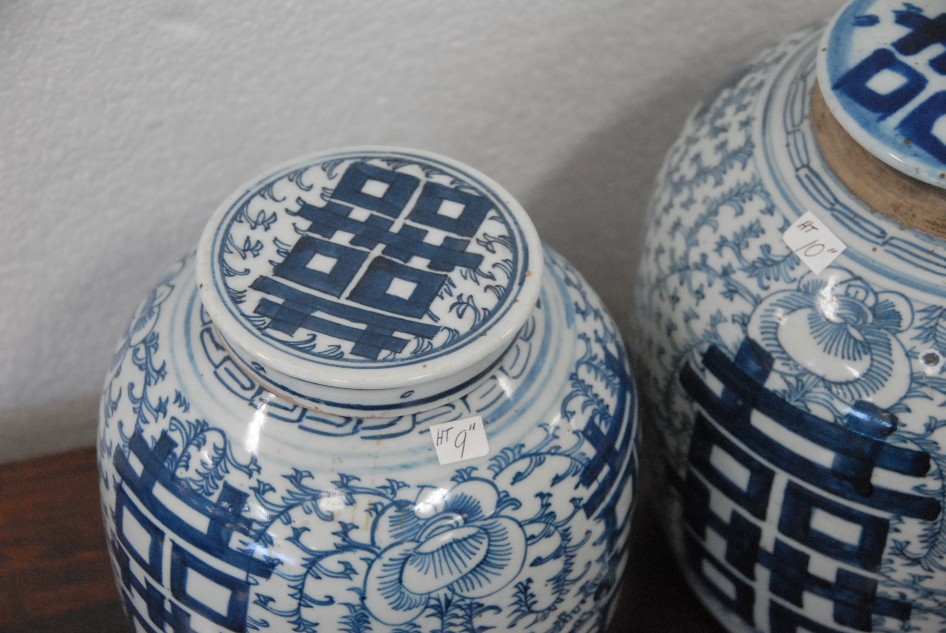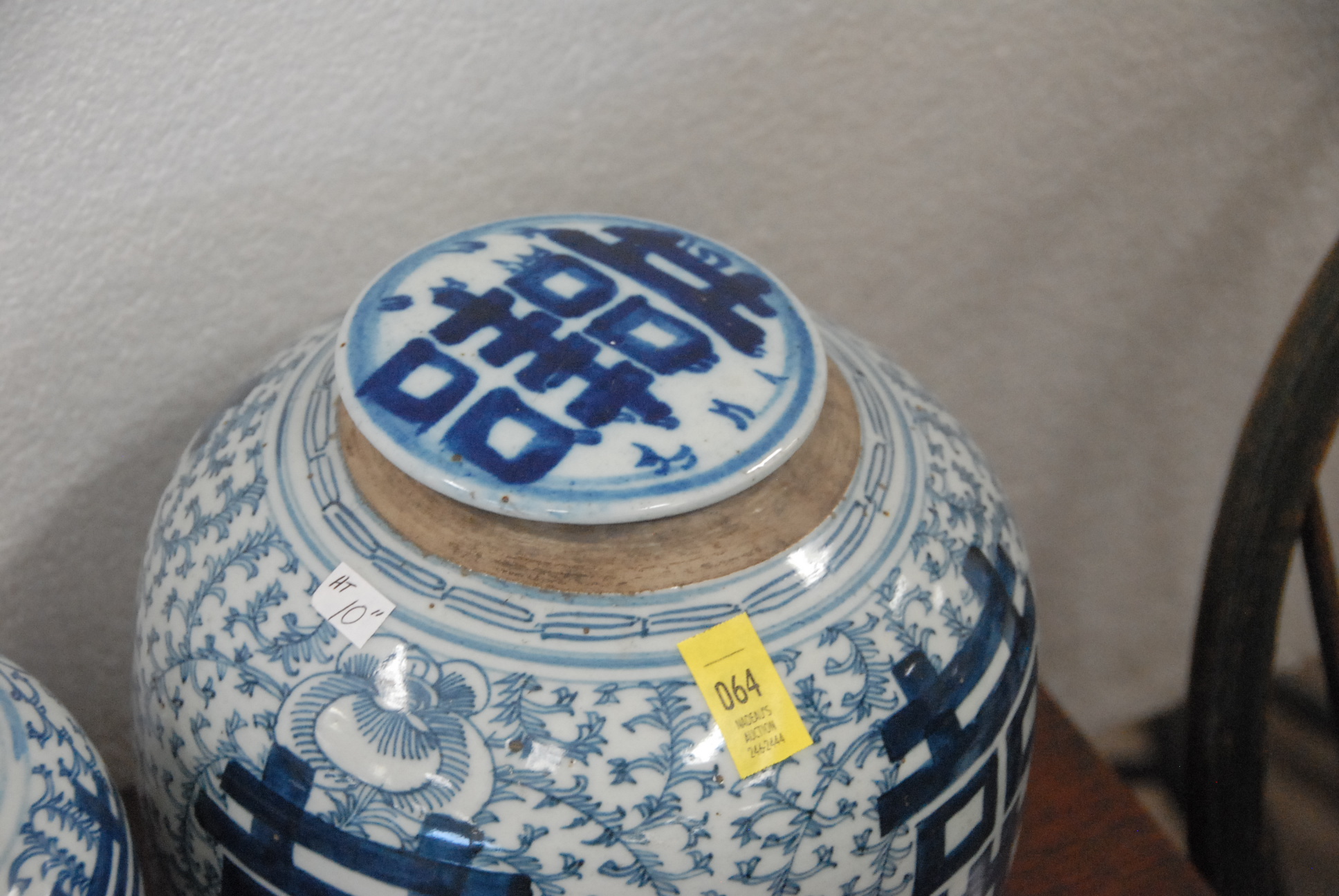Lot 64: Two blue and white ginger jars with covers. hts.