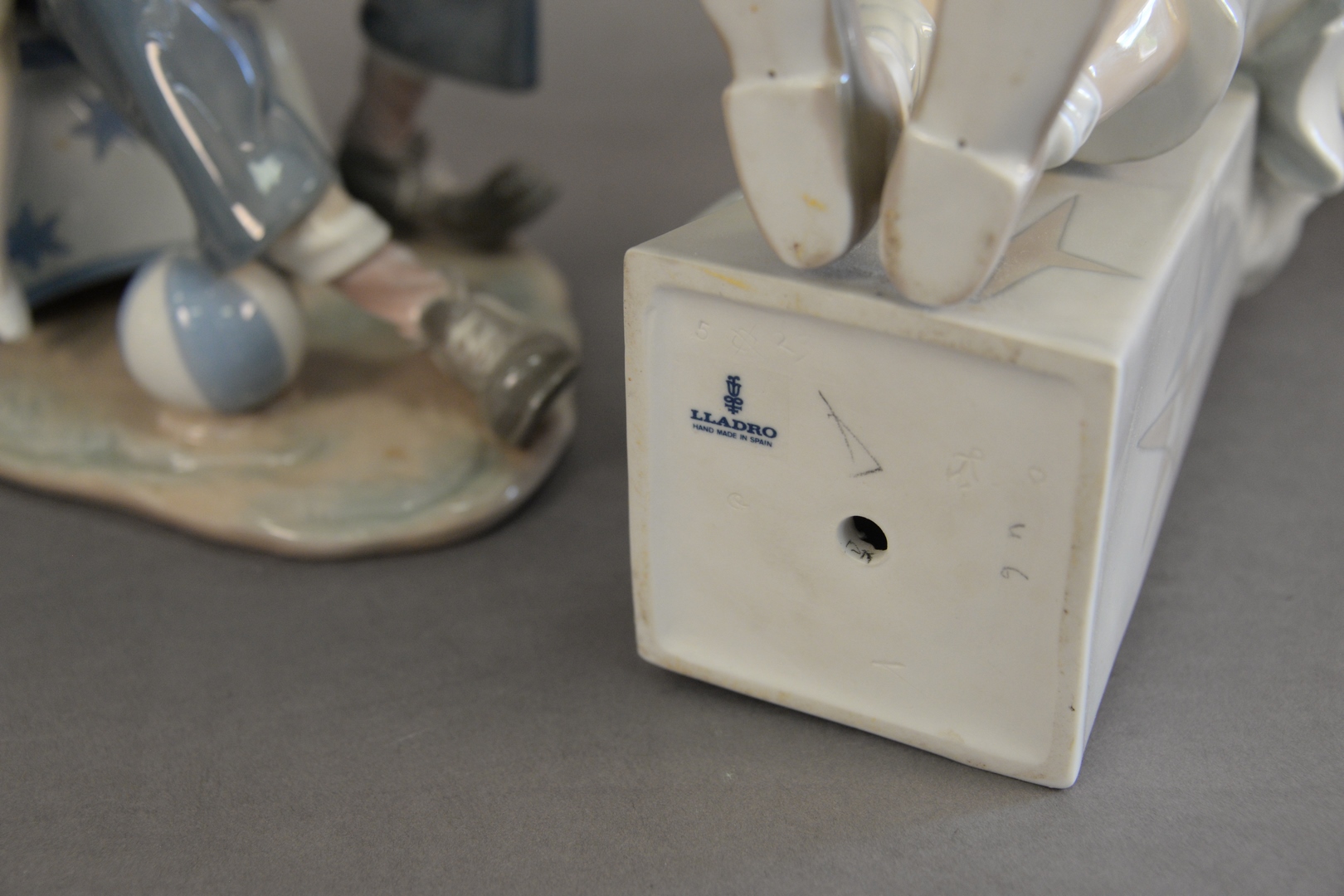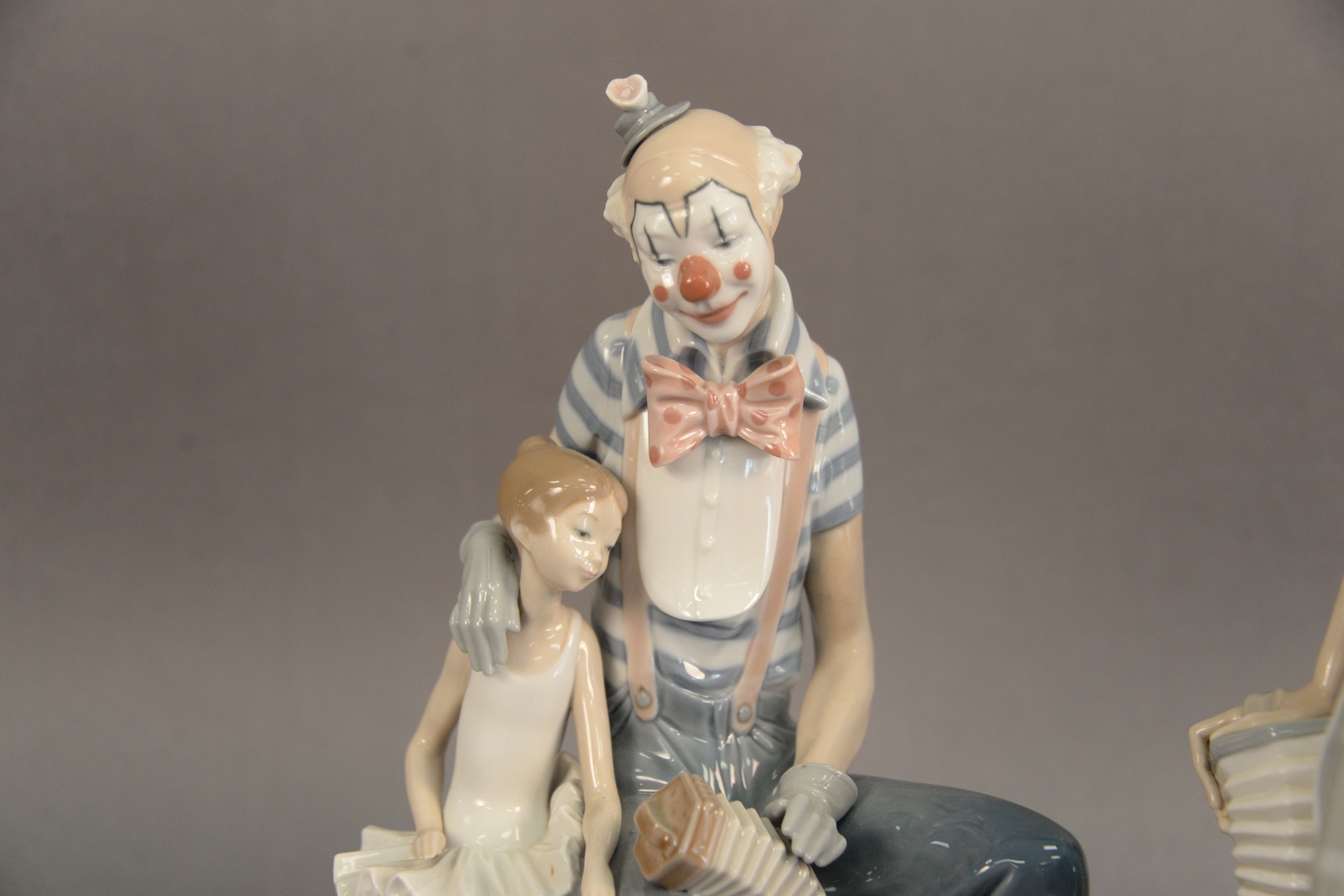 Two Large Lladro Figures, to include a clown with an accordion sitting with a ballerina, along with a clown having an accordian, number 1057, retired in 1989, tallest height 18 inches. Provenance: Estate of James Wadhams.