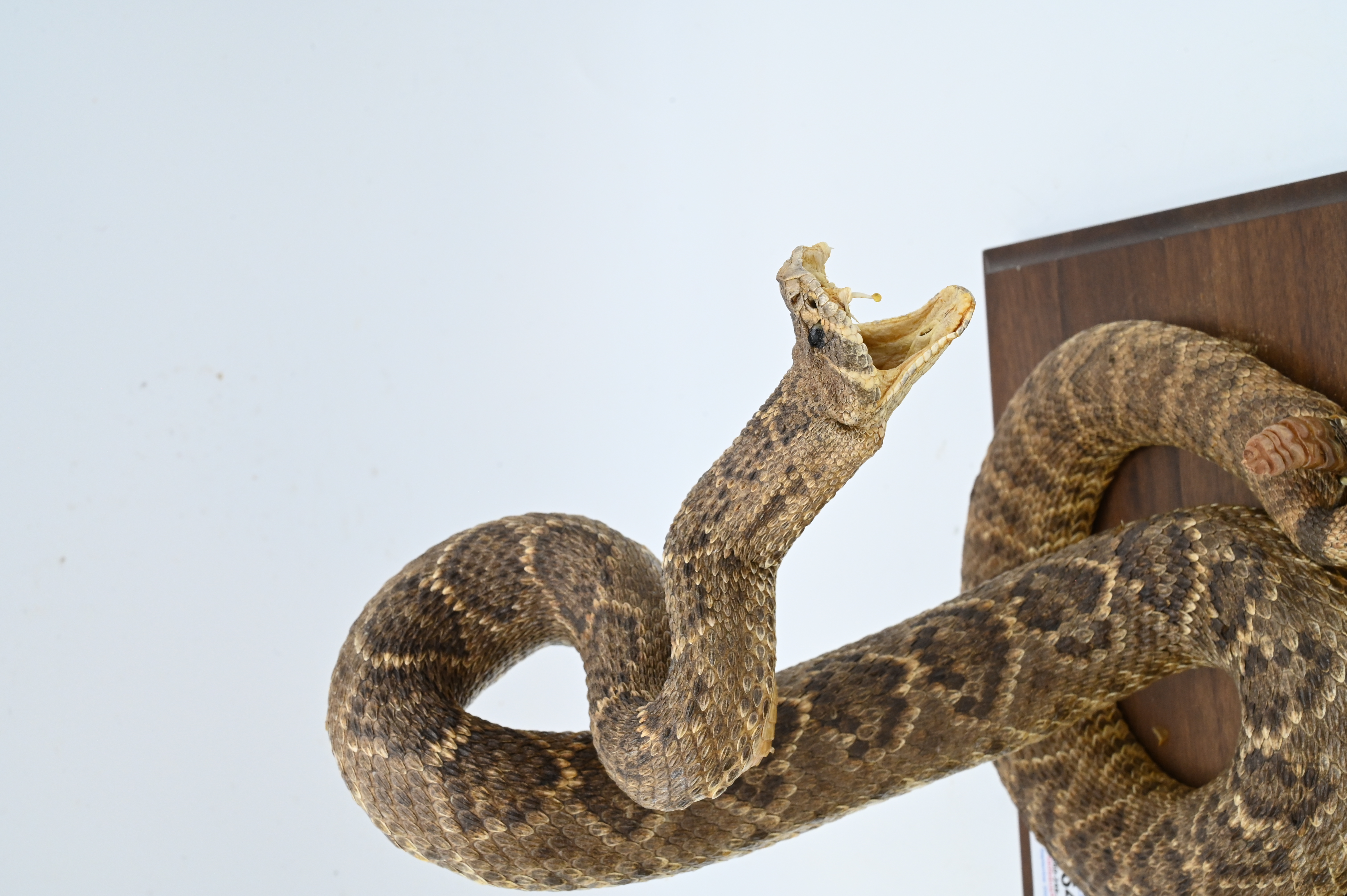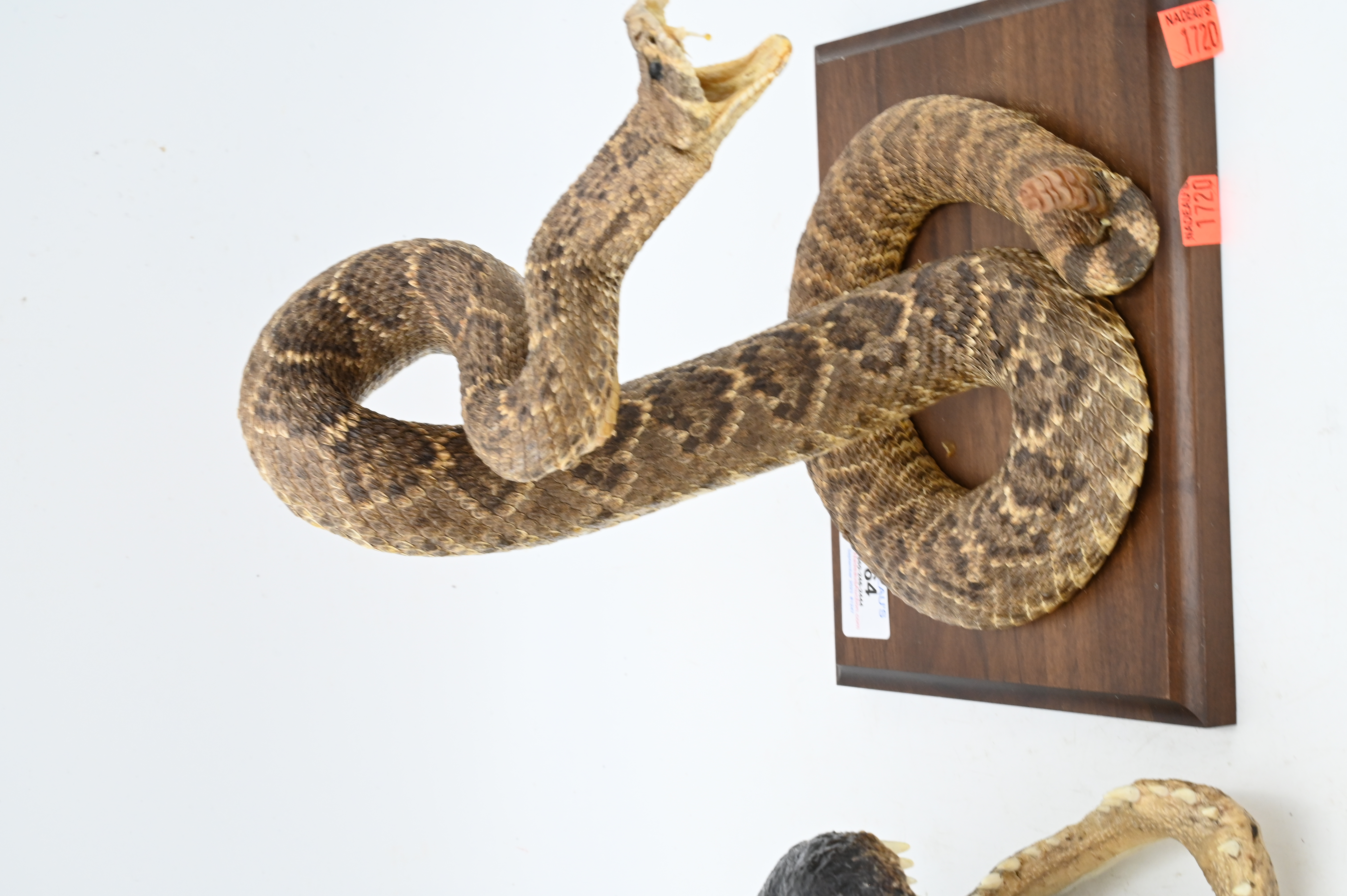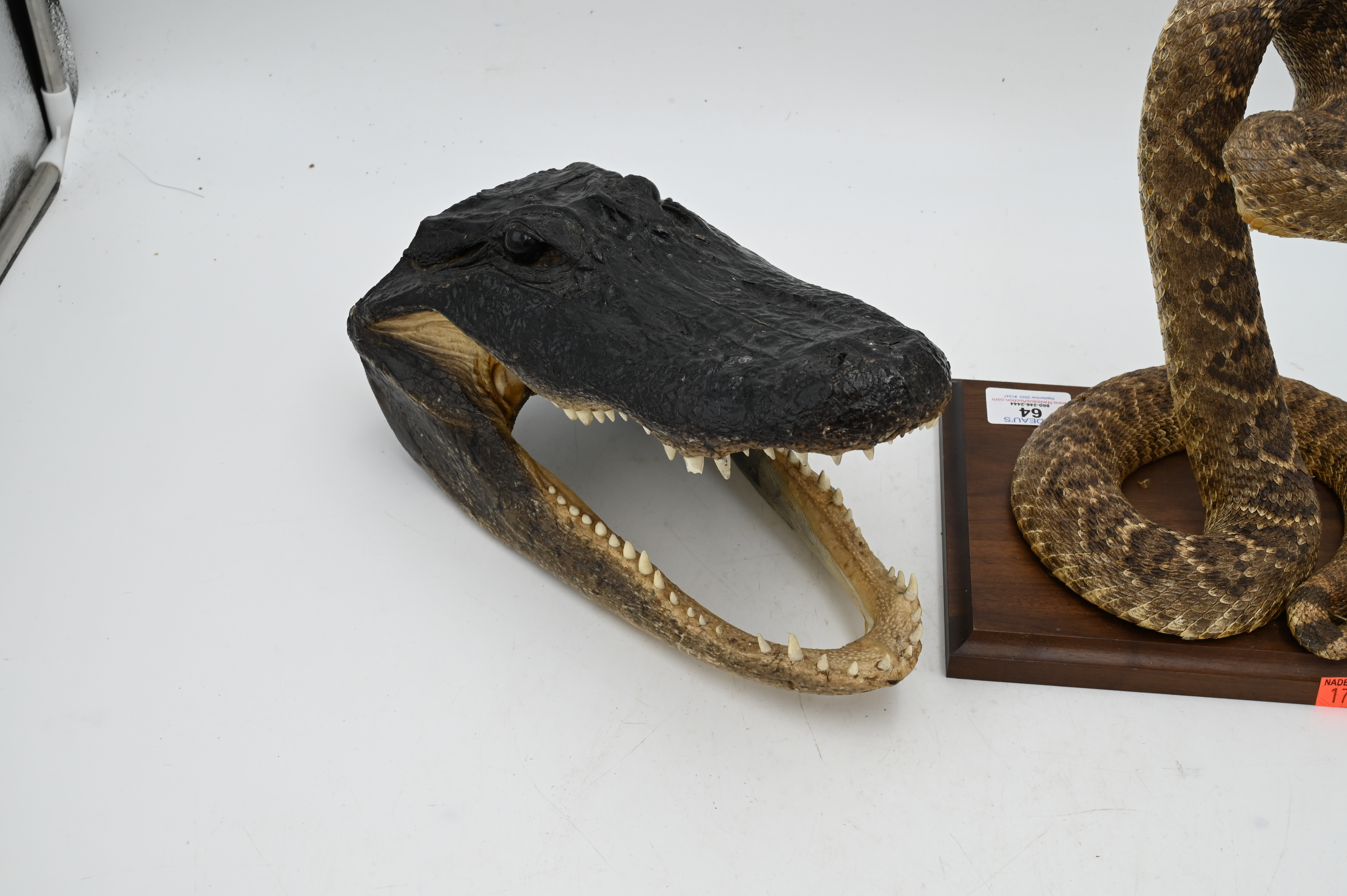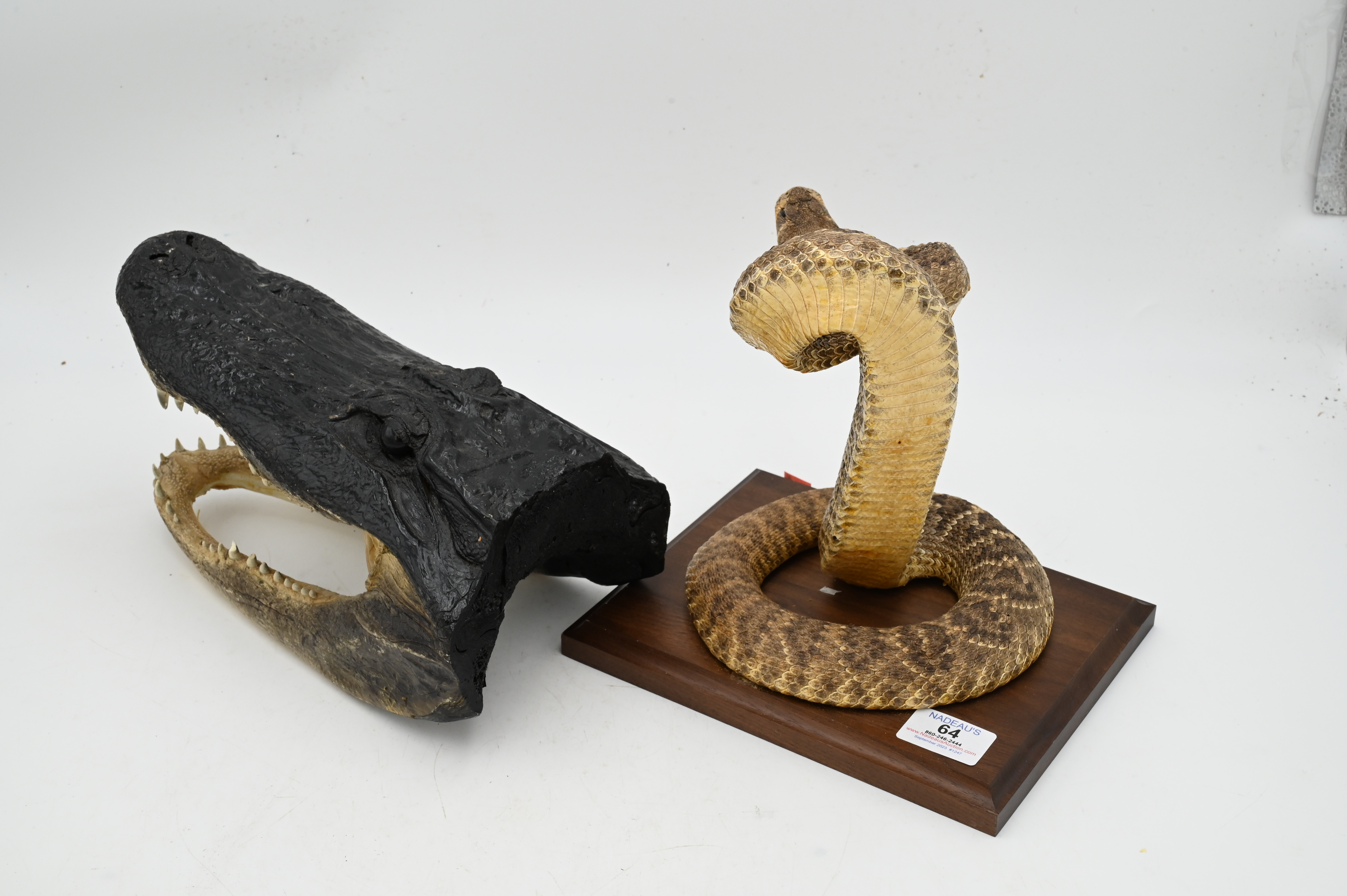 Two Piece Taxidermy Lot, to include a mounted rattlesnake, along with one crocodile/alligator head, snake height is 10 inches.