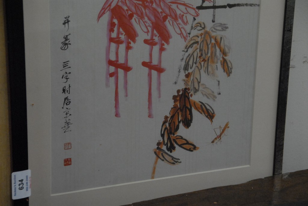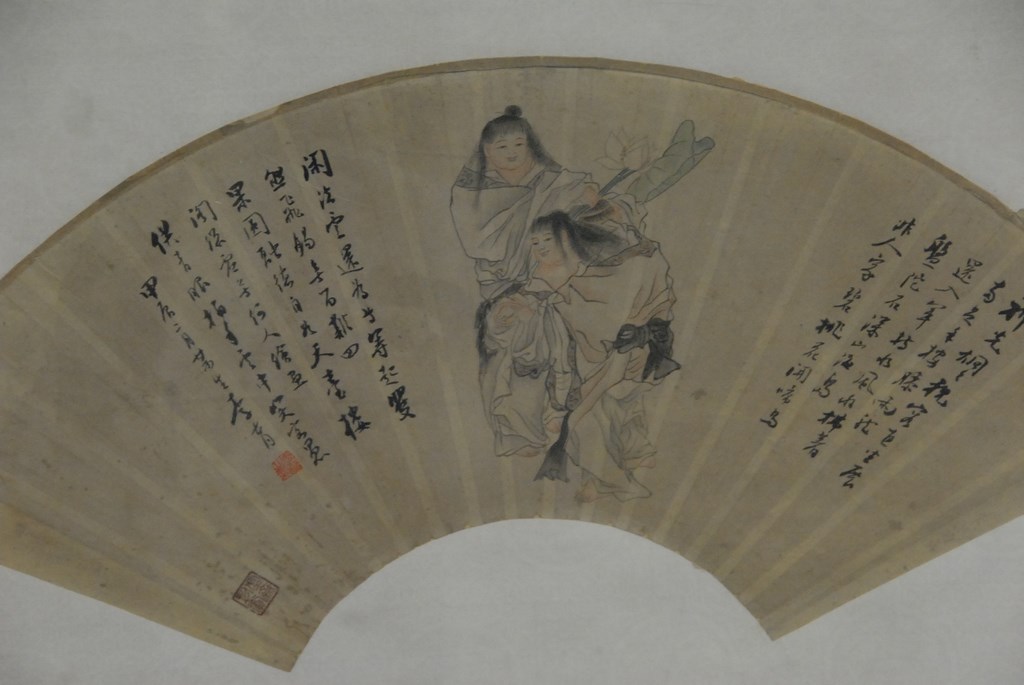 Lot 640: Two framed pieces, one is framed fan and the other a watercolor of leaves and bugs. fan: 7 1/2 x 21 watercolor: 25′ x 12