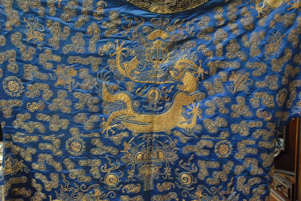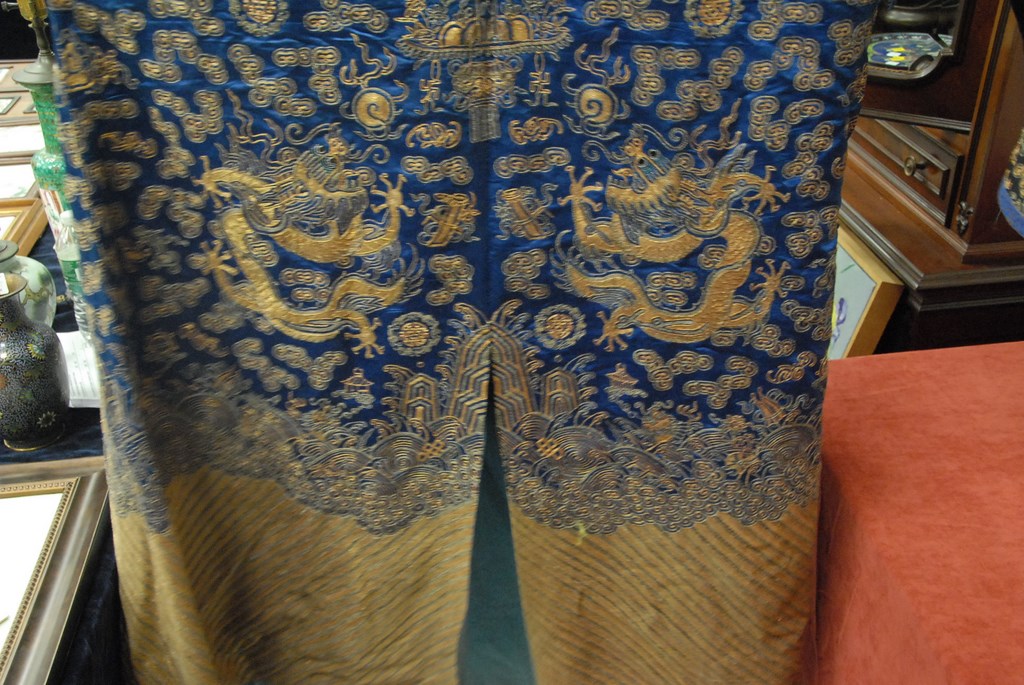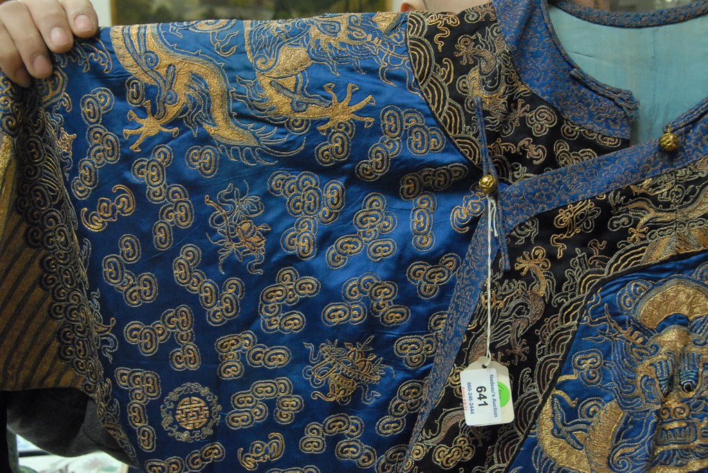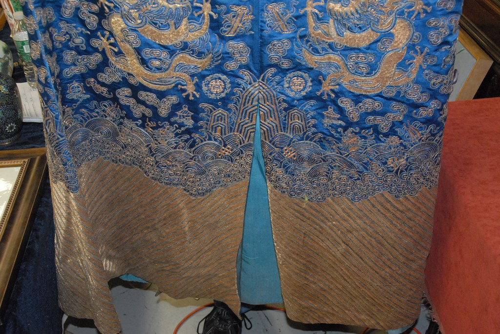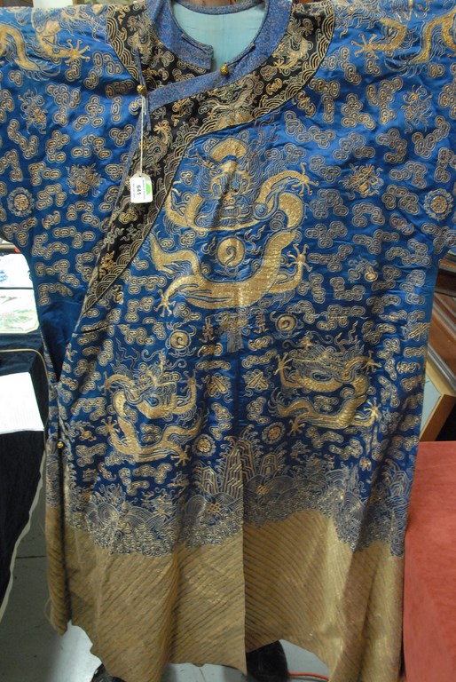 Lot 641: Chinese blue silk court robe, blue silk with gold threading of a five claw dragon amongst flaming clouds and auspicious designs. l…