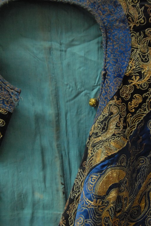 Chinese blue silk court robe, blue silk with gold threading of a five claw dragon amongst flaming clouds and auspicious designs. lg. 52in.