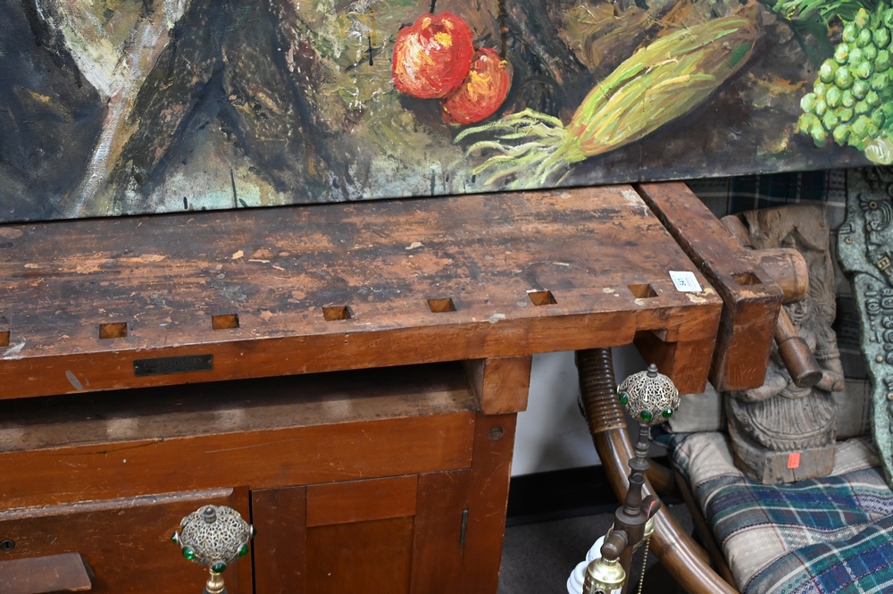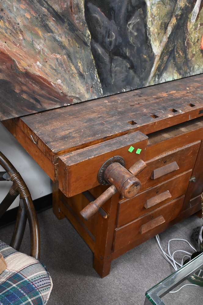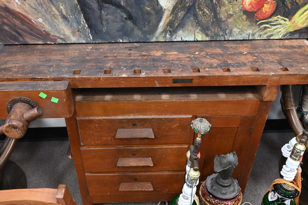 Lot 641: Woodworkers Workbench, marked Christiansen Chicago IL, height 32 inches, top 21″ x 48″. Provenance: Estate of James Dana English of New Haven to benefit the New Haven CT Museum.