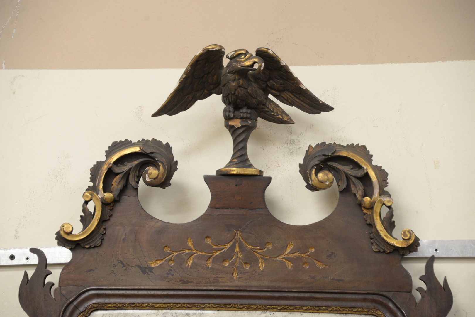 Lot 641A: Mahogany Chippendale Style Mirror, with eagle finial, circa 1900, height 52 inches, width 25 inches.