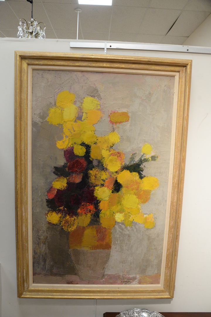 Lot 642: Bernard Cathelin 1919 – 2004 Roses d’ Inde au Fond Gris, 1966 still life of flowers in a vase oil on canvas signed and dated Cat…
