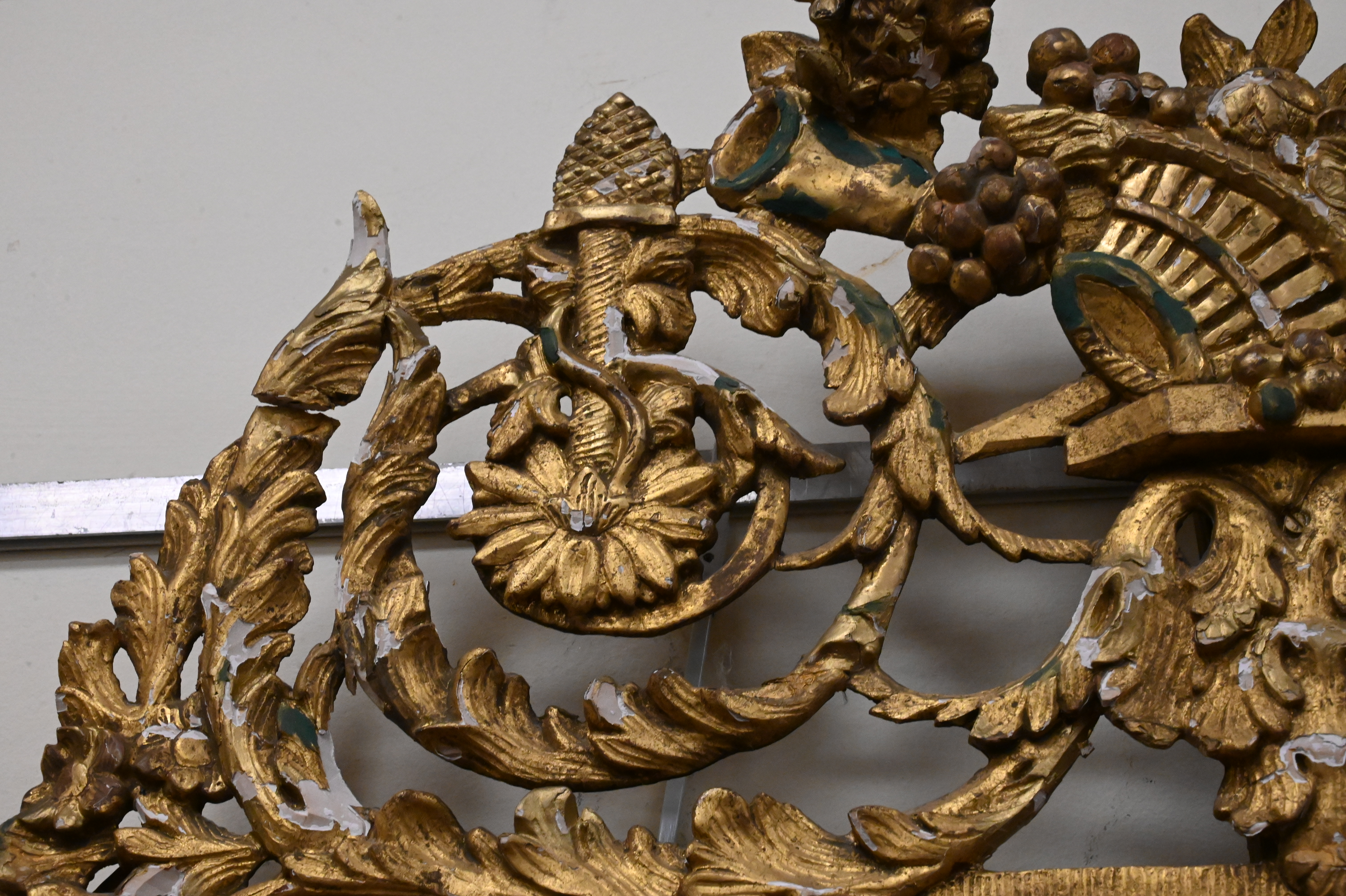 having a rectangular plate within a frame carved with beading and leaf-tops, all beneath a fruit-filled basket and gardening trophy crest, scrolling leaf decoration