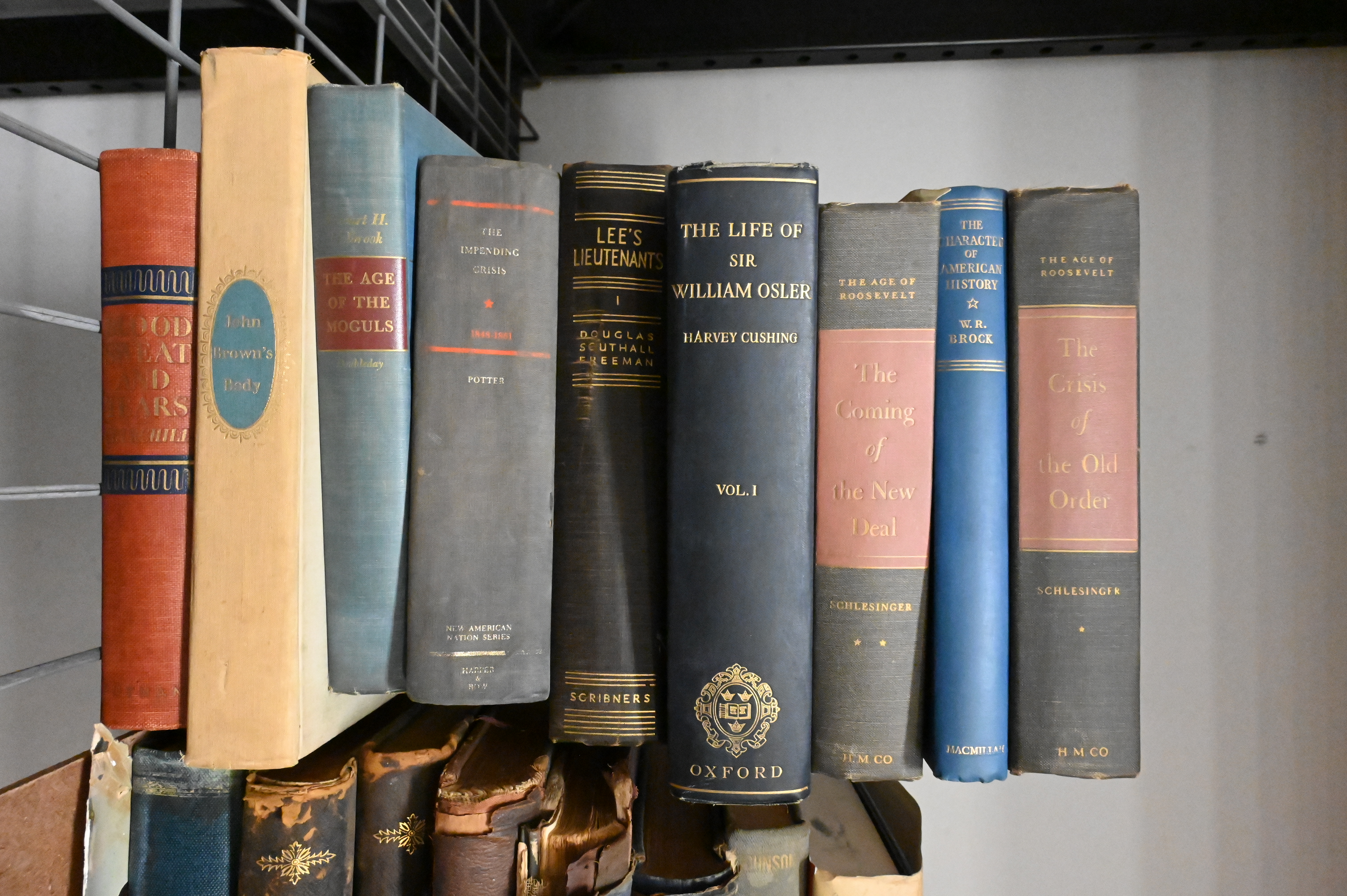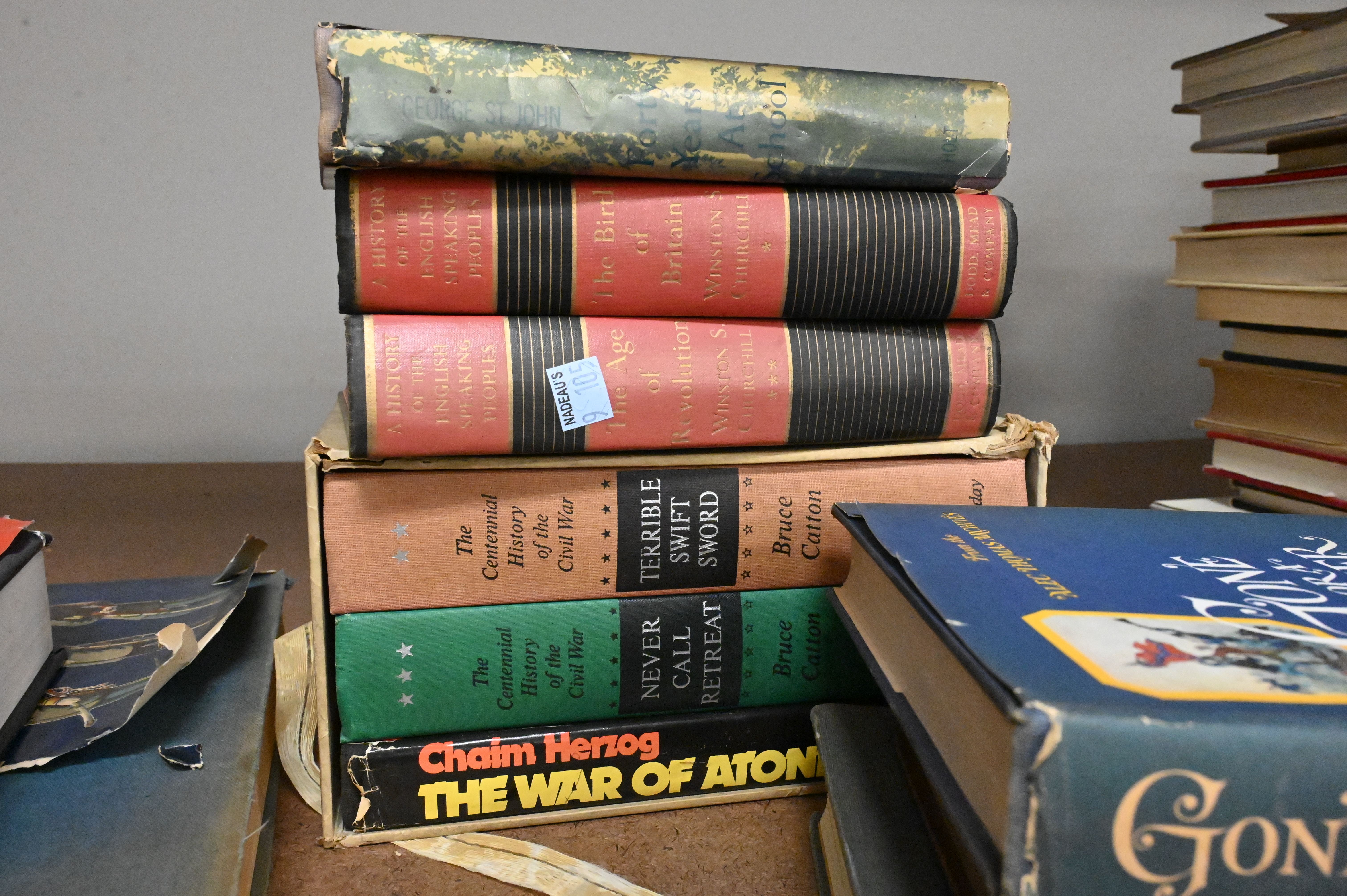 mostly leather bound, to inlcude five volume set of The Civil War by Shelby Foote, The Boys of ’61 and ’76 by Charles Coffin, The Red Badge of Coursage, The Soliders in our Civil War Volume 1 – 2, and Harpers Weekly, along with other books related to war