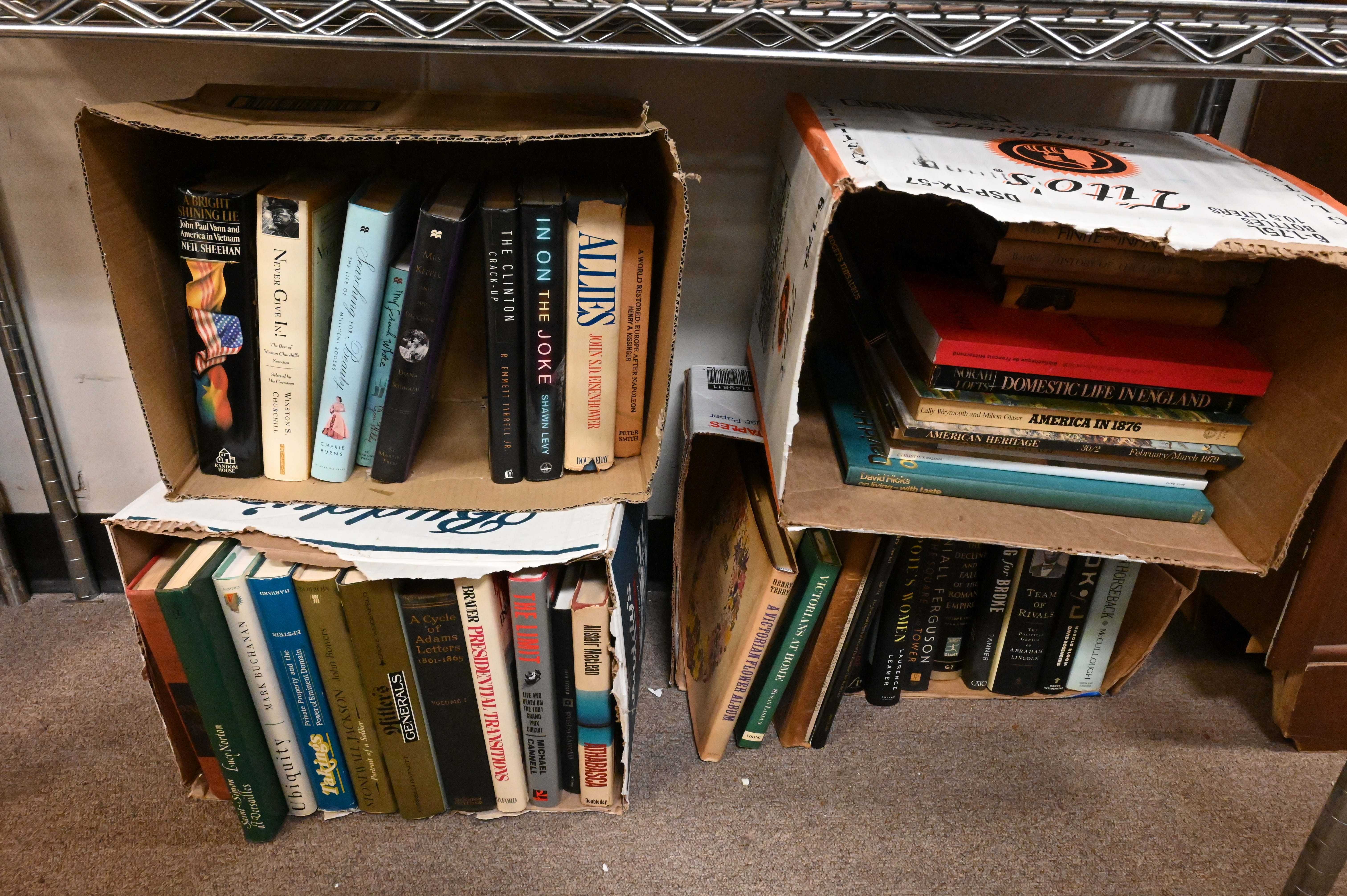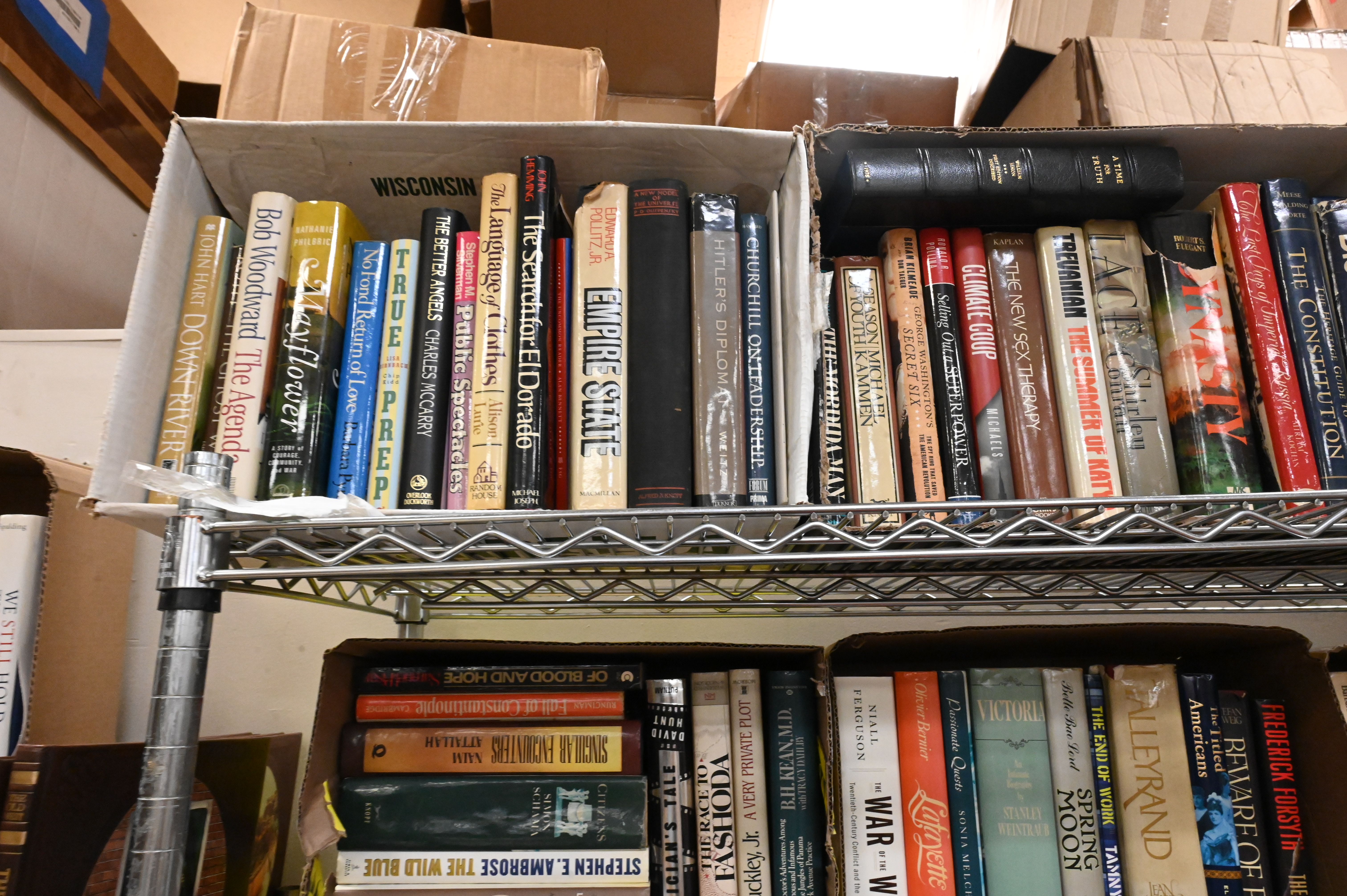An extensive grouping of books spanning history, biography, politics, literature, travel, economics, social commentary, and cultural studies. Titles include works on American and European history, world wars, political figures, philosophy, art and architecture, travel narratives, and modern nonfiction, along with select literary classics and contemporary novels. Publishers include Random House, Knopf, Viking, Harper & Row, Oxford, Yale, Time-Life, and others.