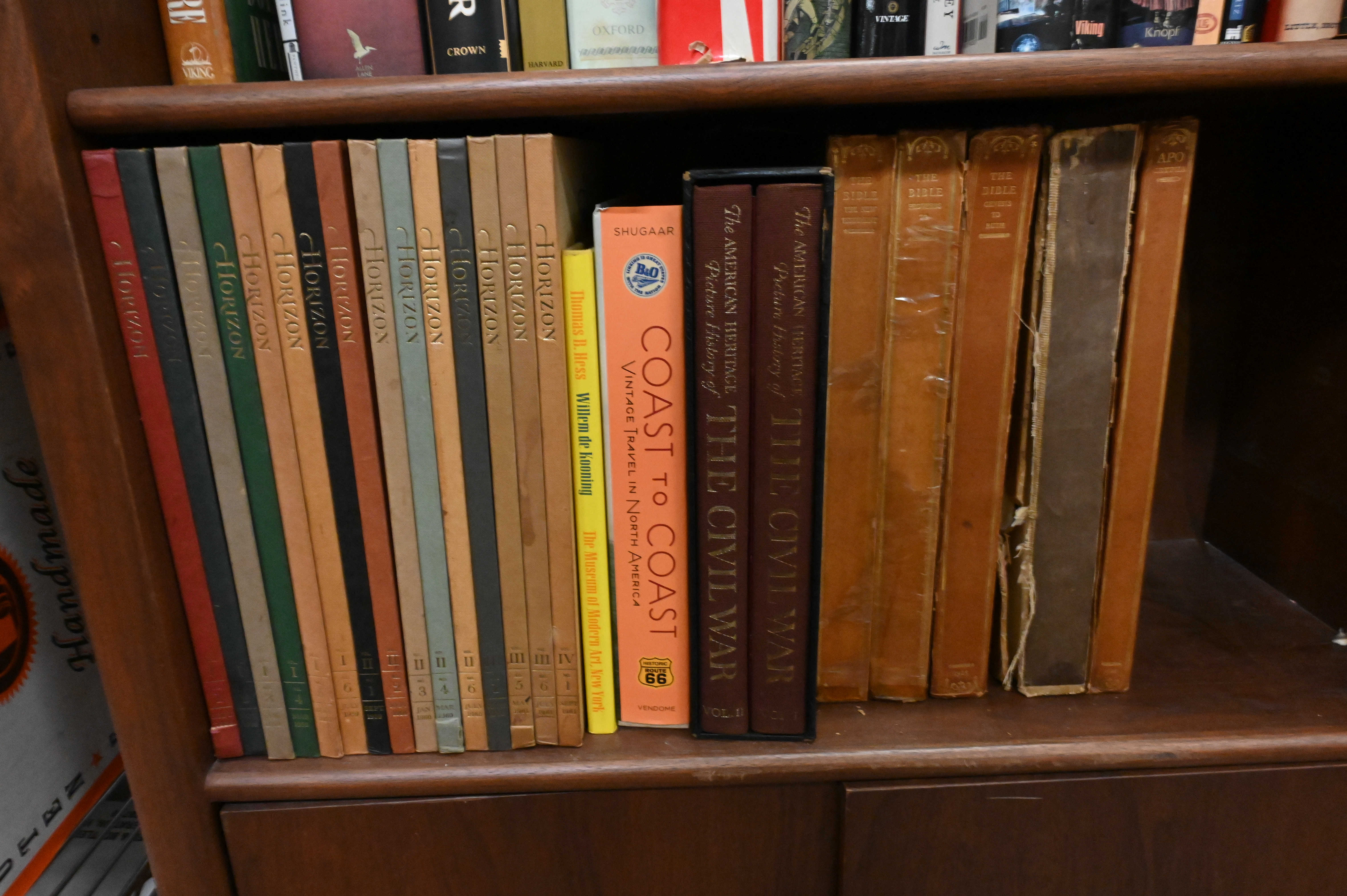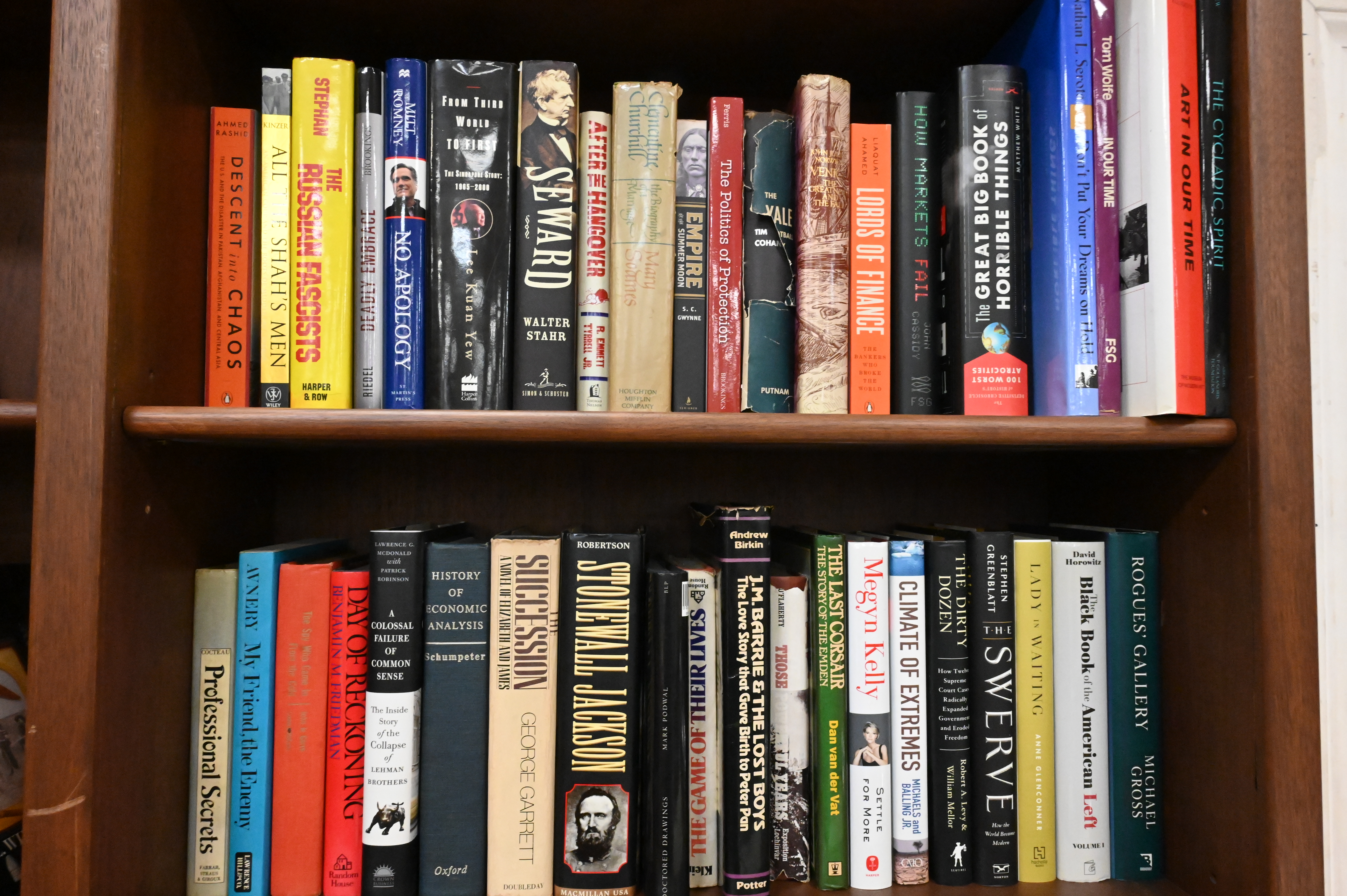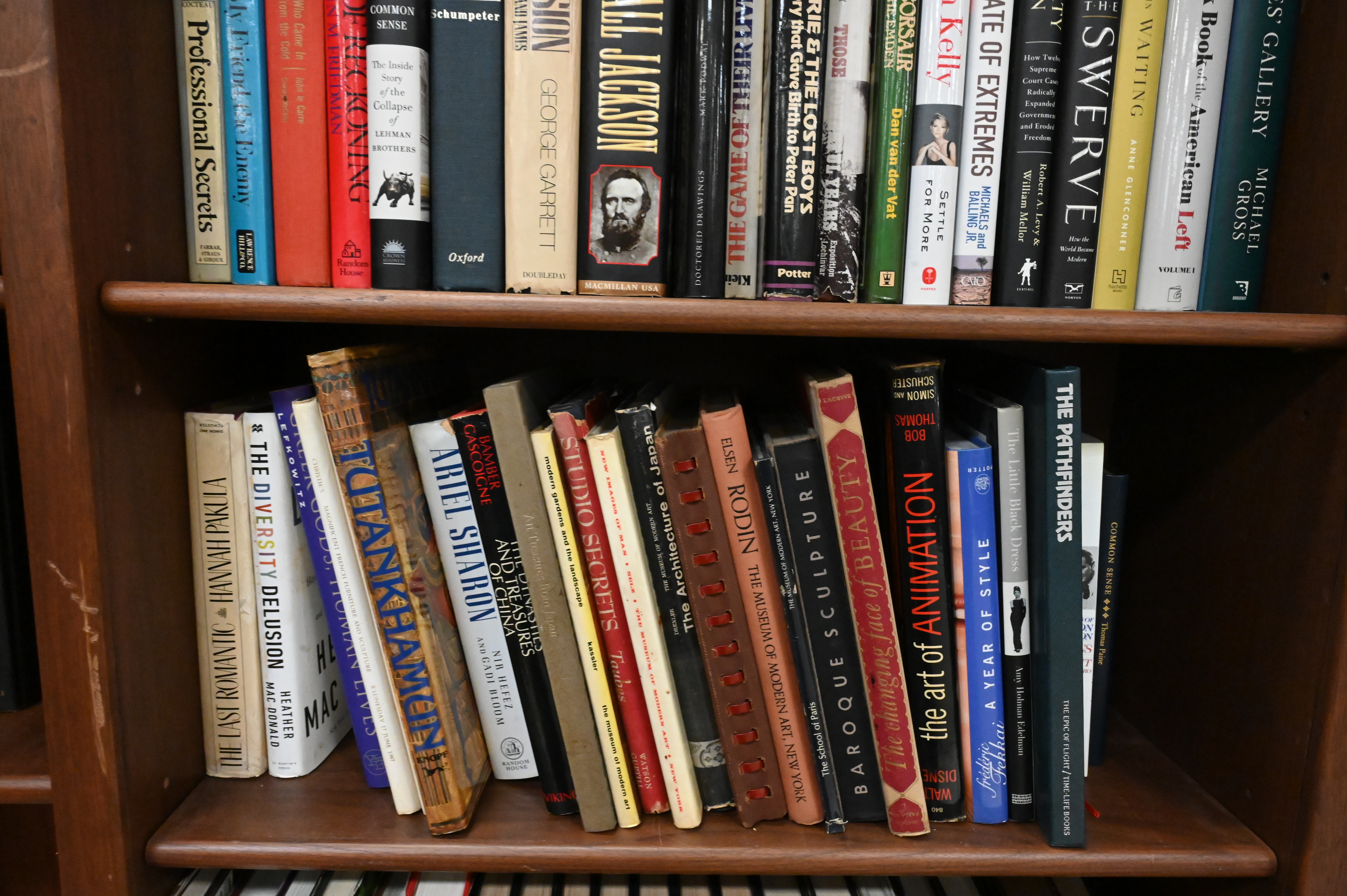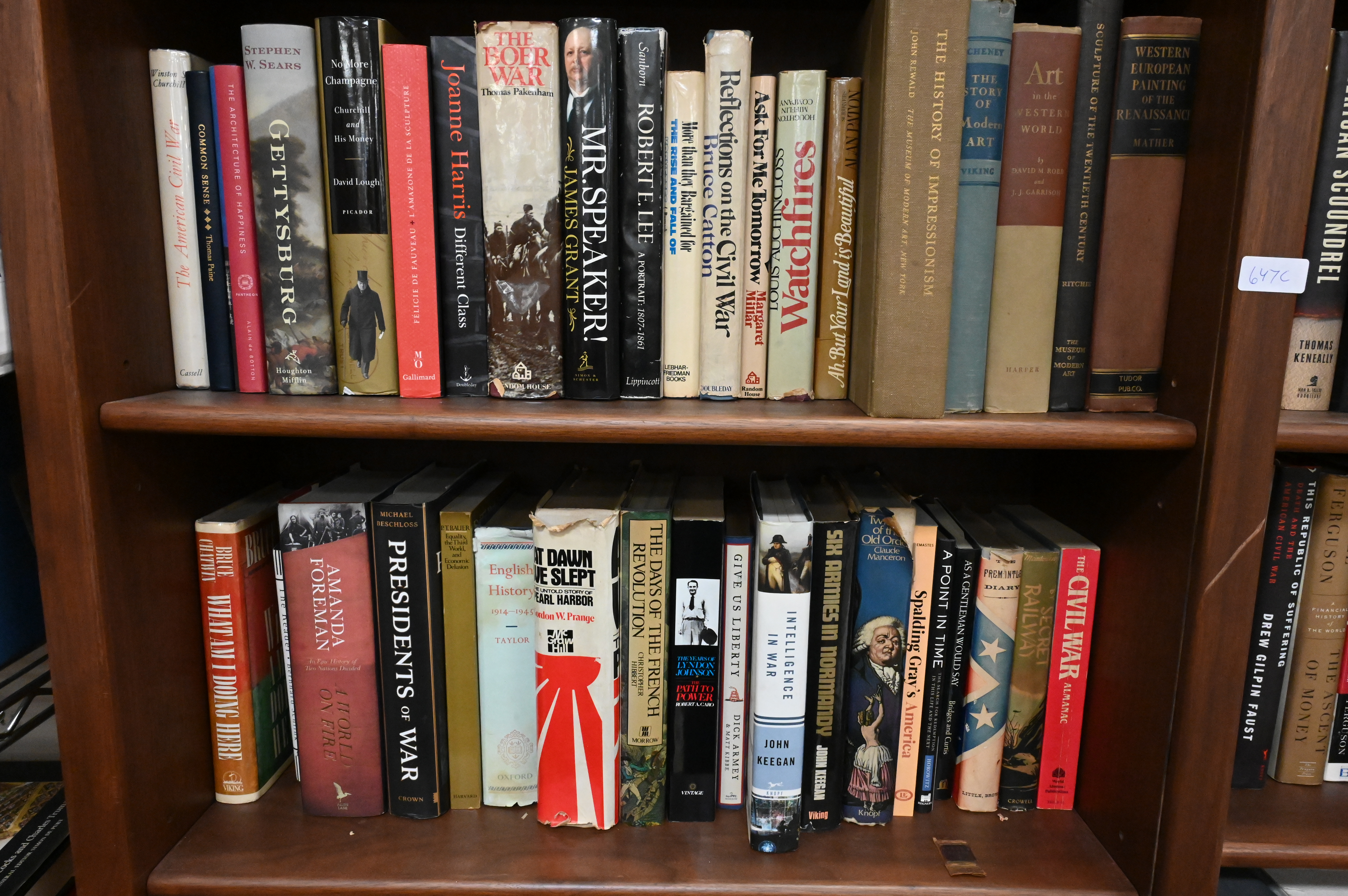 Extensive and diverse grouping of hardbound and softcover volumes spanning American, European, and world history; political biography; military history; economics; cultural criticism; and the arts. Titles observed include works on U.S. presidents and presidential history, World War I and II, Cold War politics, European history, philosophy, economics, and social commentary, with authors and subjects ranging from classical history to modern political analysis. Includes a mixture of trade editions, scholarly works, and illustrated reference books, housed on shelving and in box lots as found. Overall condition varies from good to worn, with some volumes showing edge wear, dust jacket loss, or handling consistent with library or personal use.