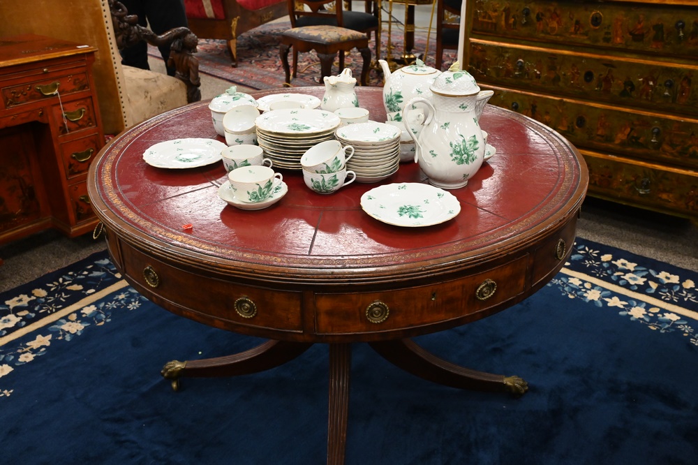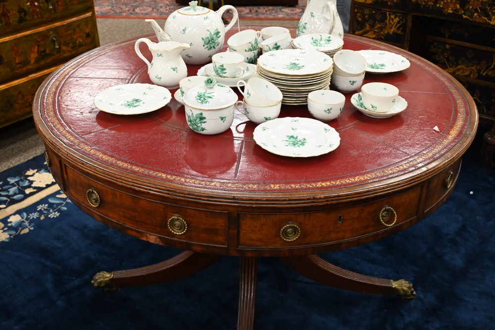 Lot 649: George IV Mahogany Drum Table, having inset leather tip, four drawers, revolving top on pedestal, set on four downswept members endi…