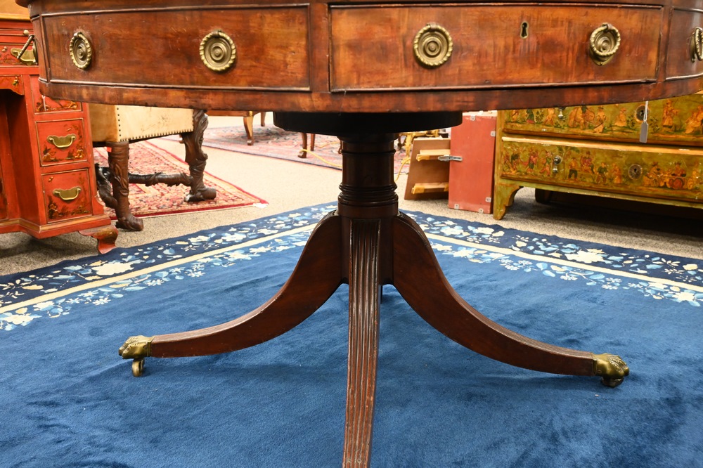 George IV Mahogany Drum Table, having inset leather tip, four drawers, revolving top on pedestal, set on four downswept members ending in brass paw feet, early 19th century, height 30 inches, diameter 44 1/2 inches, (one leg repaired, leather surface with wear)