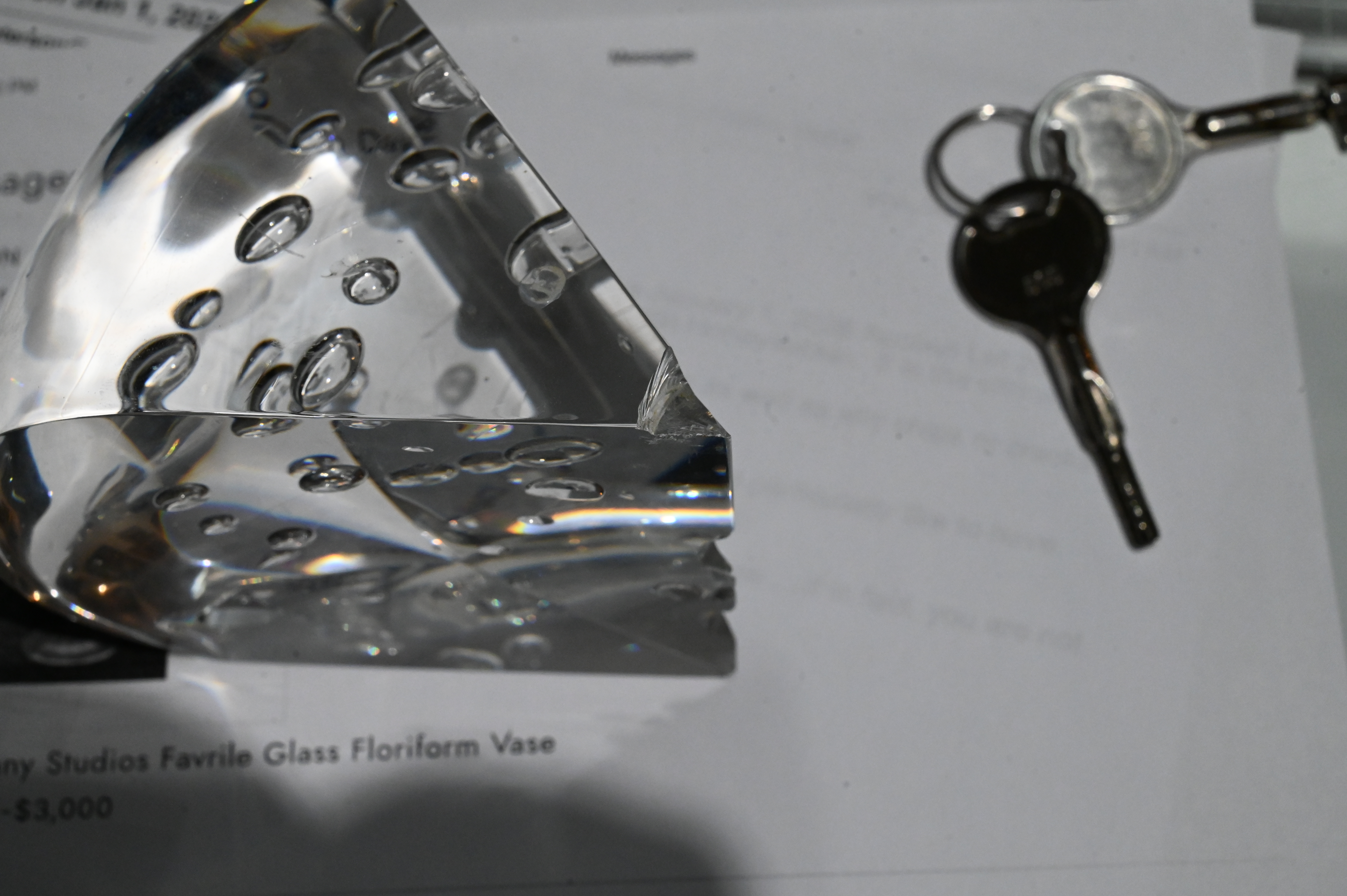 Lot 649: James Houston for Steuben 18K Gold and Crystal “Mouse & Cheese” Paperweight
