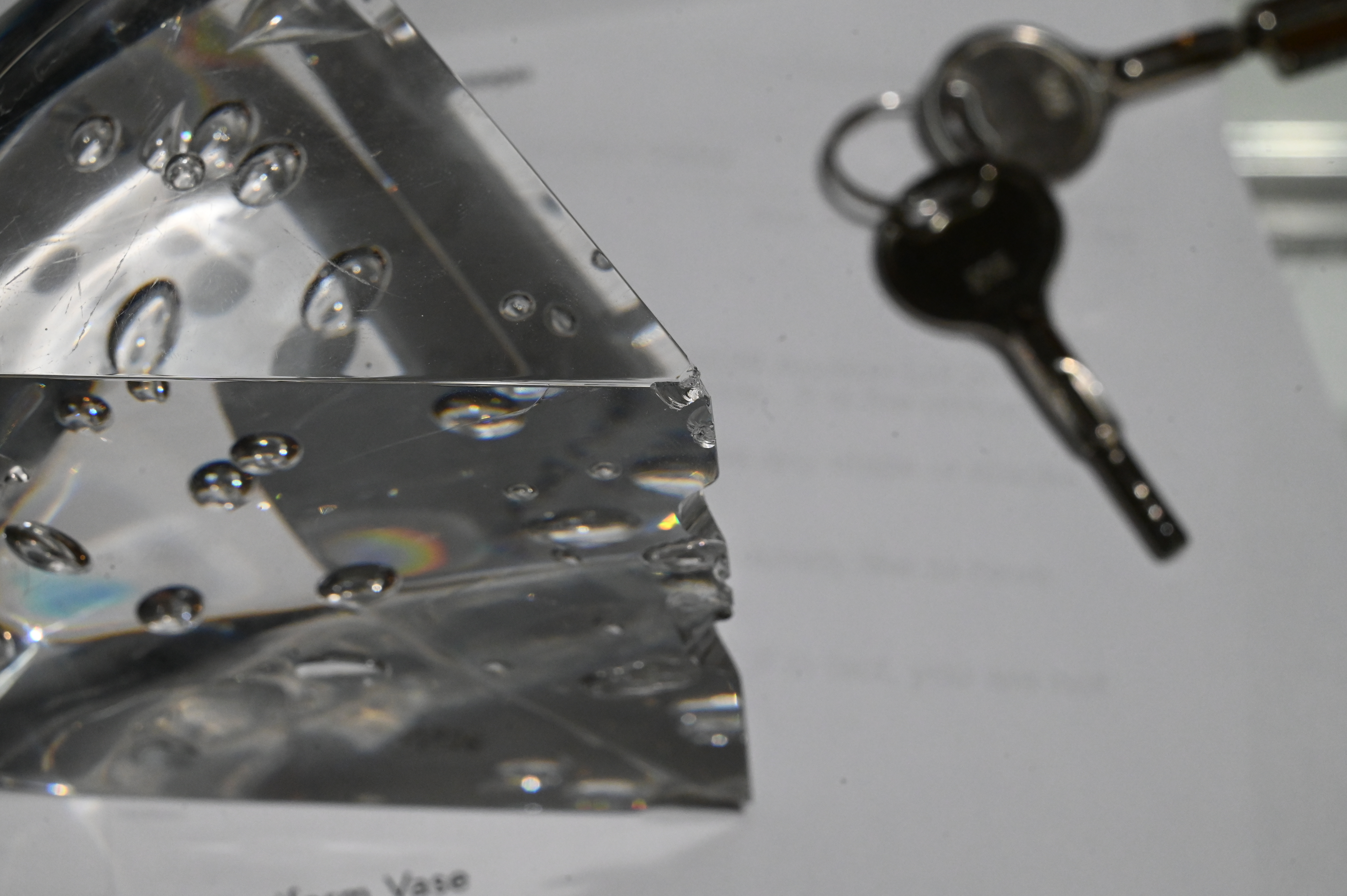 the clear Steuben crystal modeled as a wedge of cheese with controlled bubble decoration, surmounted by a finely textured 18k yellow gold mouse, signed on tail “18K.”