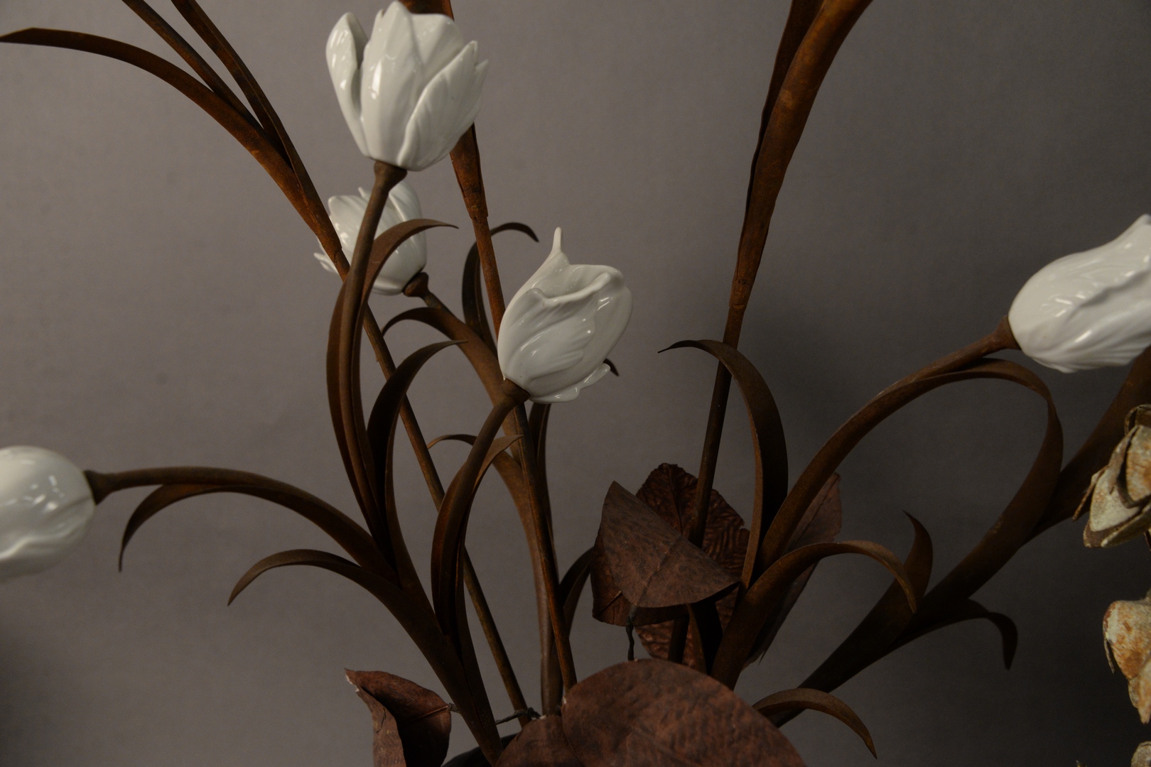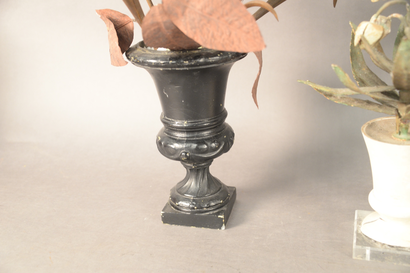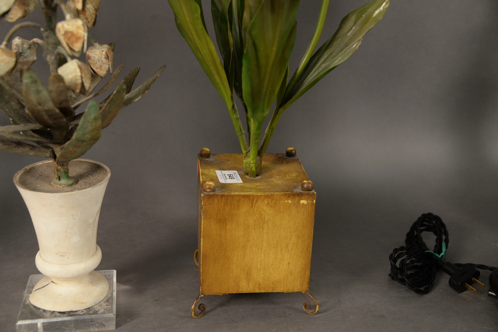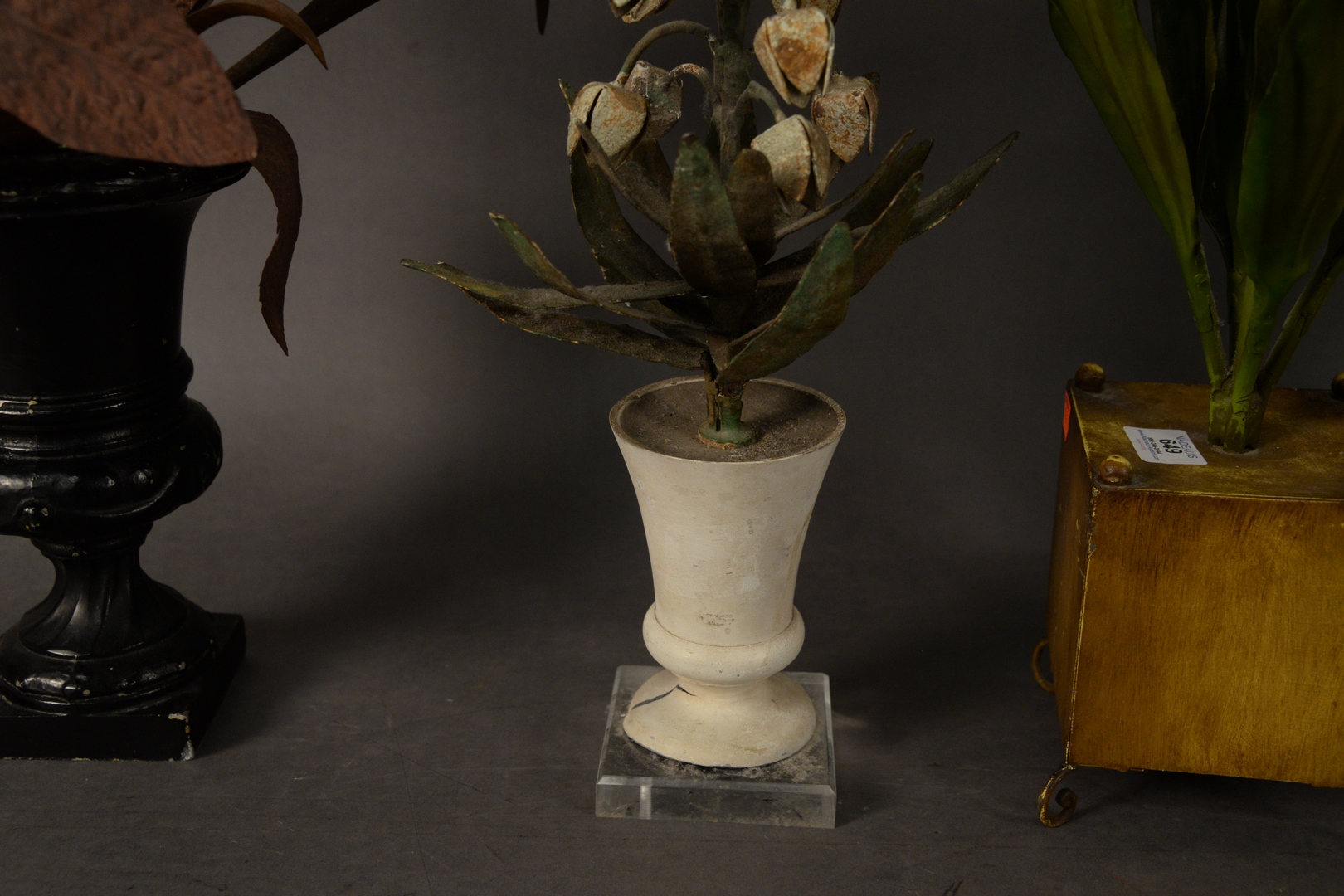 Lot 649: Three Piece Group of Painted Tole and Flowers, to include arrangement with tole flowers and one with porcelain flowers along with o…