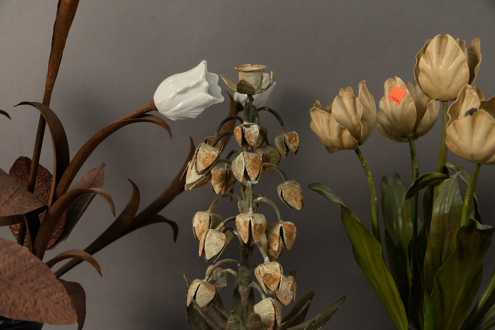 Three Piece Group of Painted Tole and Flowers, to include arrangement with tole flowers and one with porcelain flowers along with one candlestick mounted on a lucite base, height of tallest 26 inches.