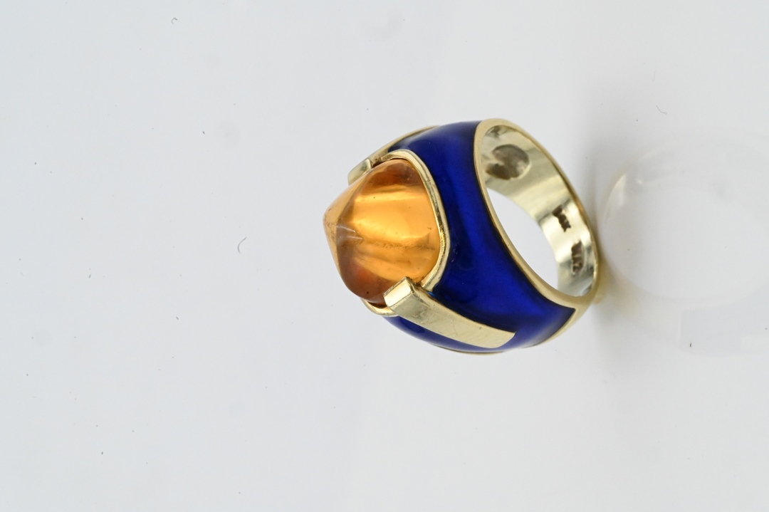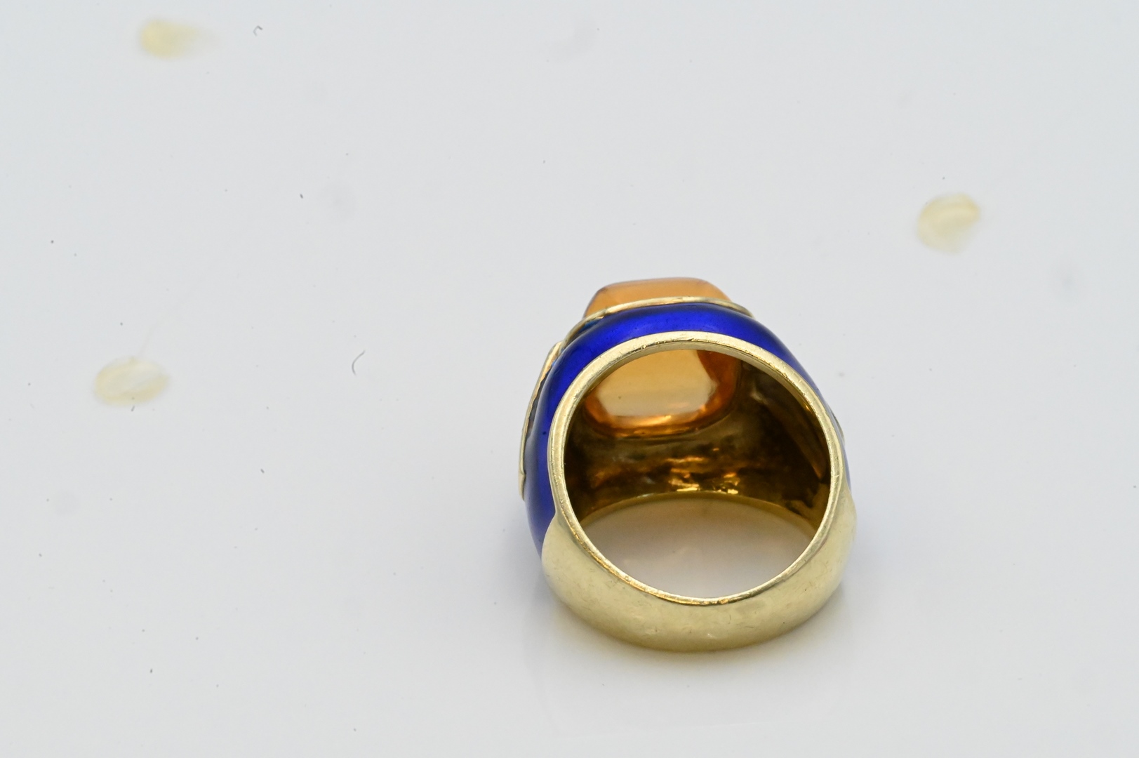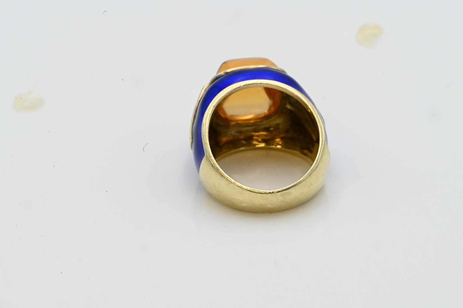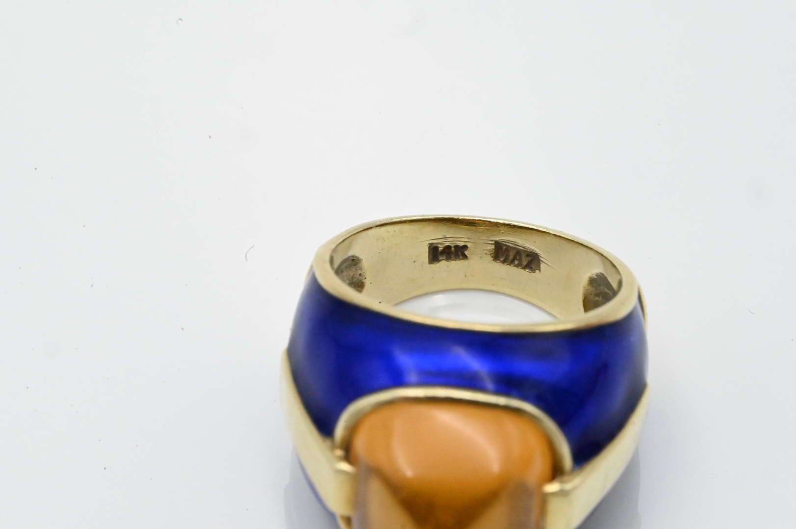 Maz 14 Karat Yellow Gold Ring set with large yellow citrines and blue enameling marked maz 14K size 7 1/2, total weight 14.8 grams Condition: good condition