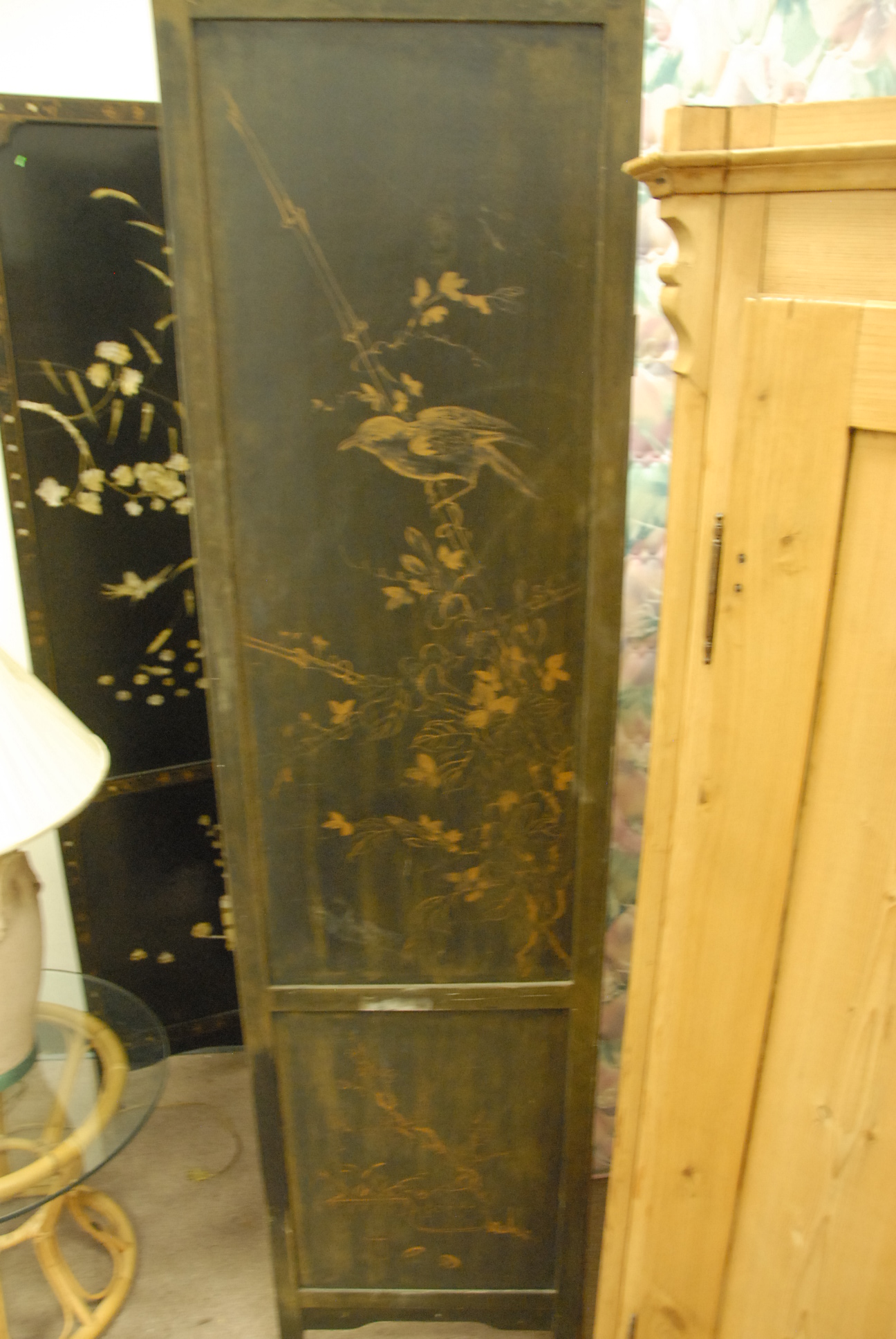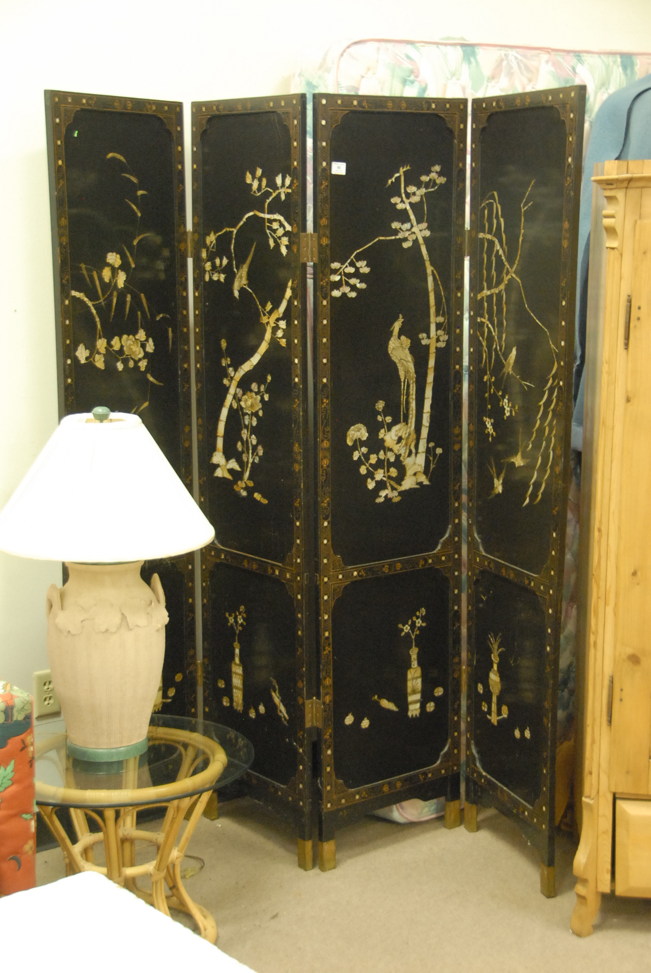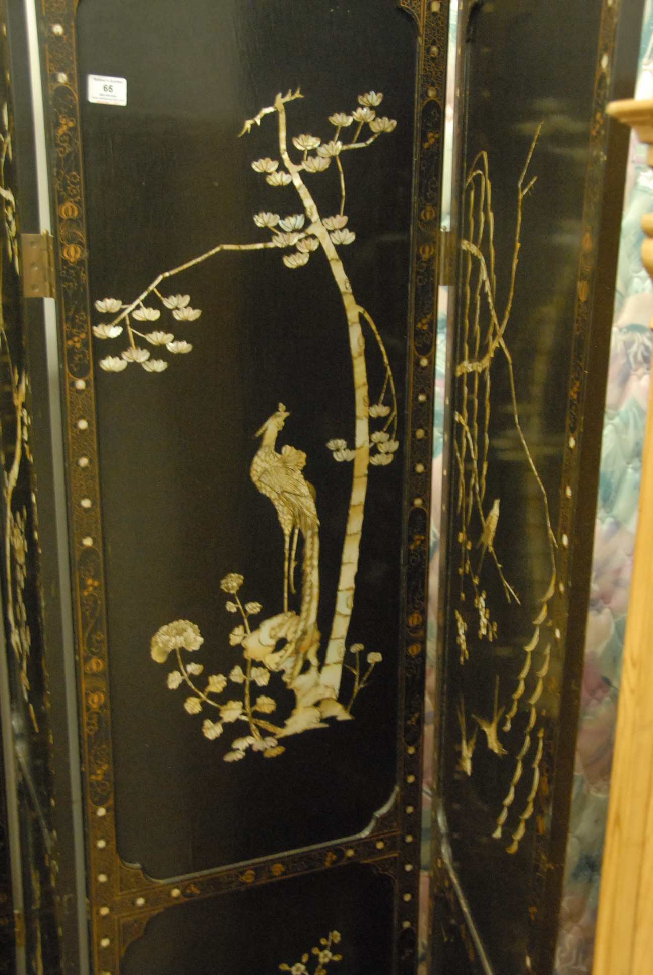 Lot 65: Four fold Oriental screen with mother of pearl inlay, ht. 72in., each panel 18in.