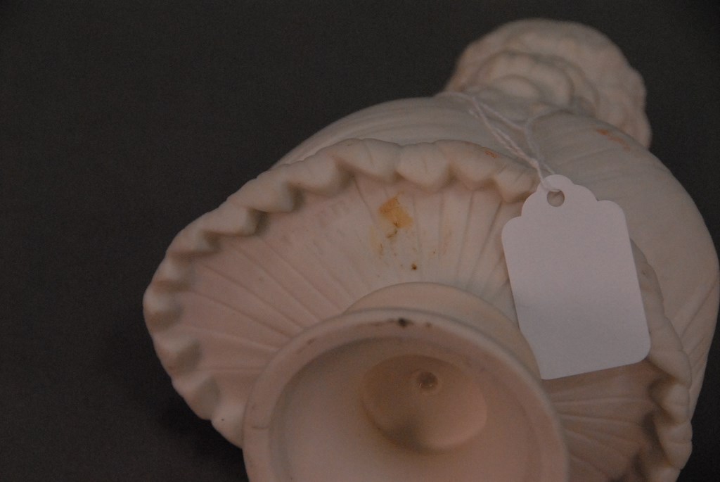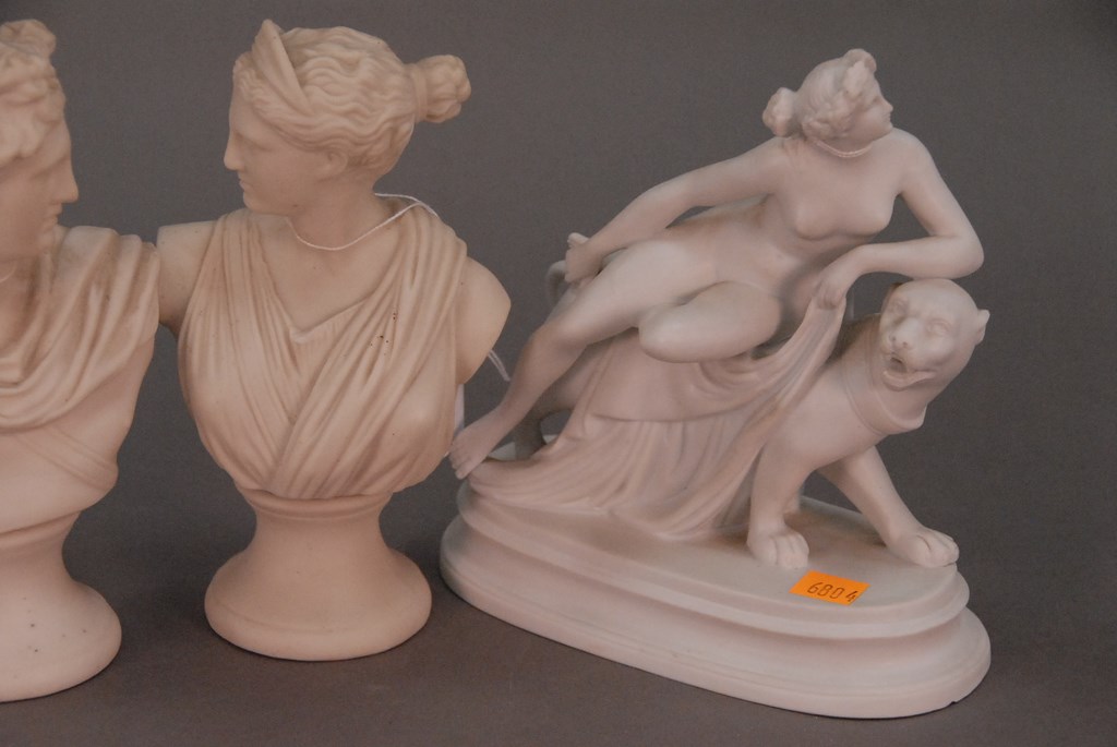 Four piece lot: three Parian busts and Parian figure of nude woman on cat, tallest 8 1/2.