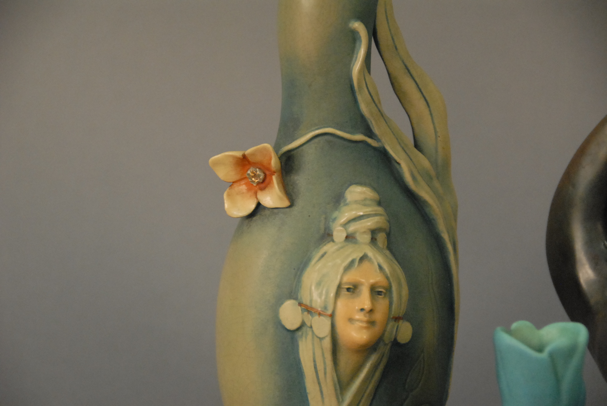 Lot 65: Four piece lot to include Bernard Block art nouveau Nymph vase ht. 12in., Amphora handled vase ht. 11 1/2in., and pair of Van Briggl…