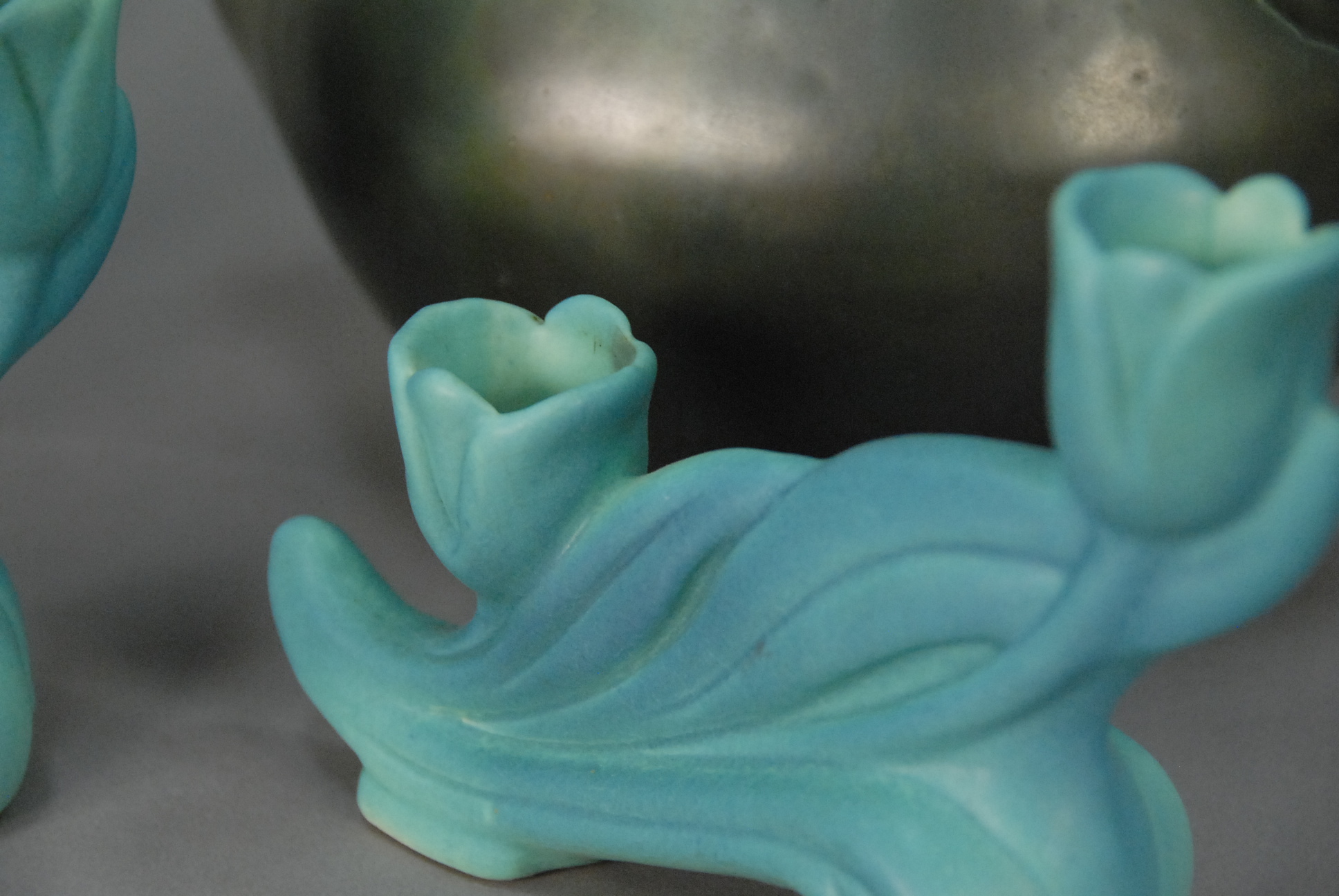 Four piece lot to include Bernard Block art nouveau Nymph vase ht. 12in., Amphora handled vase ht. 11 1/2in., and pair of Van Briggle candle holders ht. 5in.