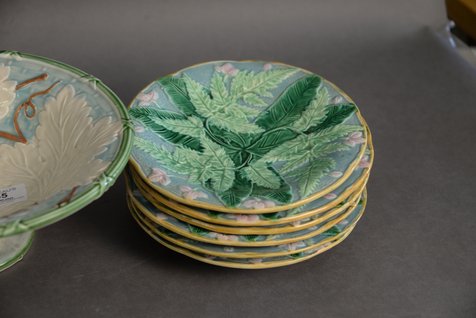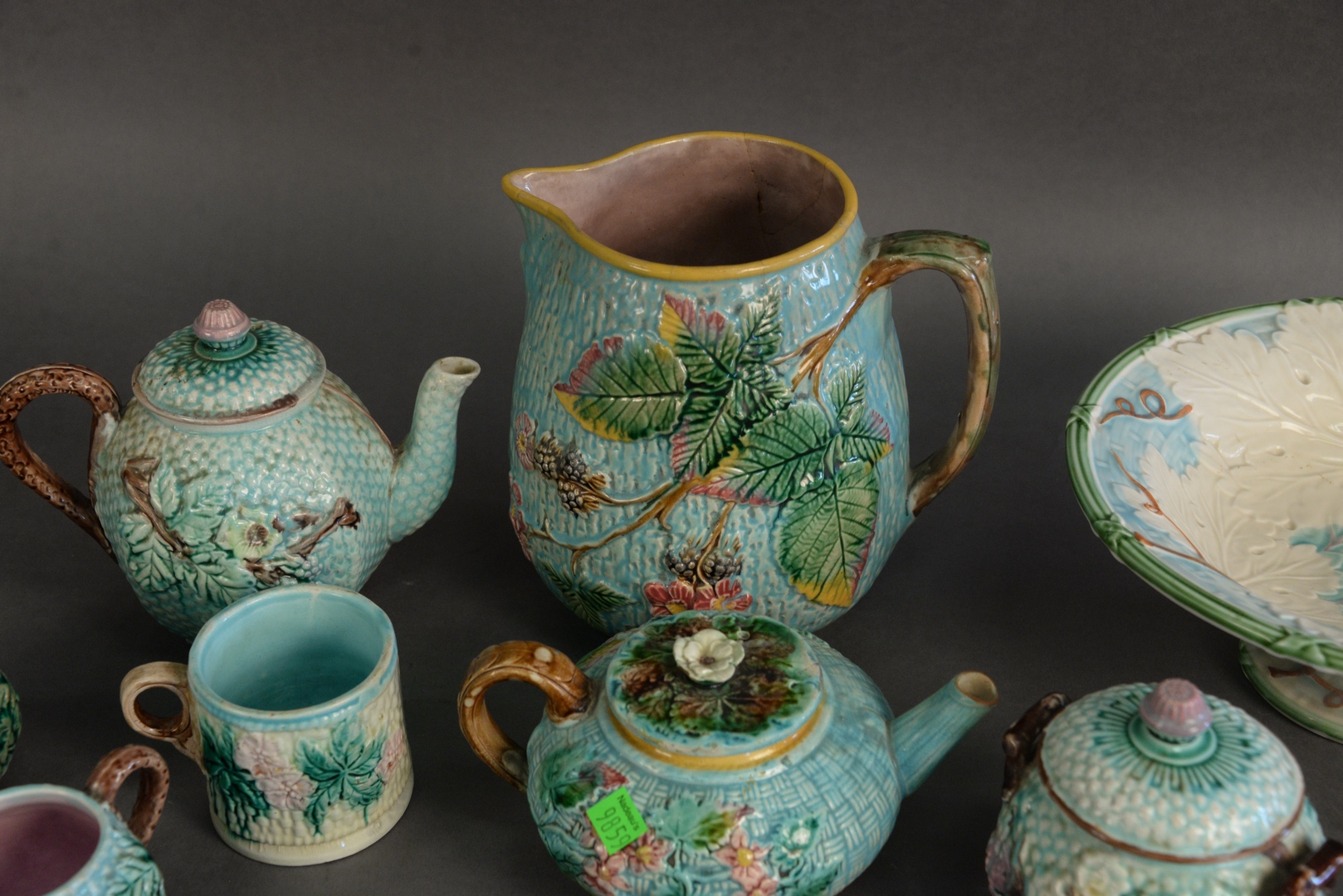 Fourteen Piece Lot of Majolica to include a set of six blue plates with green leaves and pink flowers; a blue and white leaf compote; two covered sugar bowls; one teapot; one coffee pot; one creamer; one mug; along with a large pitcher, height 8 1/2 inches.