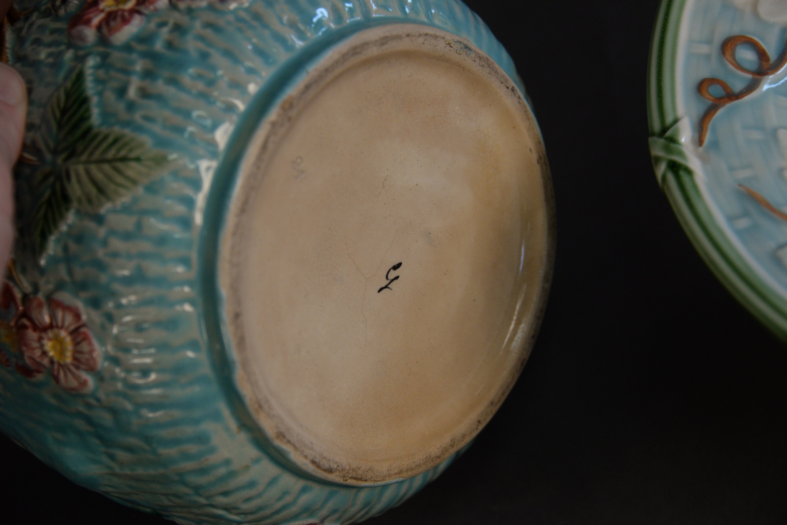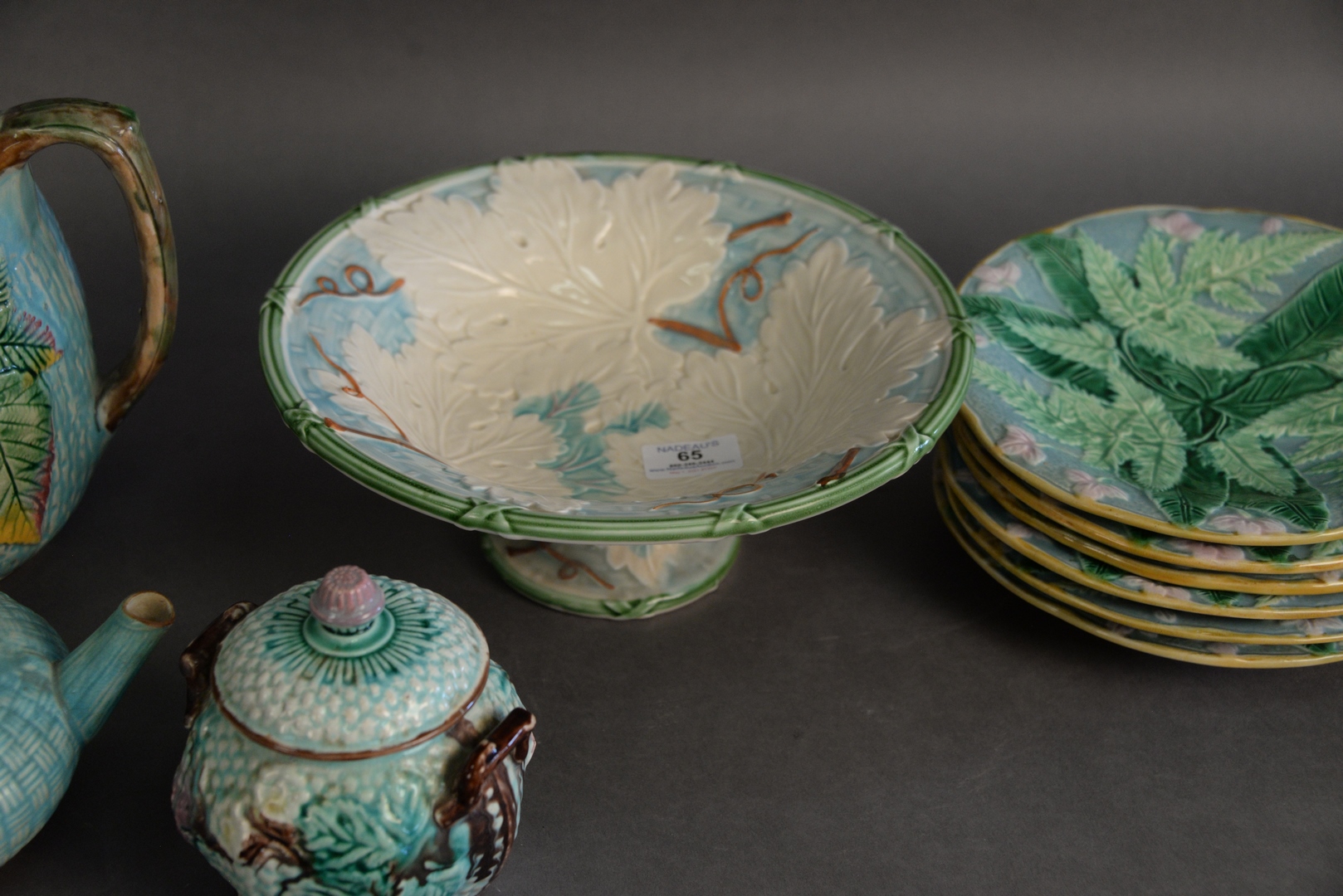 Lot 65: Fourteen Piece Lot of Majolica to include a set of six blue plates with green leaves and pink flowers; a blue and white leaf compote; two covered sugar bowls; one teapot; one coffee pot; one creamer; one mug; along with a large pitcher, height 8 1/2
