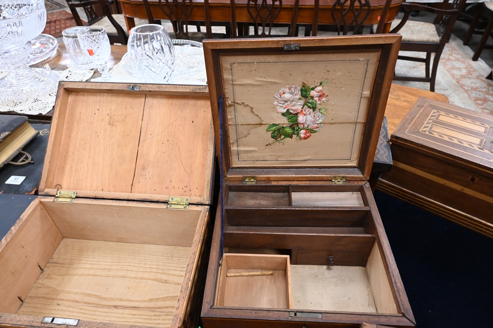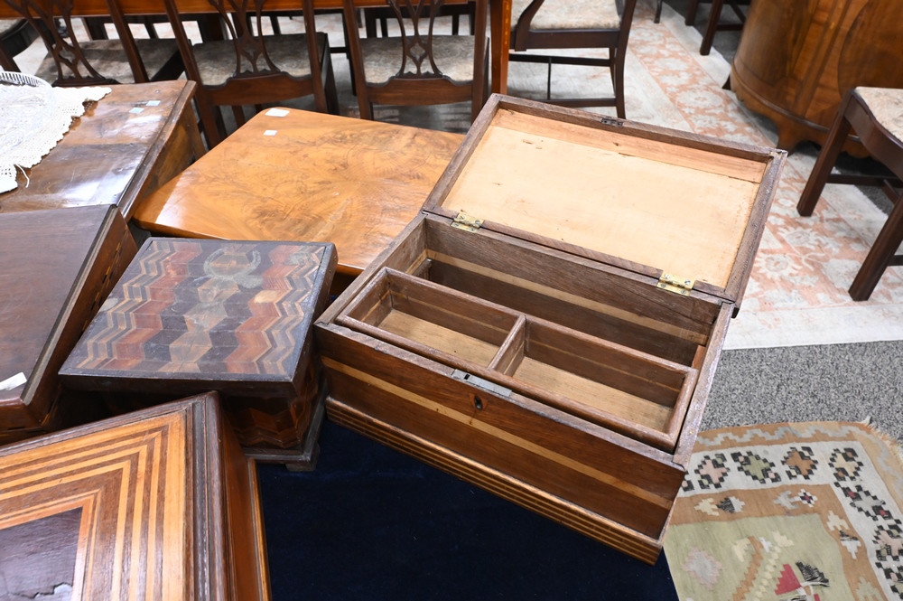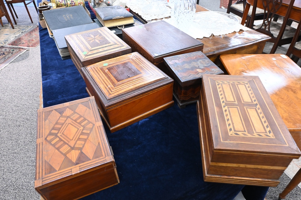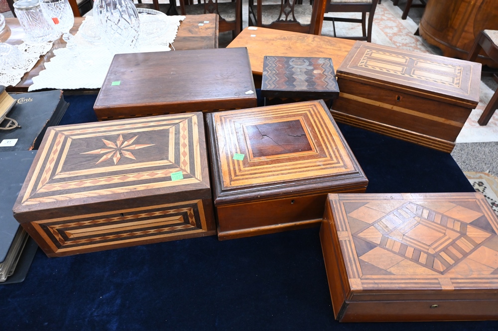 Group of Eight Inlaid Boxes, to include banded and line inlaid, one having inlaid heart, largest height 6 inches, top 10 1/2″ x 15″.