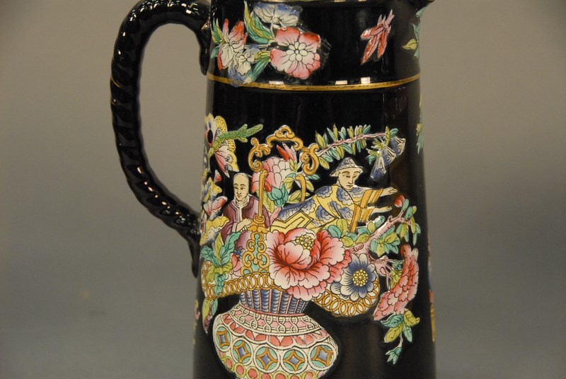 Lot 65: Jackfield Redware glazed jug with enameled Oriental decoration, ht. 8in.