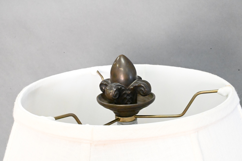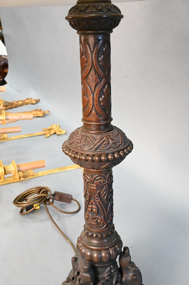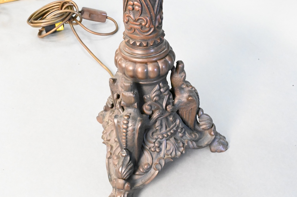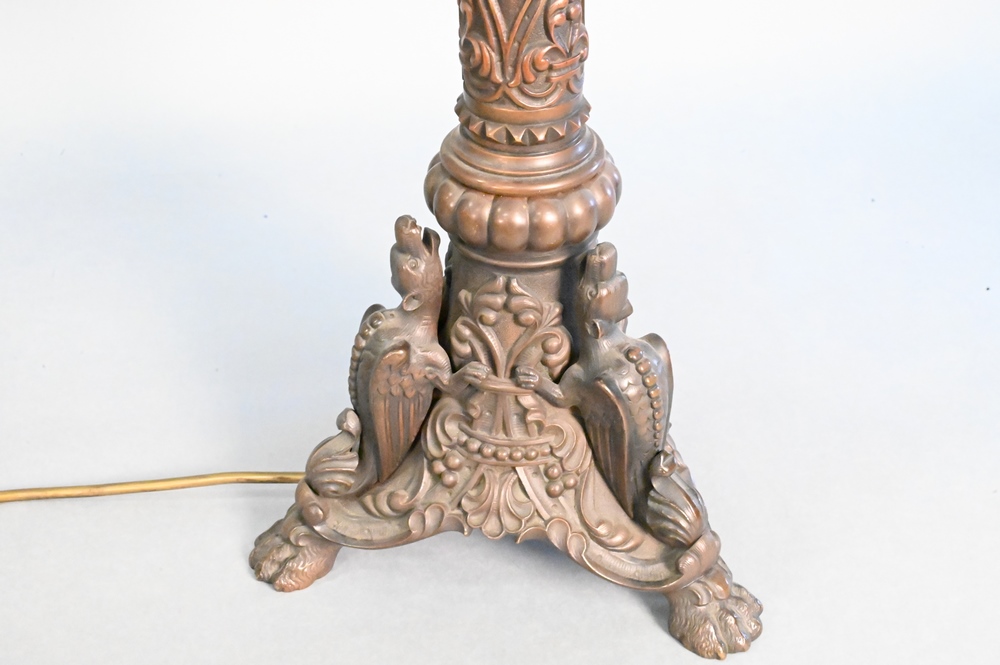 Large Bronze Lamp, having winged griffins on base, on hairy paw feet, height 37 1/2 inches.