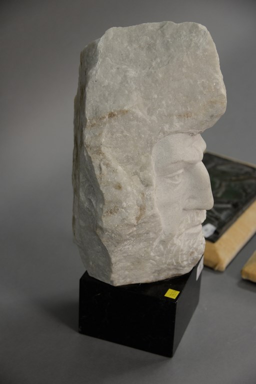 Large carved stone head on marble base initialed R.P., ht. 19 in.