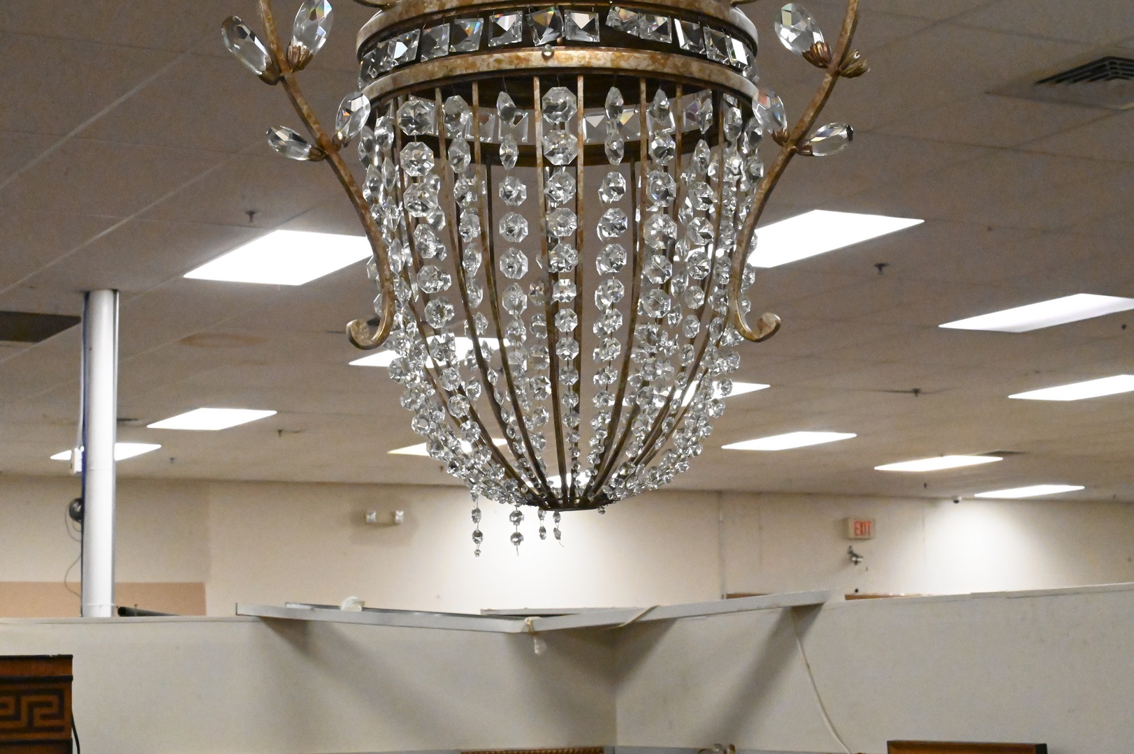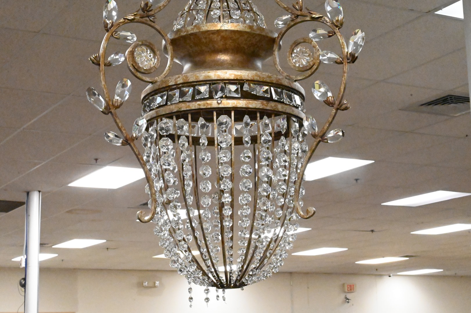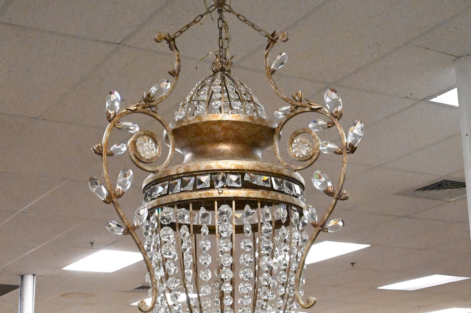 Large Contemporary Chandelier, having three arms over crystal dome, bottom ball missing, approximate height 56 inches, approximate diameter 32 inches.
