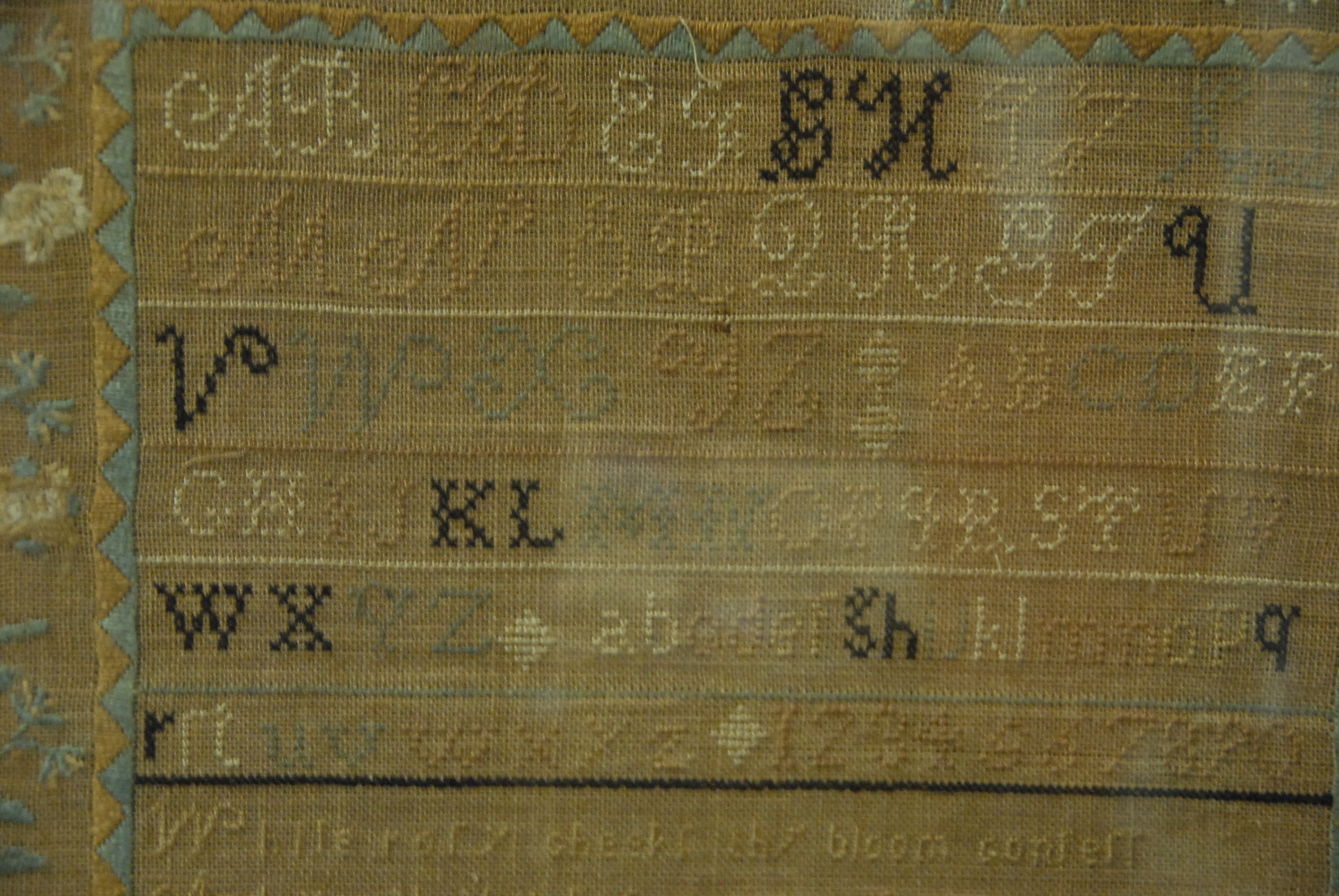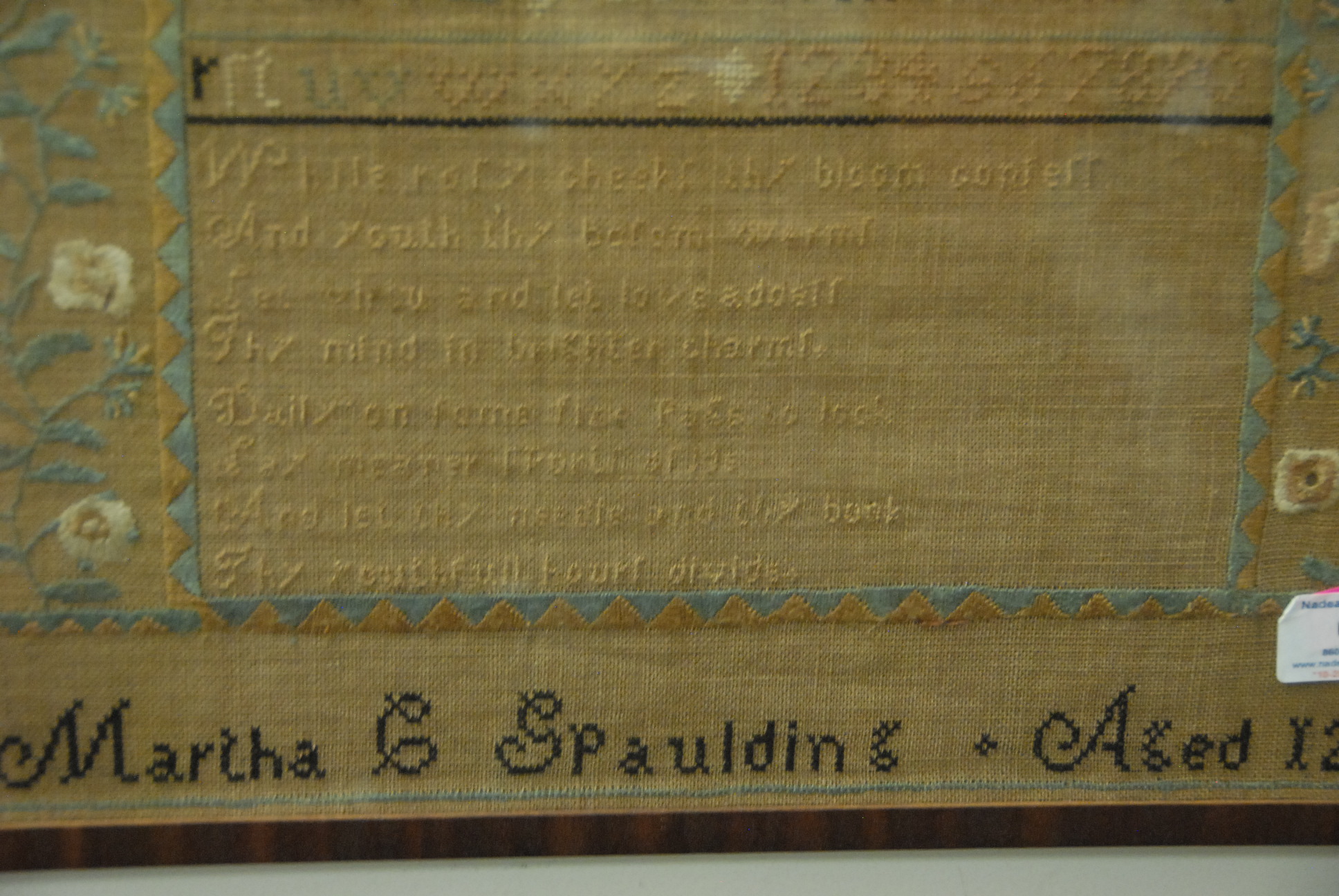 Needlework sampler marked Martha C. Spaulding Aged 12. 17 x 16 1/2