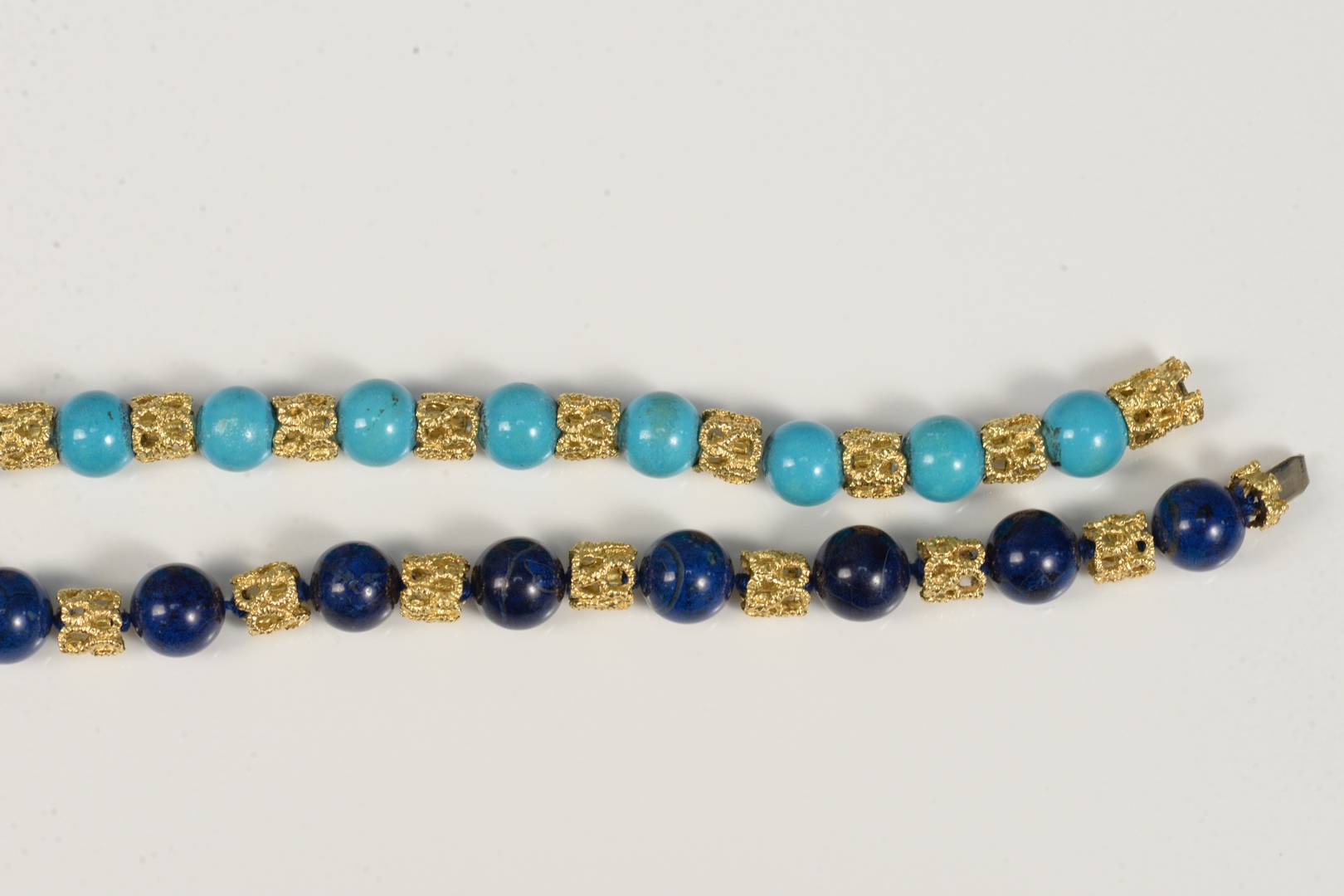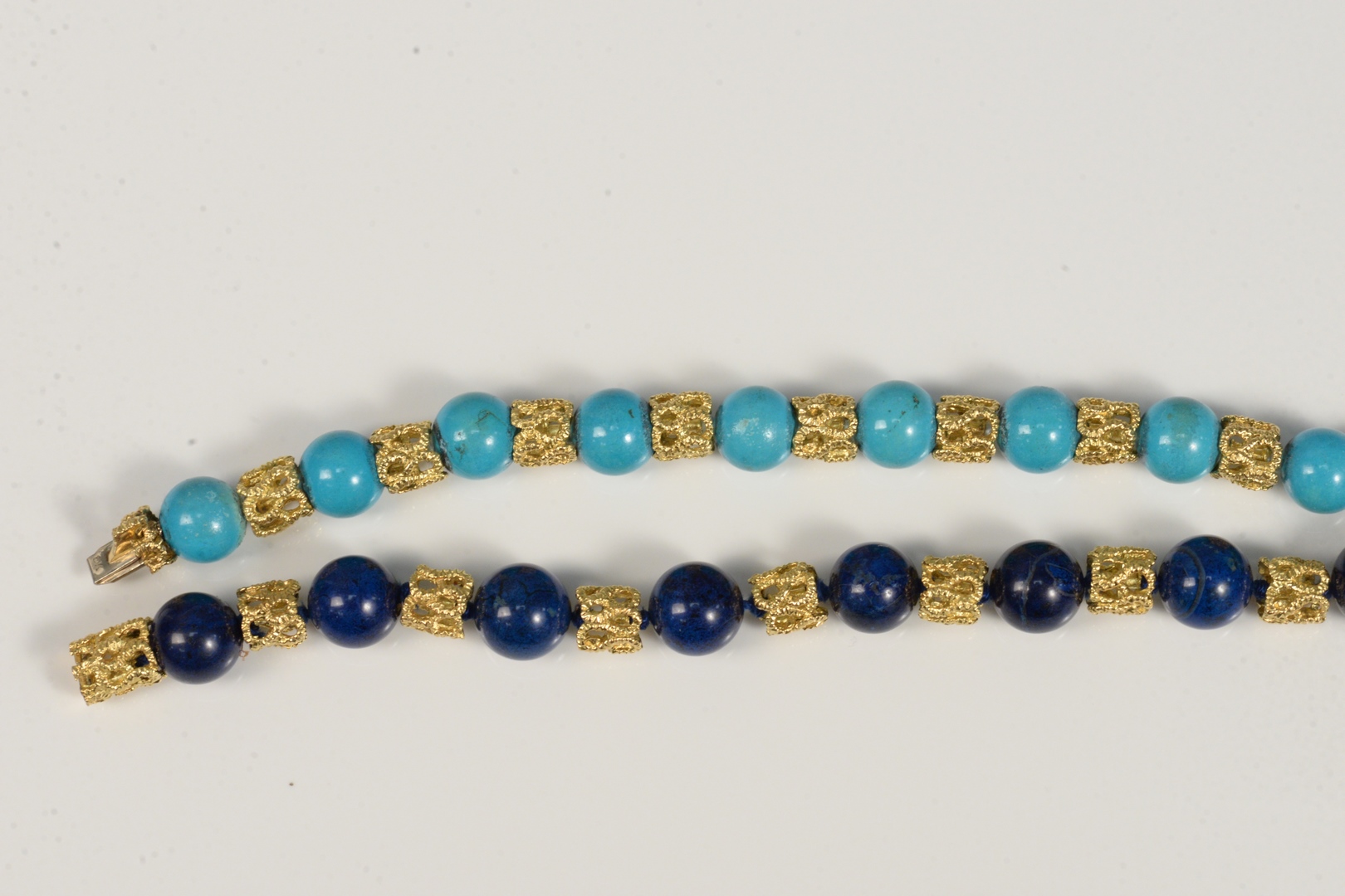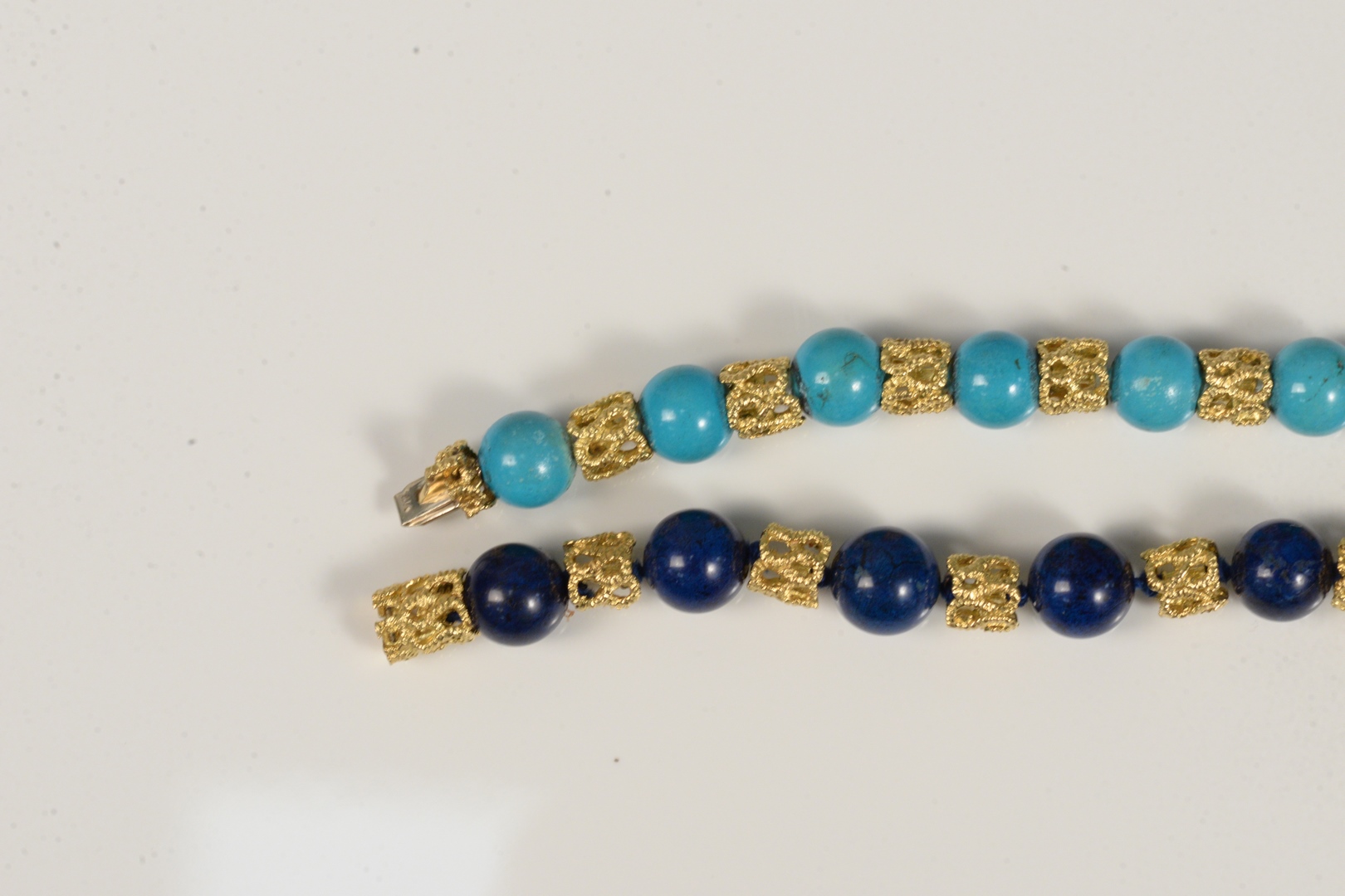 Lot 65: Pair of 18 Karat Gold and Bead Bracelets one with turquoise, one with lapis, each with open work gold spacers length 7 1/2 inches an…