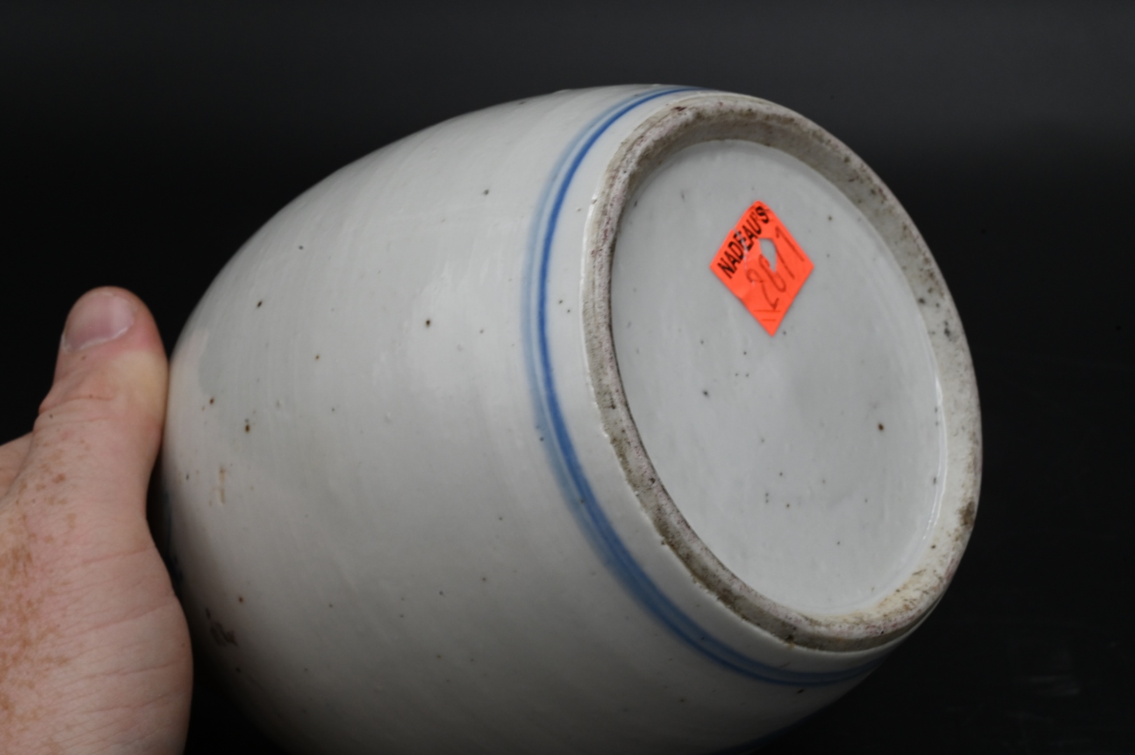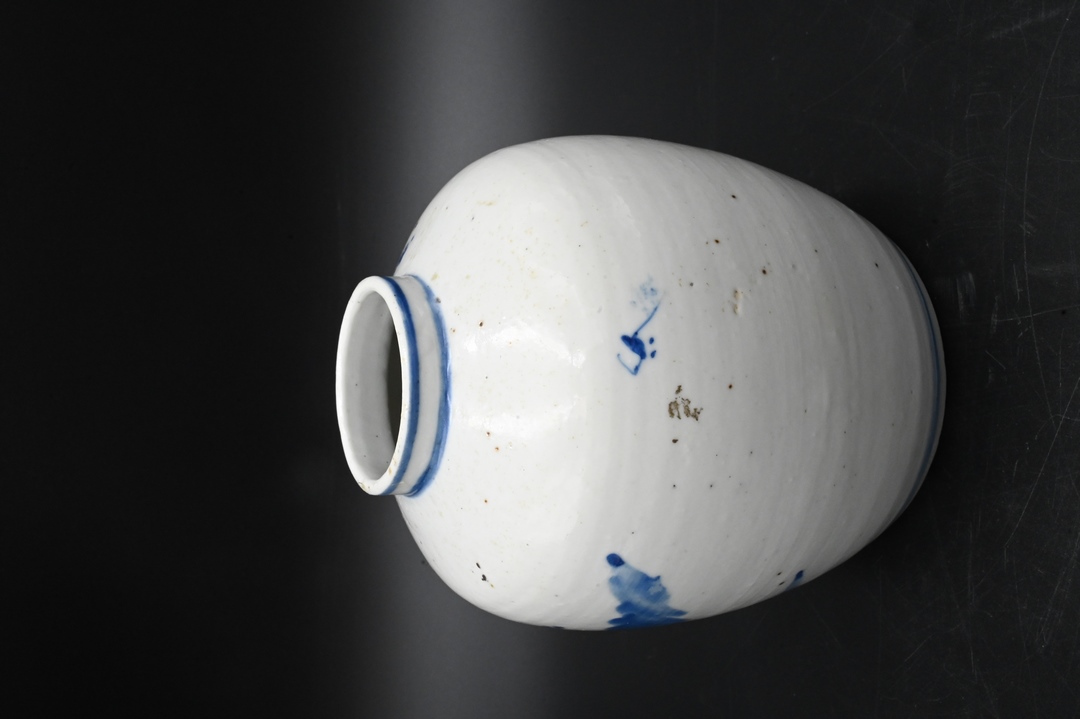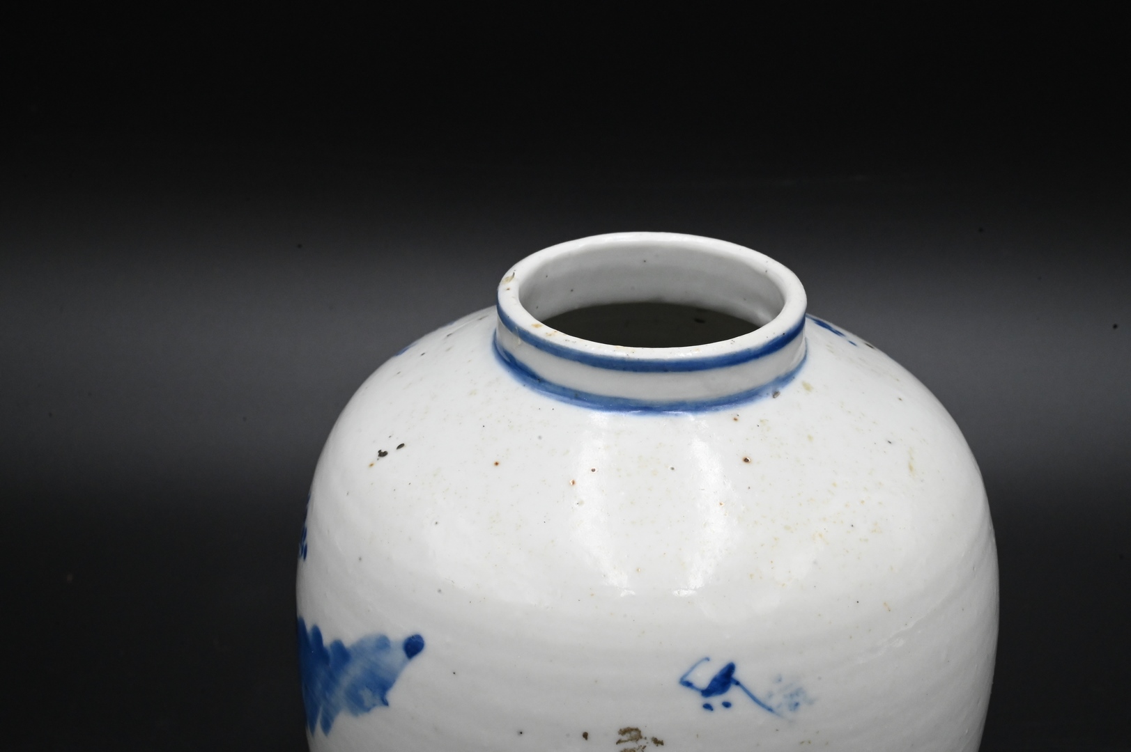 Small Chinese Blue and White Ginger Jar, having painted scholars in a courtyard scene, height 6 inches.