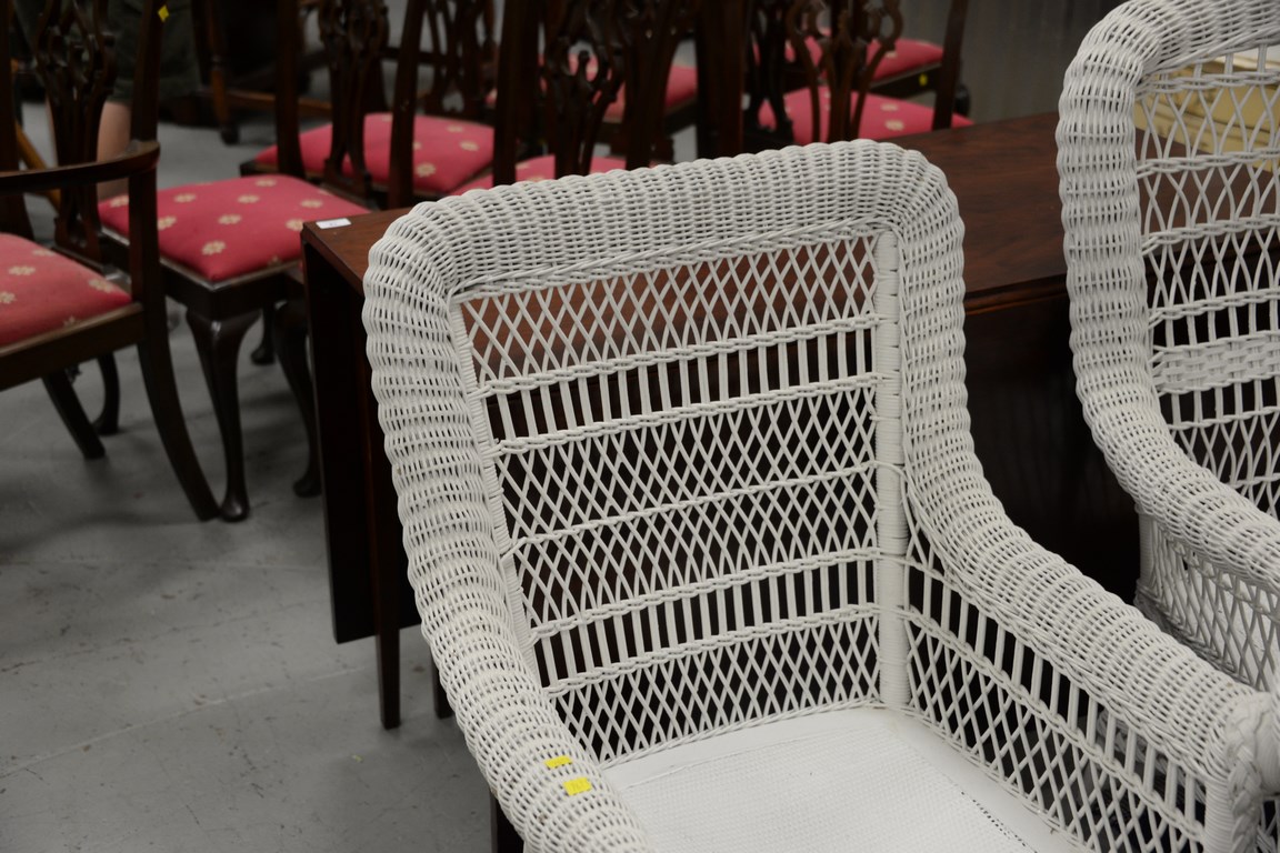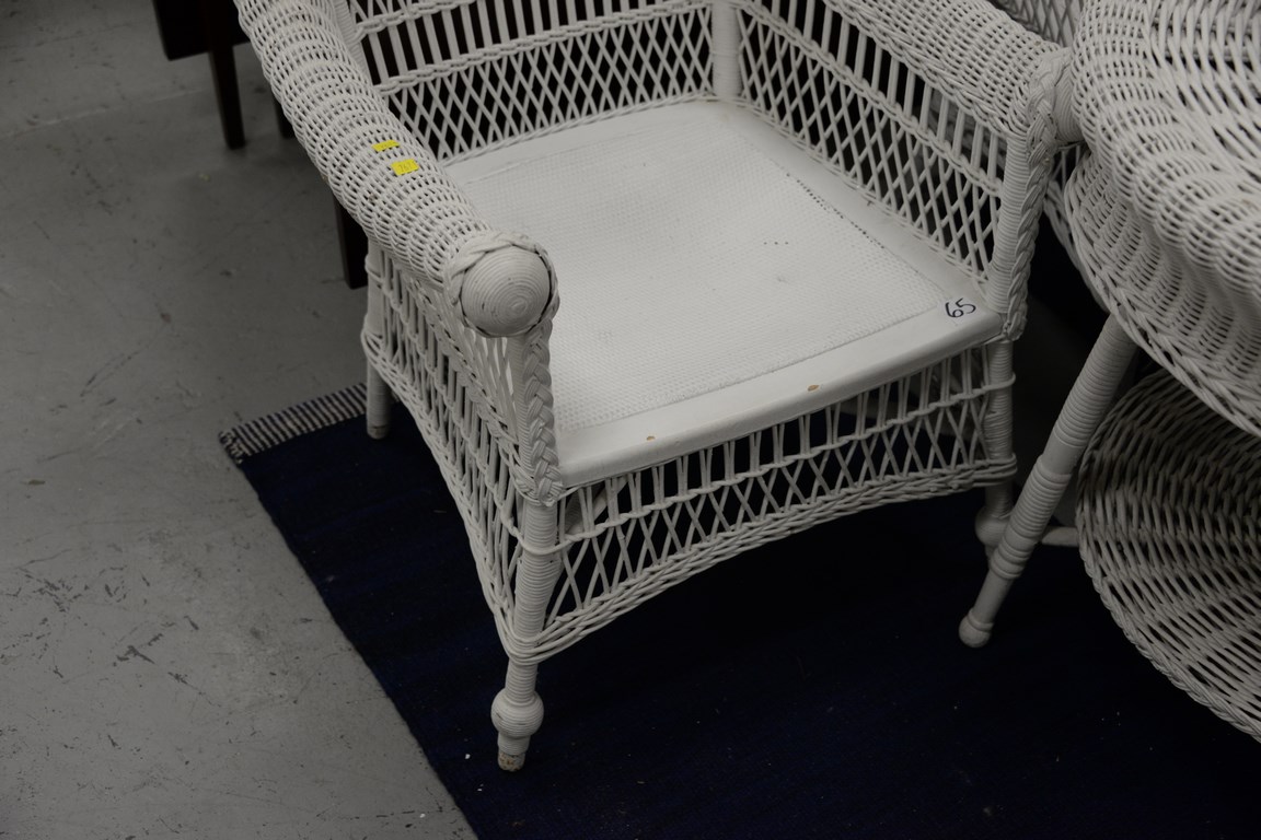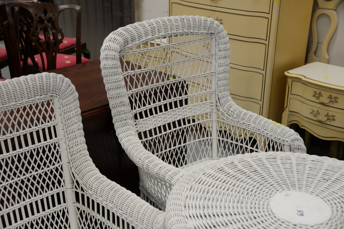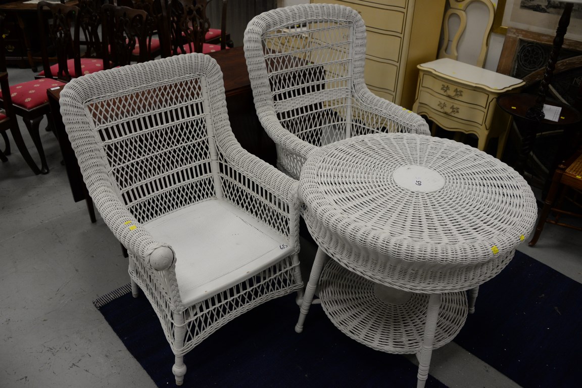Lot 65: Three piece lot including two wicker chairs and round wicker table minor imperfections. table: dia. 31 in.