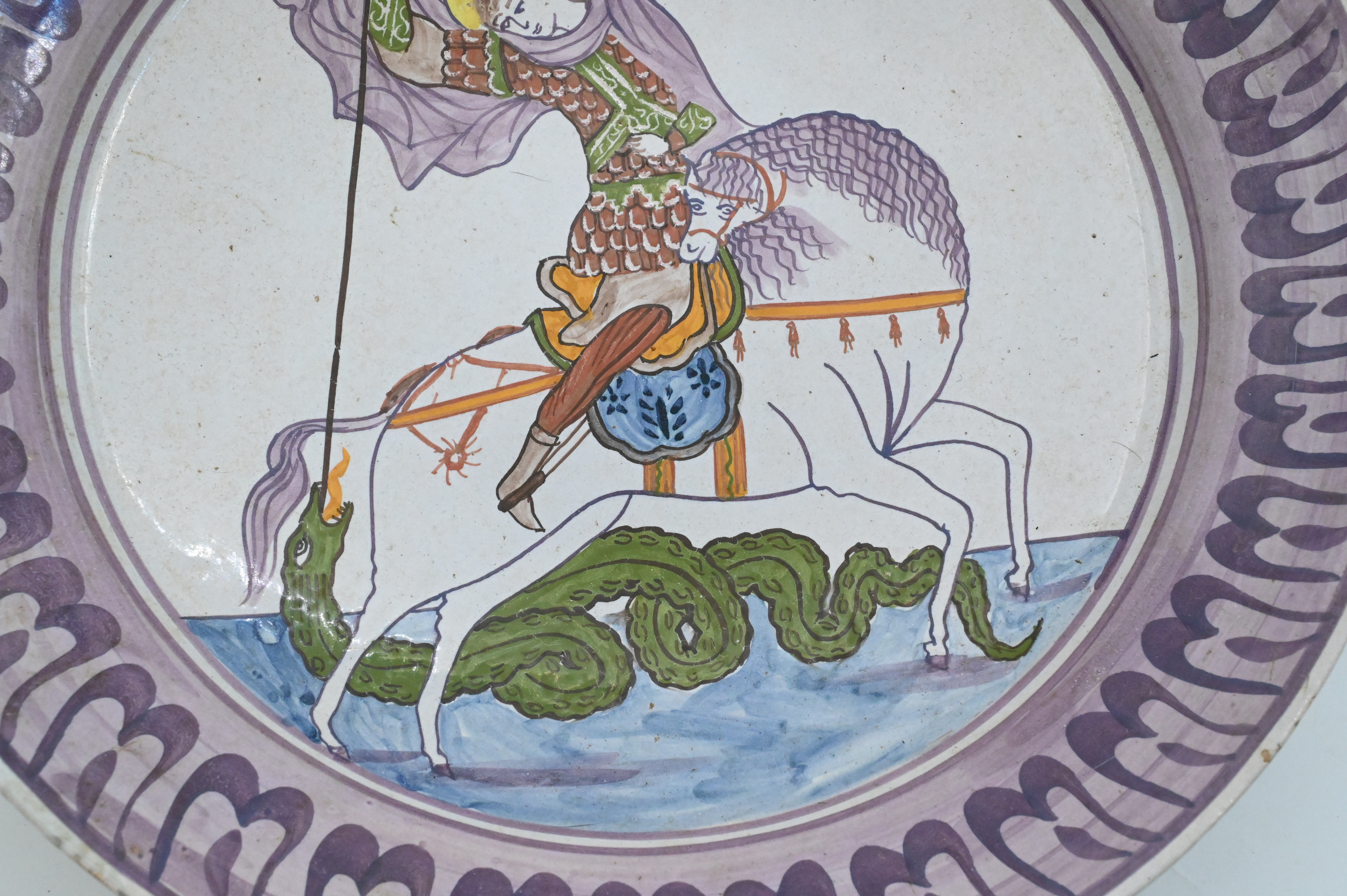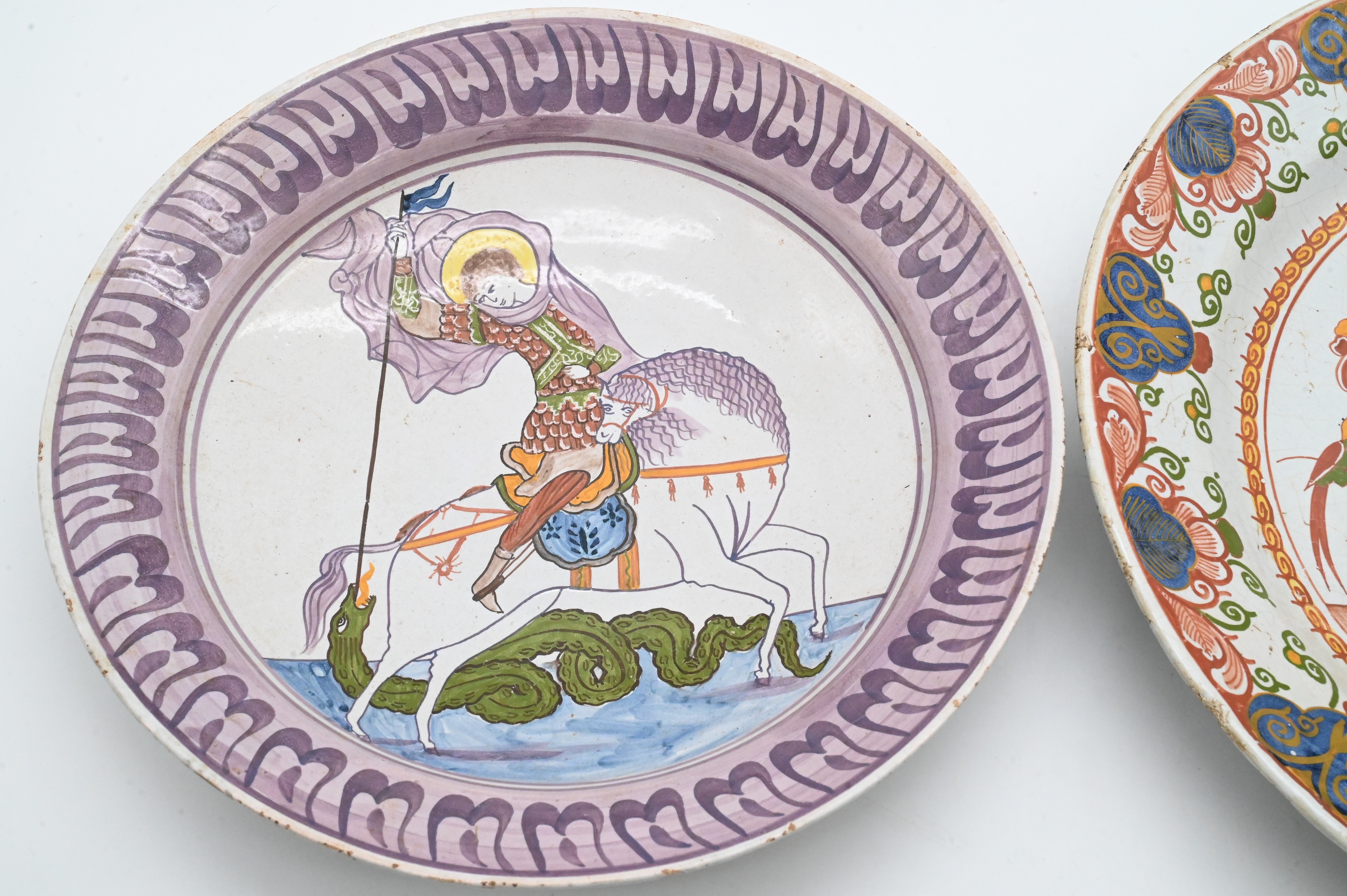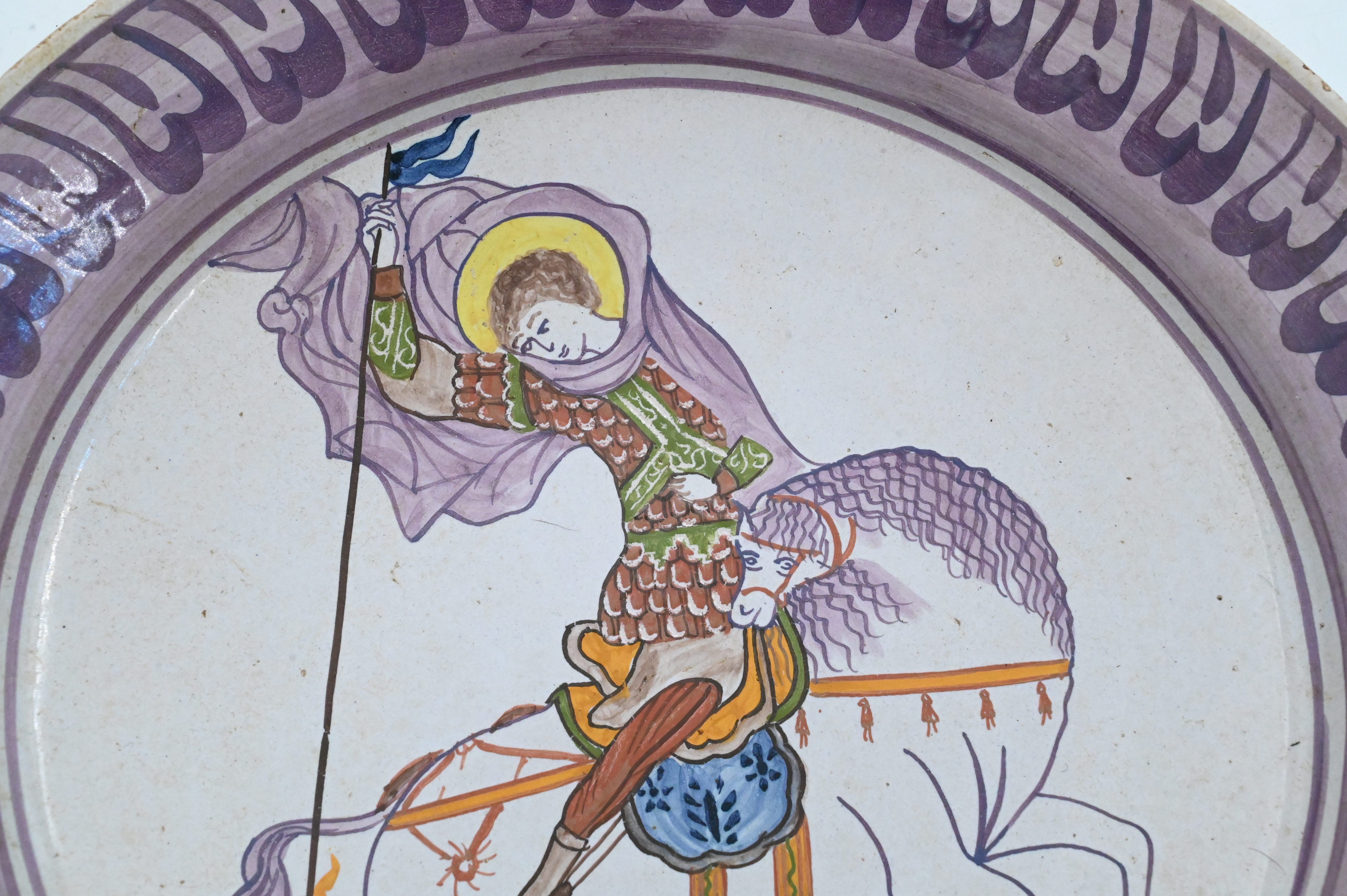 Dutch Delft earthenware deep charger hand-painted with Saint George slaying the dragon in polychrome enamels within a bold stylized border