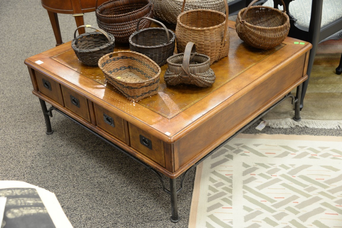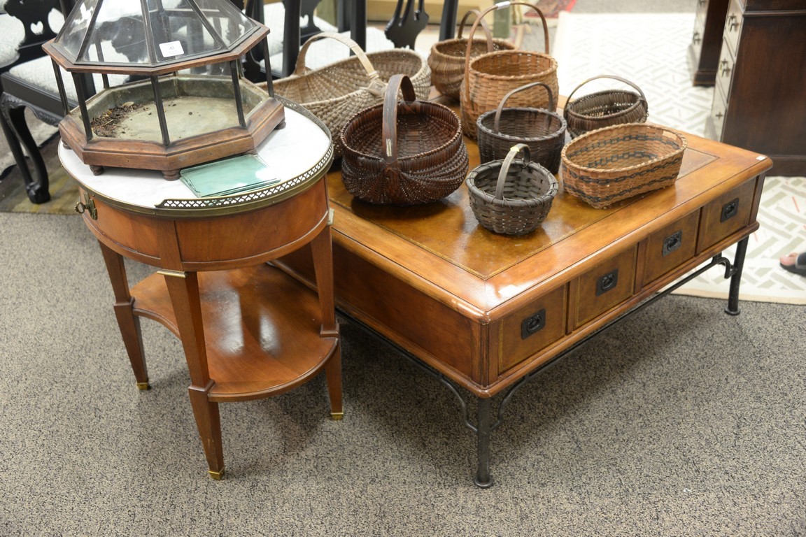 Lot 65: Two piece lot including Grosfeld House oval marble top table ht. 28in., top: 20 x 26 and a leather top coffee table ht. 18in., …