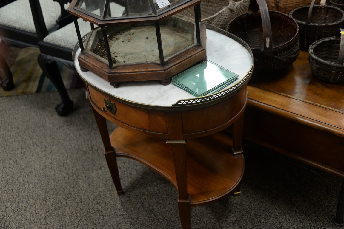 Two piece lot including Grosfeld House oval marble top table ht. 28in., top: 20 x 26 and a leather top coffee table ht. 18in., top: 39 x 39.