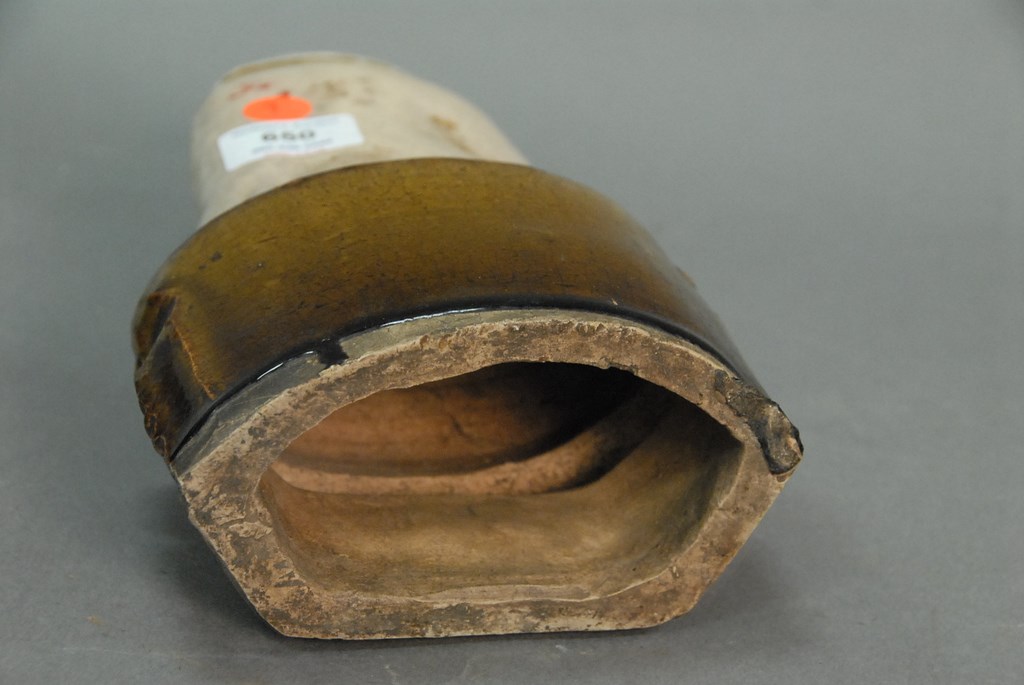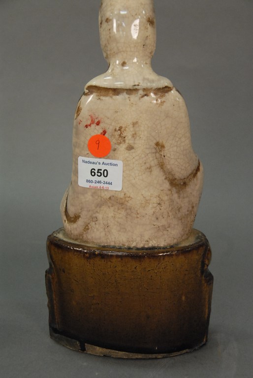 Brown and white glazed Buddha seated on lotus and molded box base. ht. 12 1/2in.