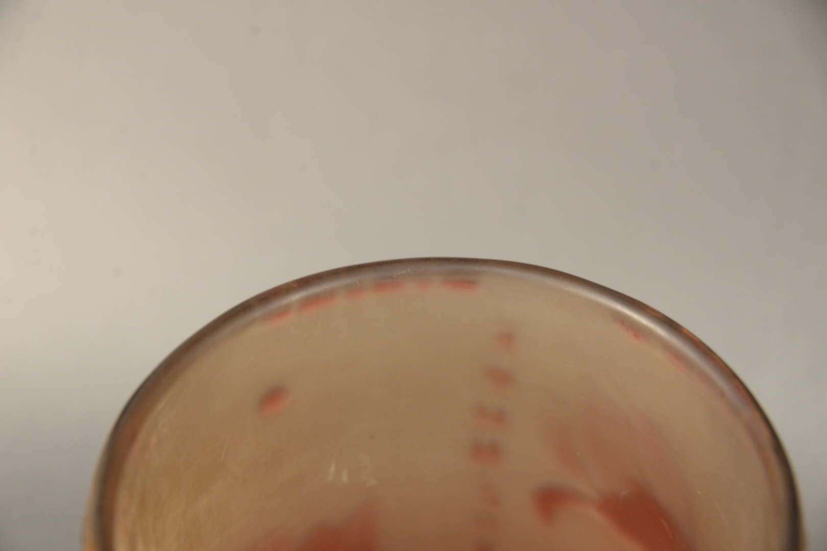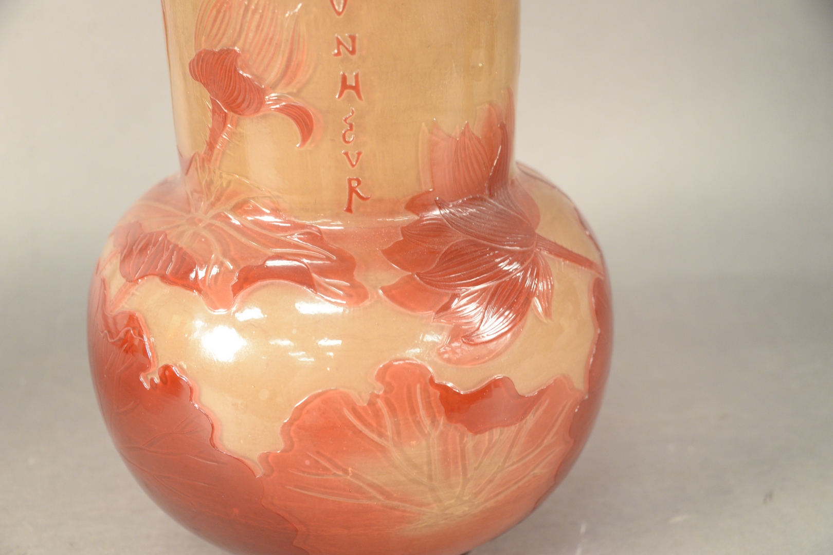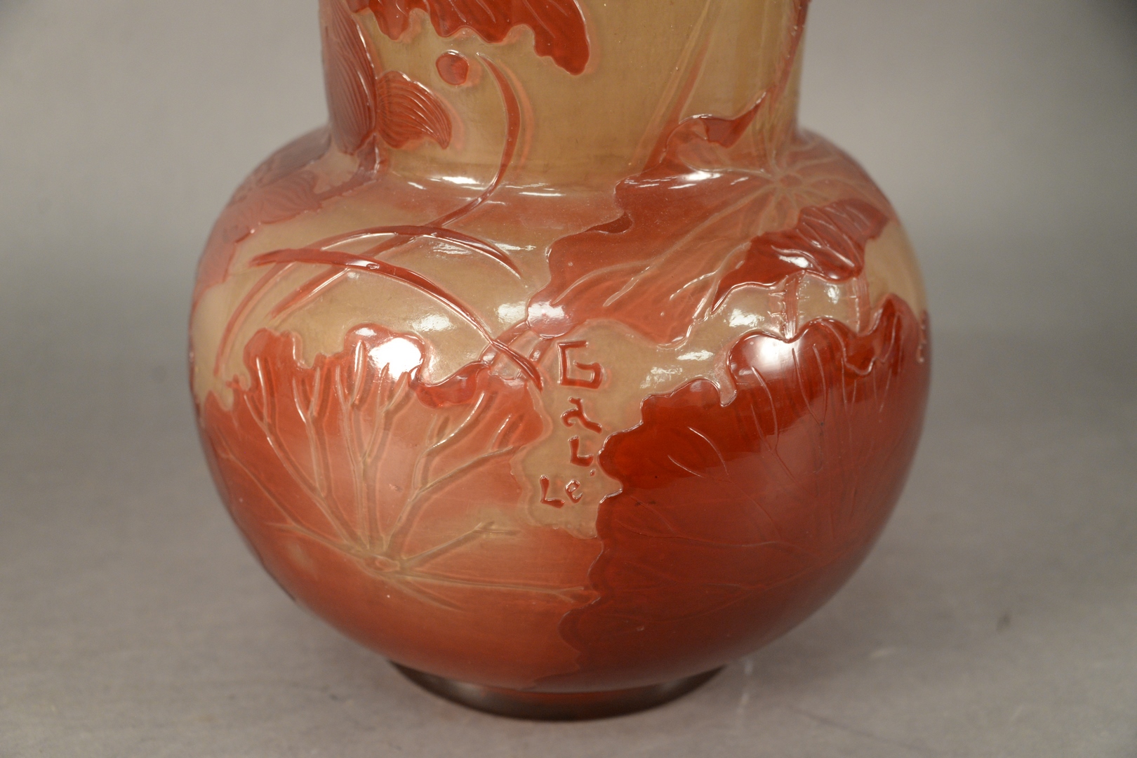 Emile Galle Monumental Verresic Parlante Fire Polished Overlay Glass Vase, having broad neck over globular body and naturalistic lotus blossom pattern, inscribed ‘Bonhear and Galle’ in cameo, height 14 inches.