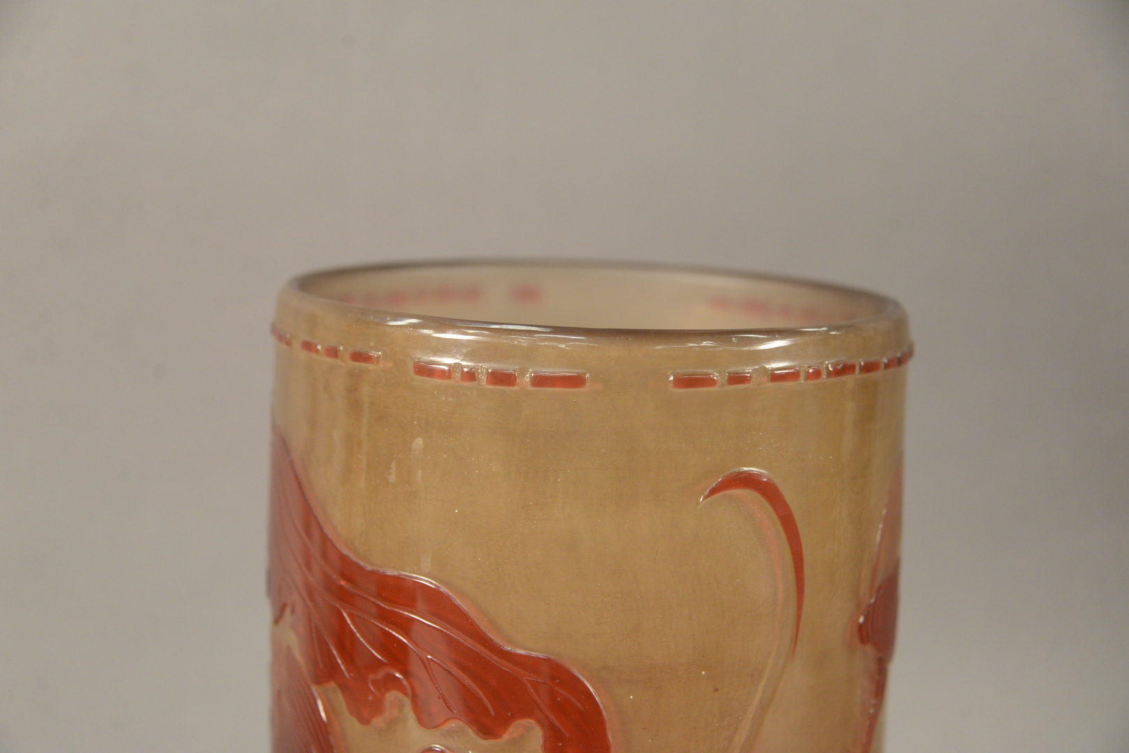 Lot 650: Emile Galle Monumental Verresic Parlante Fire Polished Overlay Glass Vase, having broad neck over globular body and naturalistic l…