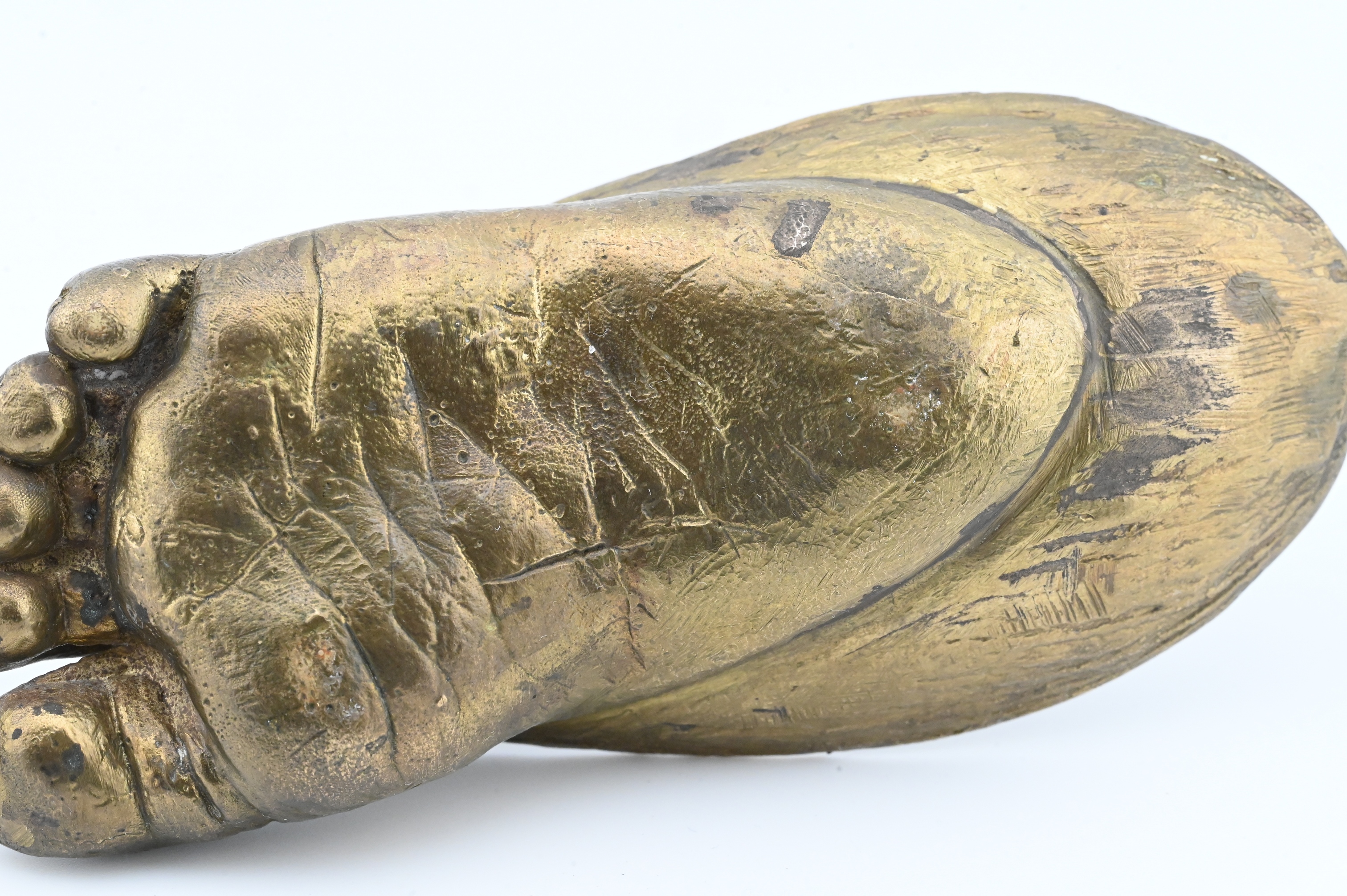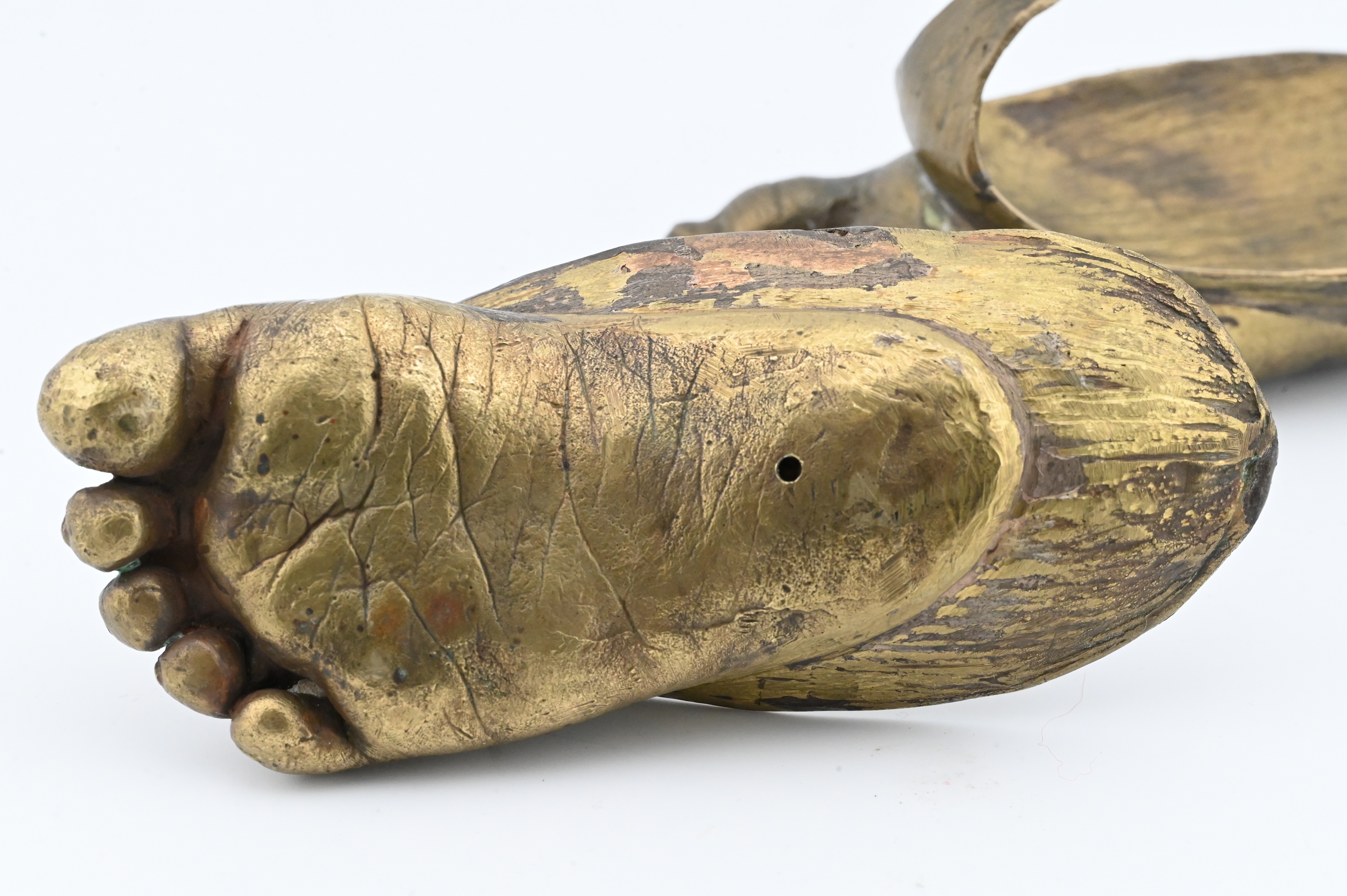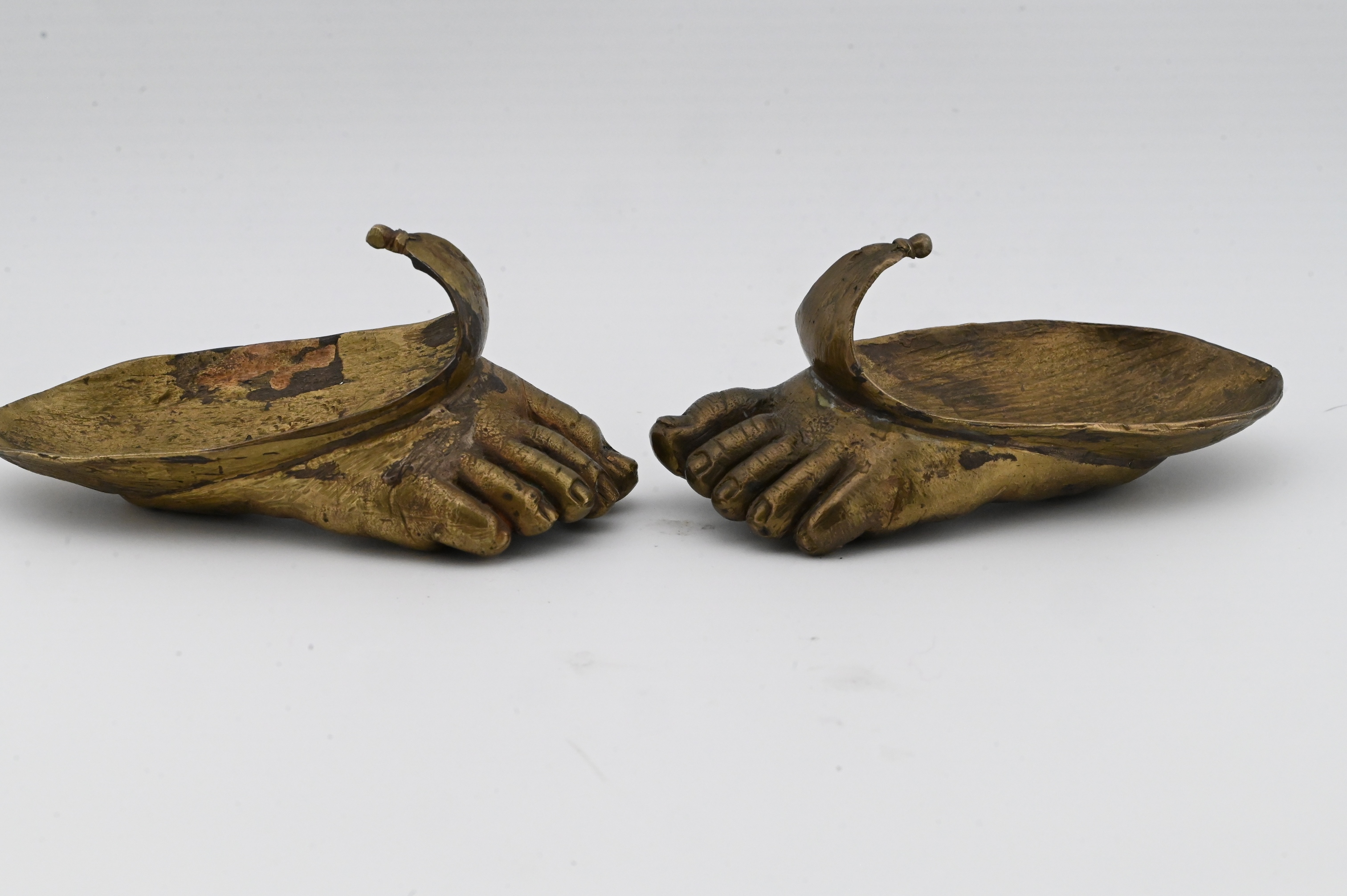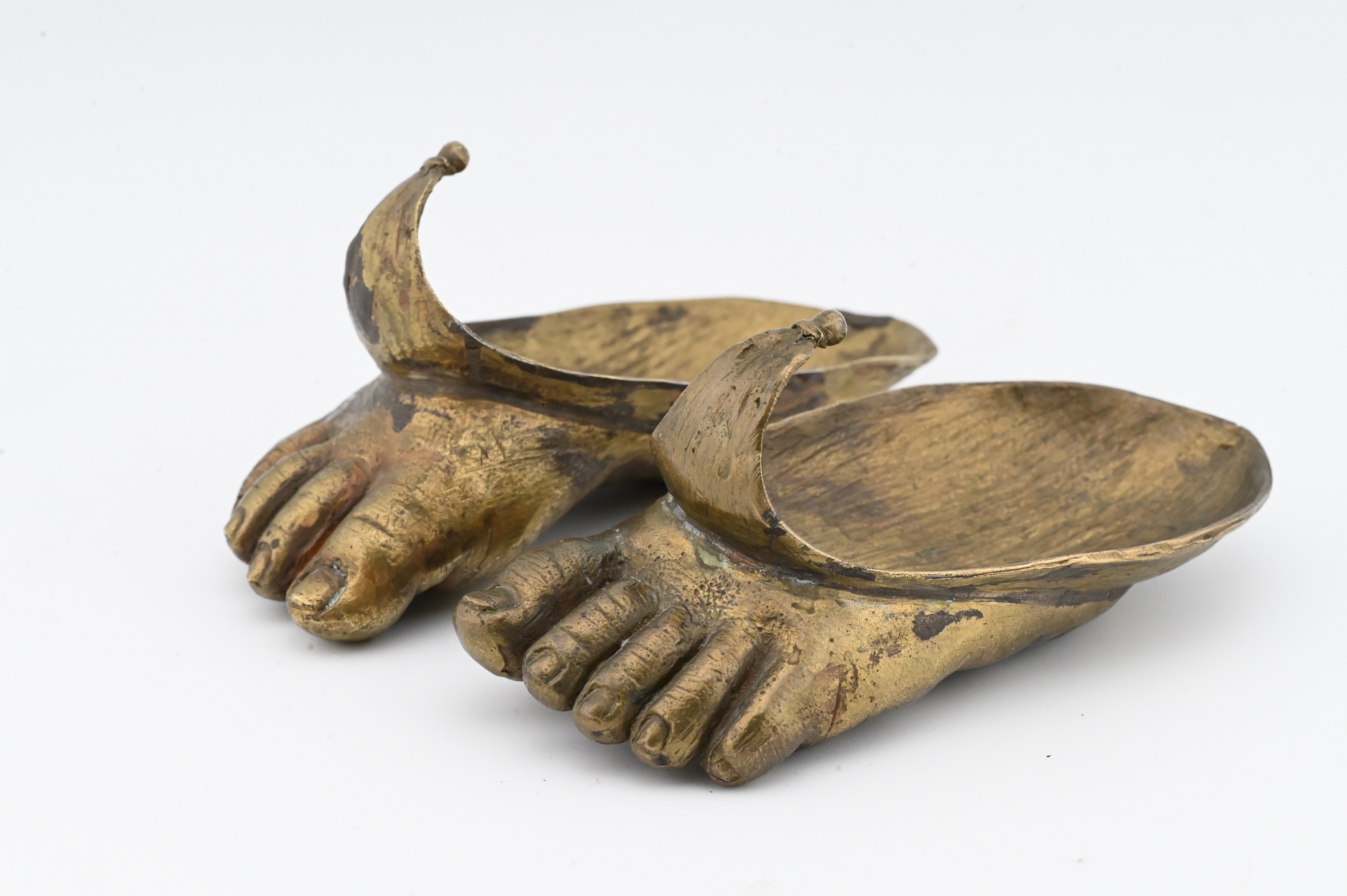 naturalistically cast bronze feet forming shallow cupped vessels, each modeled with expressive anatomical detail including curled toes, defined soles, and textured skin, rising to a lotus-petal-like flare at the front