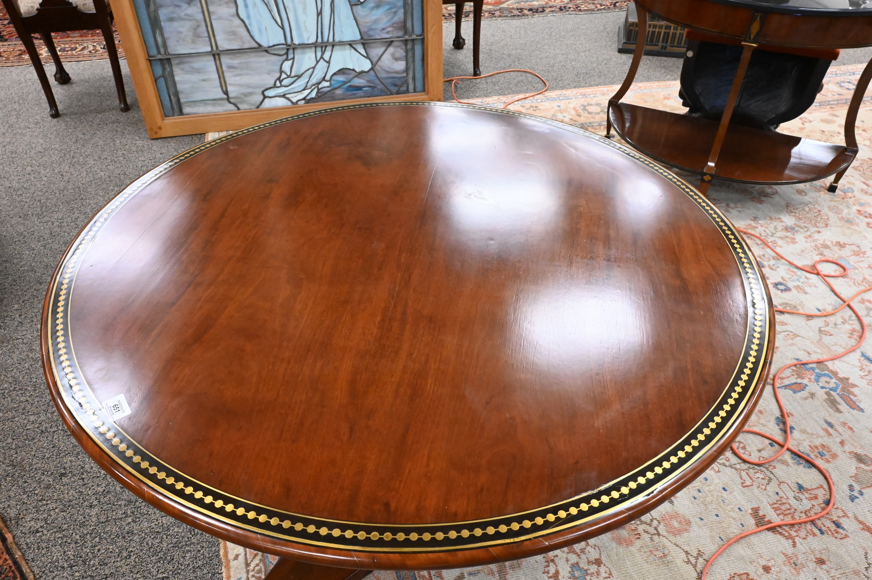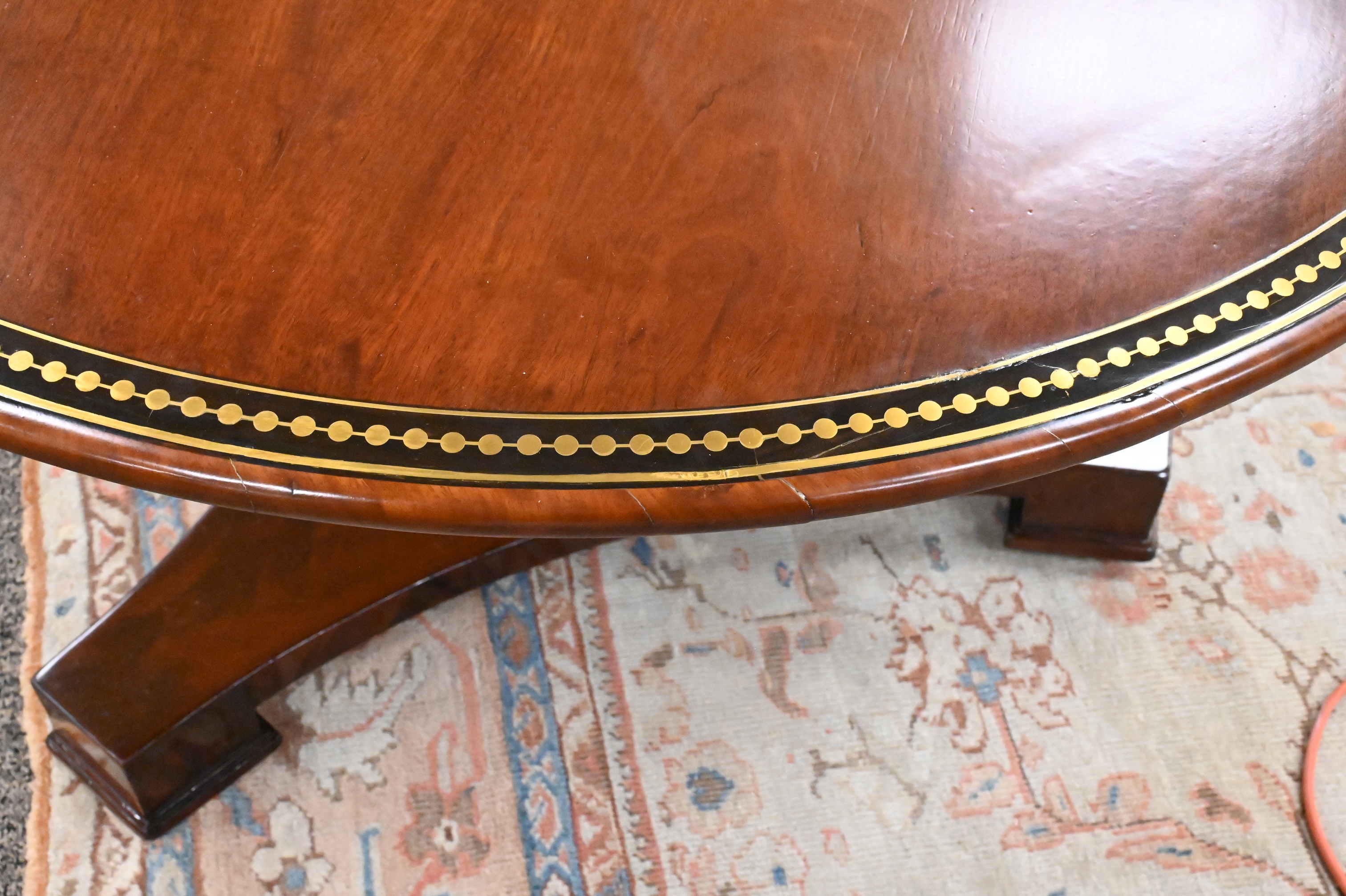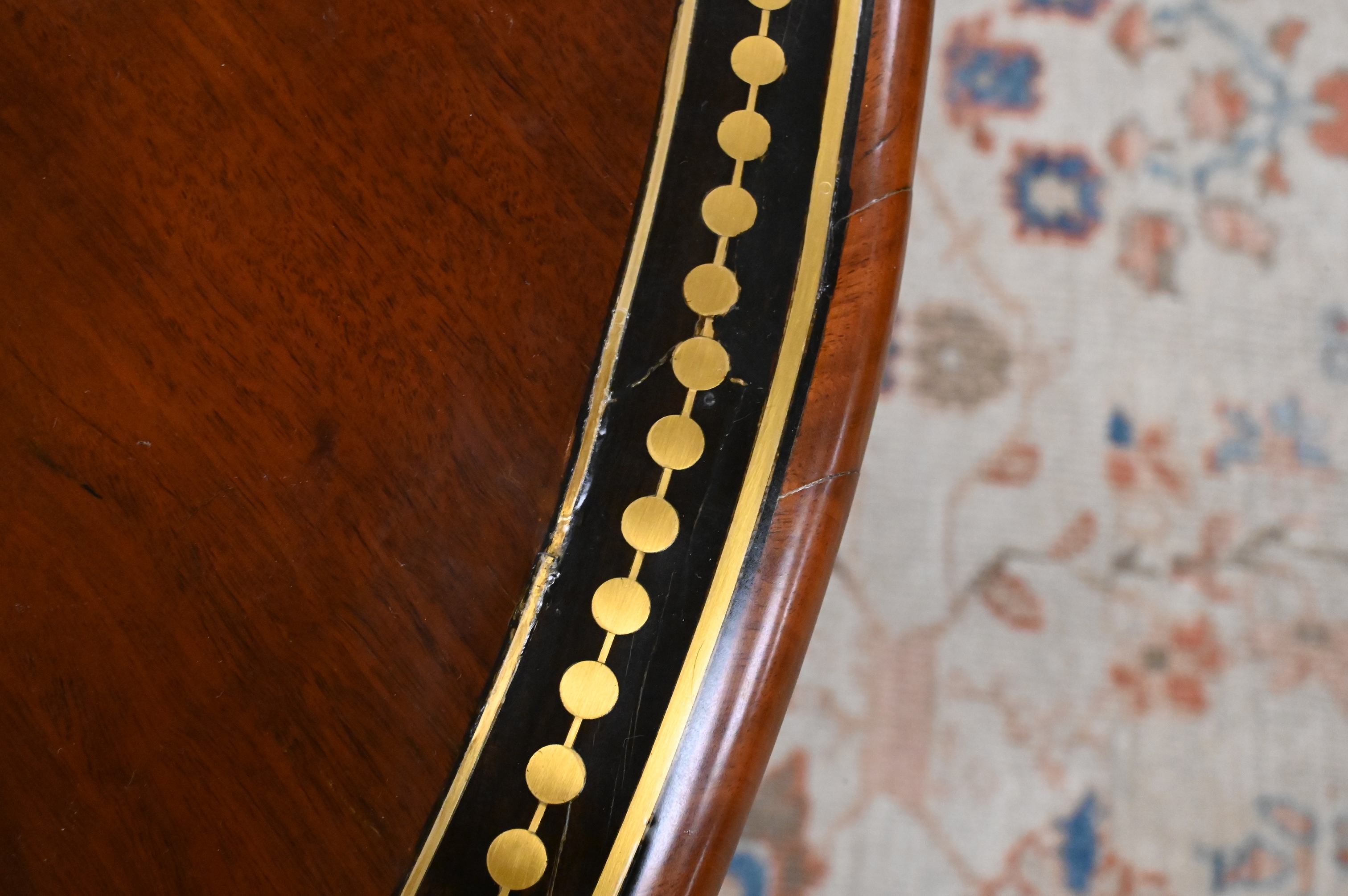 having round brass inlaid top on base with metal X supports, on tri footed base, circa 1840, possibly a replaced top