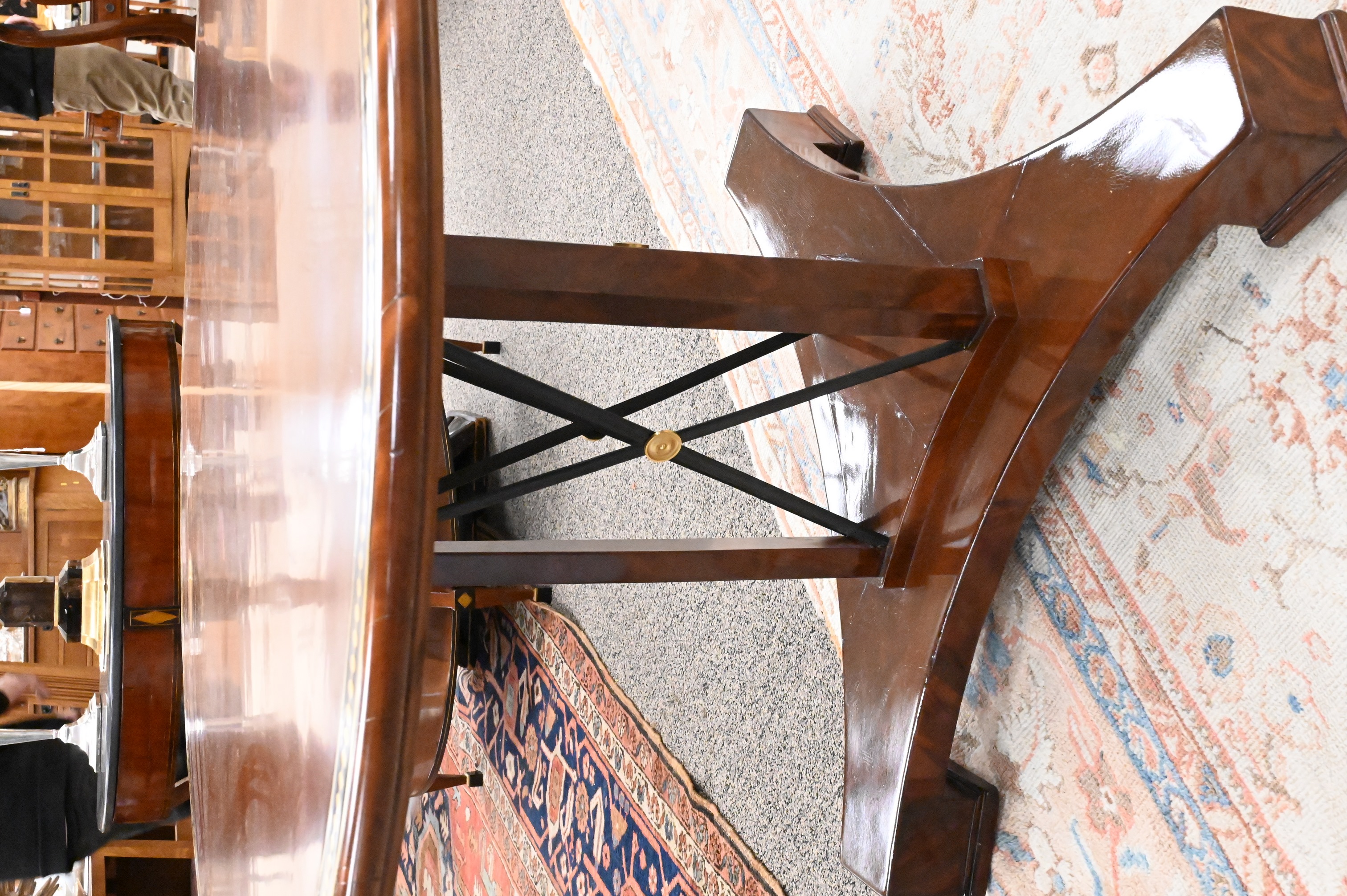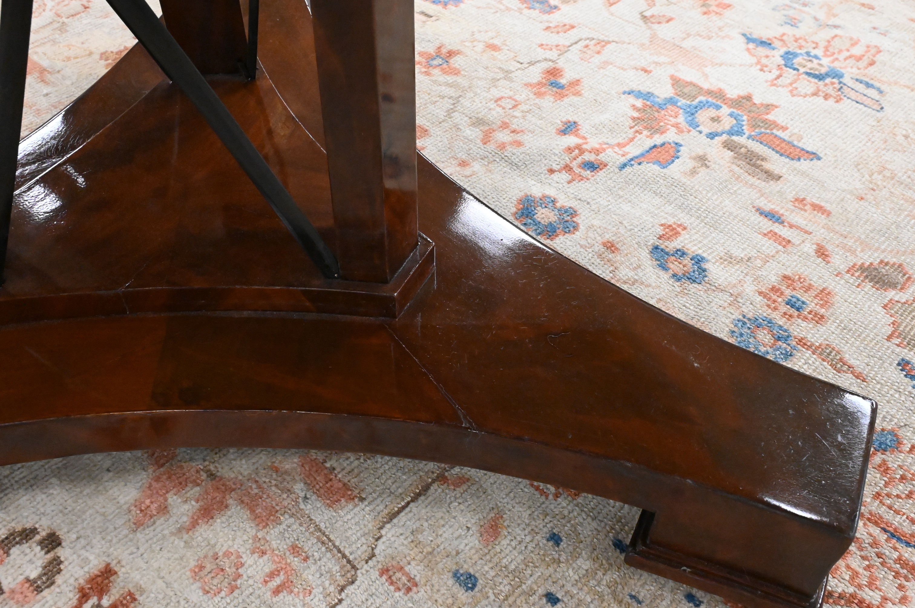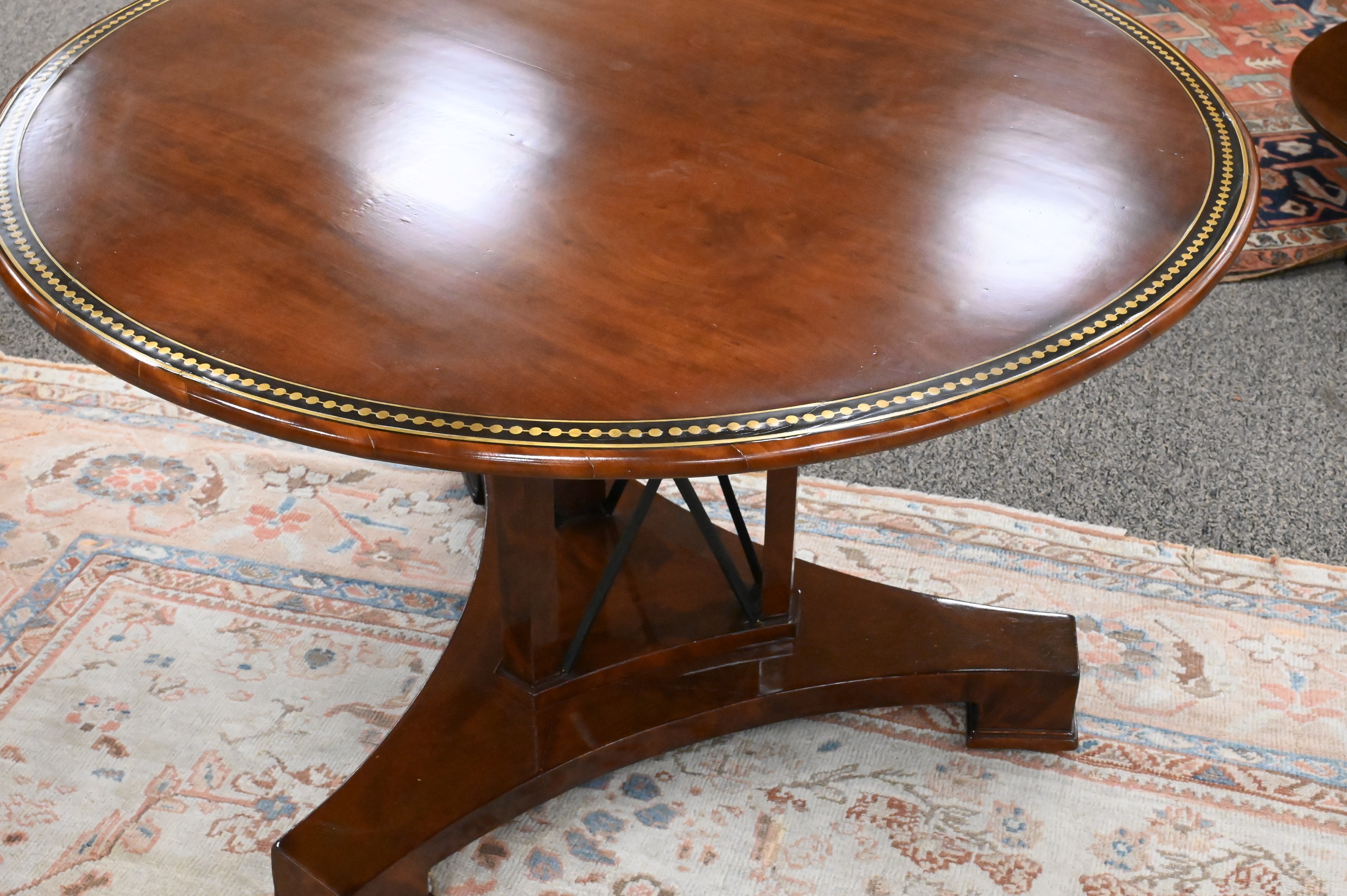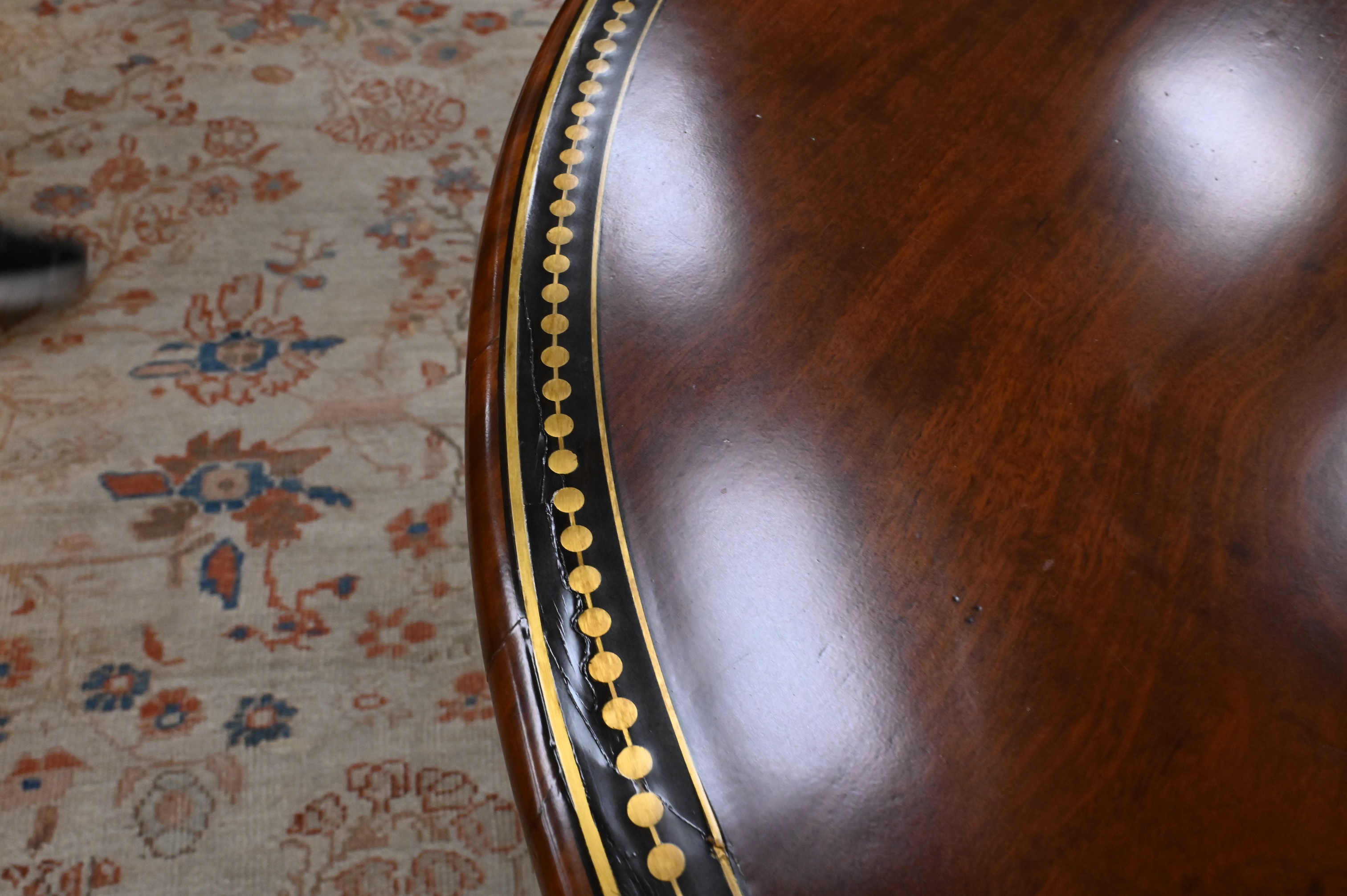 having round brass inlaid top on base with metal X supports, on tri footed base, circa 1840, possibly a replaced top