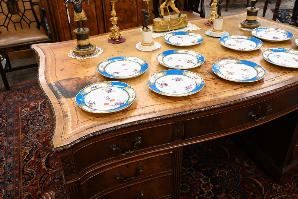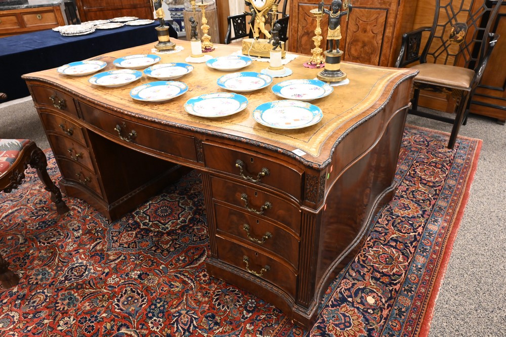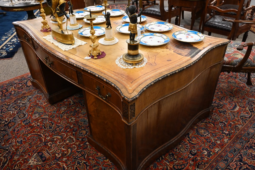George IV Mahogany Pedestal Partners Desk, in the manner of Gillows Lancaster and London, having serpentine form inset leather writing surface, carved edge over conforming serpentine front, back, and ends, front with drawers, back with drawers and doors, stamped W. Wilson, London, height 30 inches, top 41″ x 67″. Provenance: Kentshire Galleries, Ltd., 37 E. 12th Street, New York, 1992, paid $53,500. From a private New York City collection.