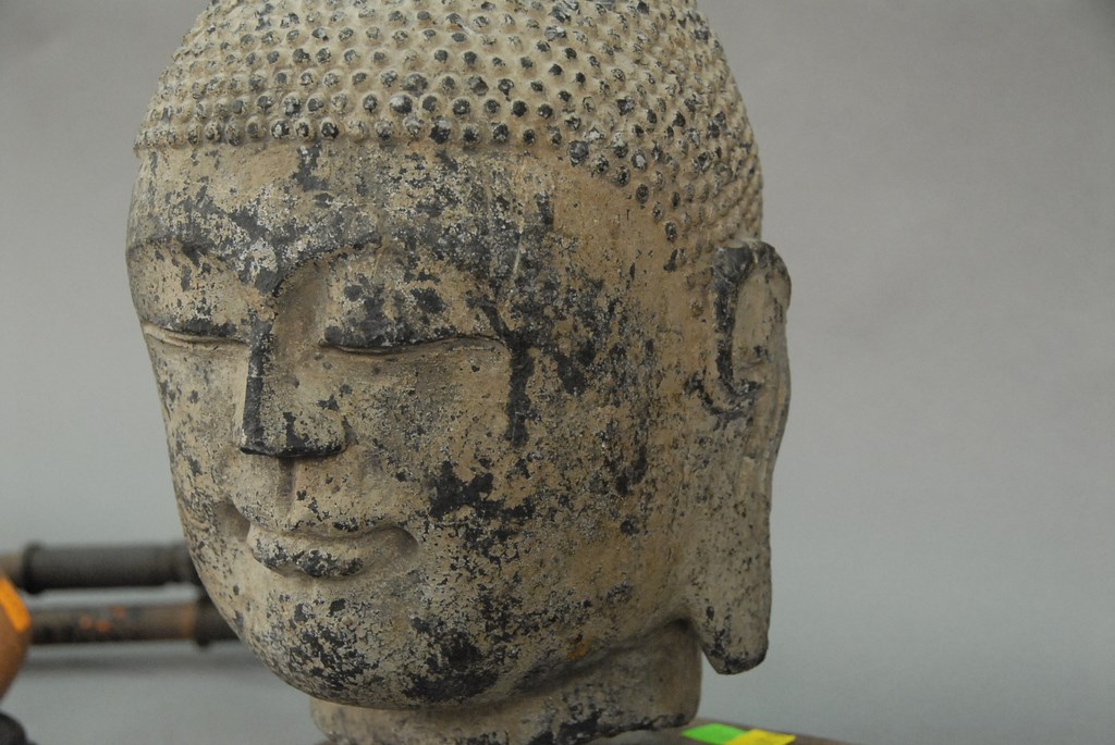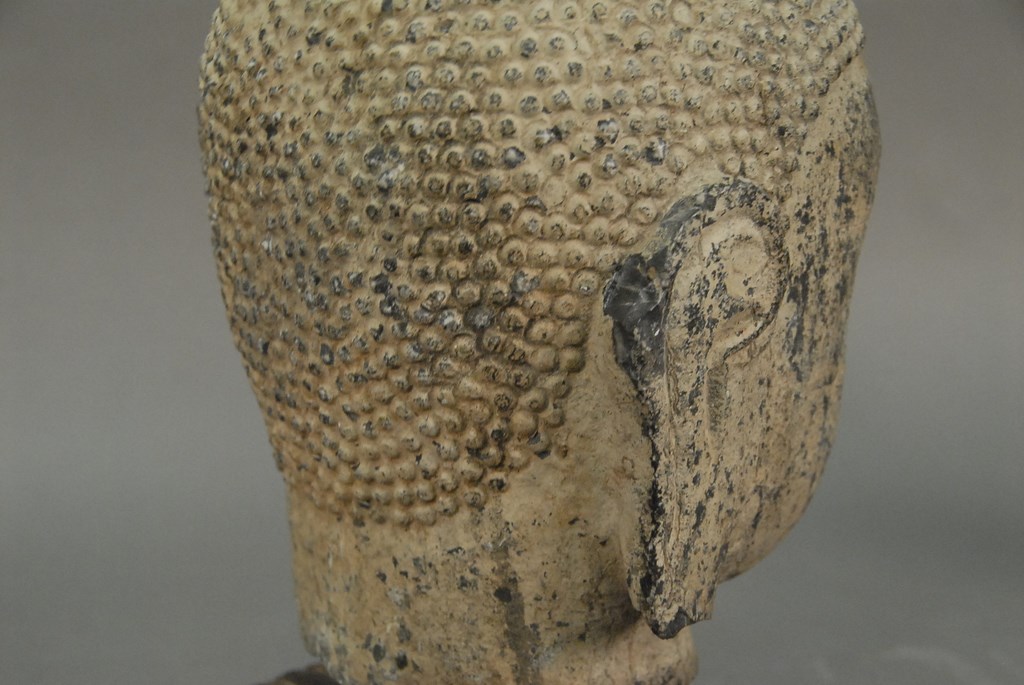 Large stone Buddha head mounted on wood base. ht. 14in.