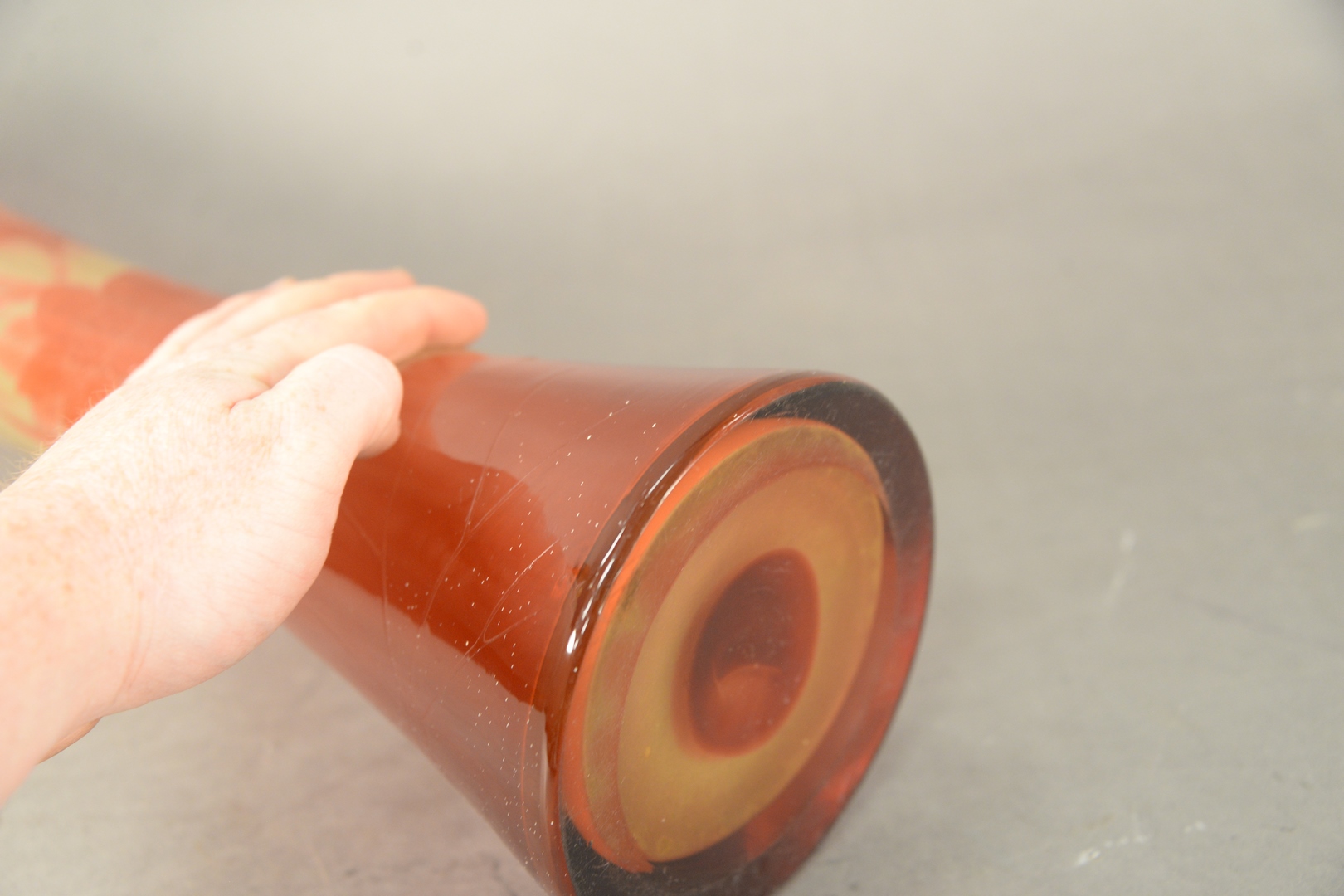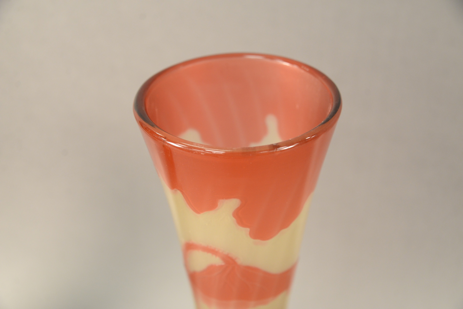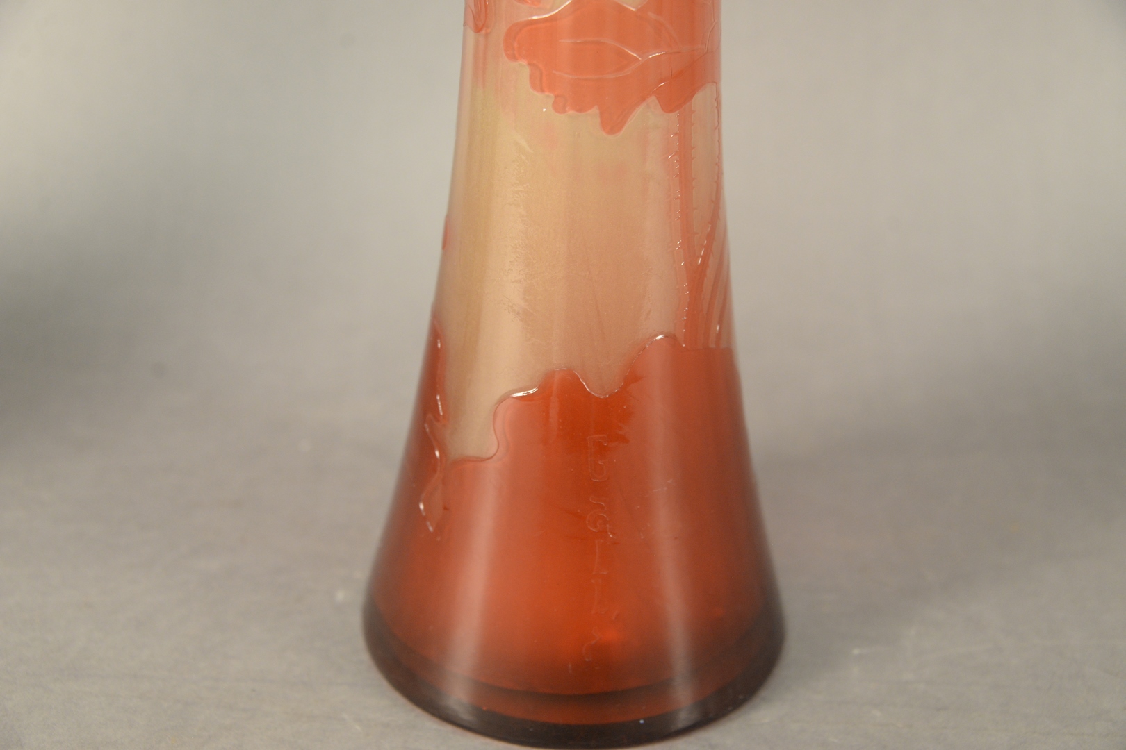 Lot 652: After Galle Tall Cameo Fire Polished Glazed Vase having red lotus blossoms and leaves, inscribed Galle in cameo, height 22 inches.