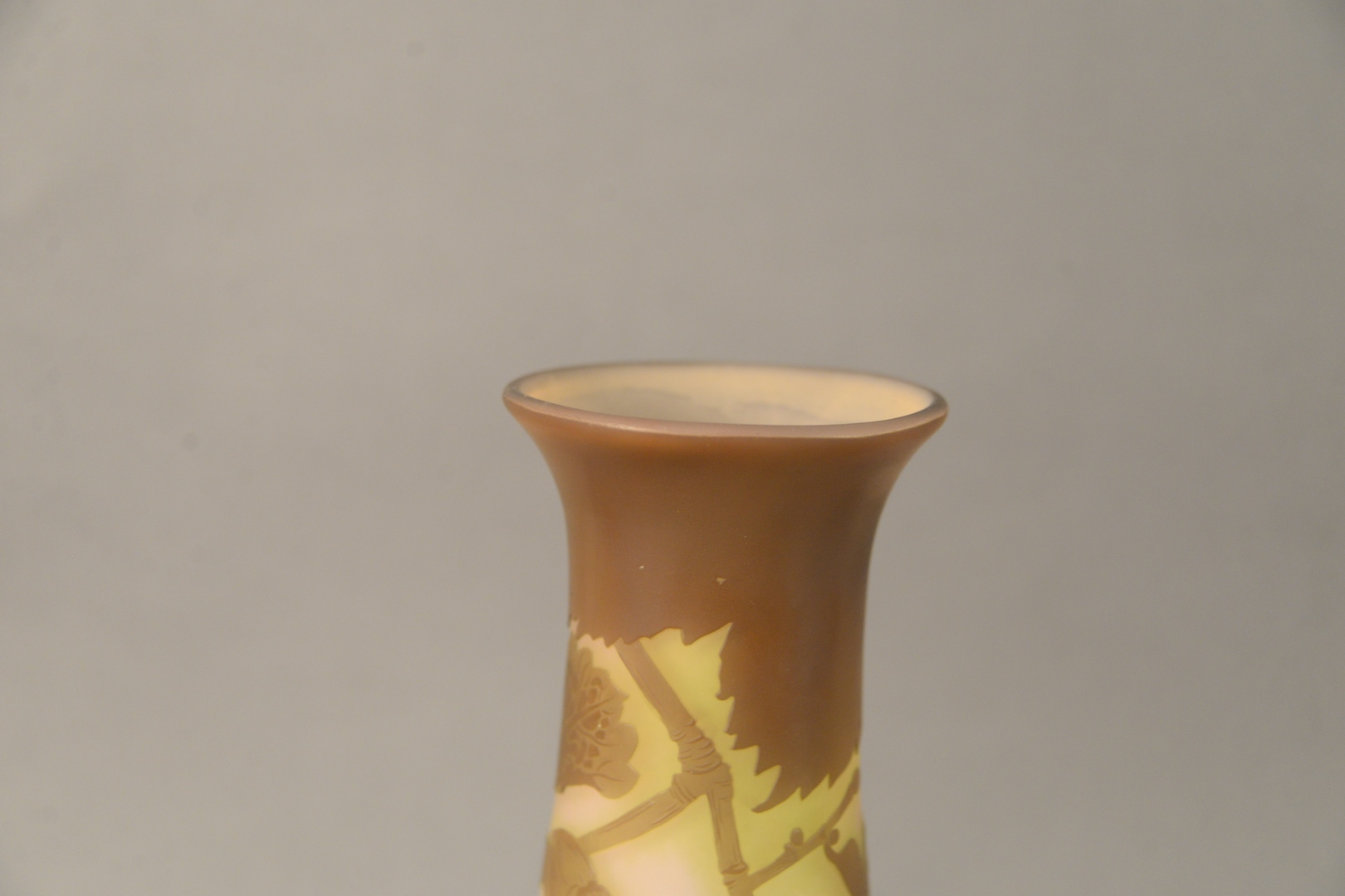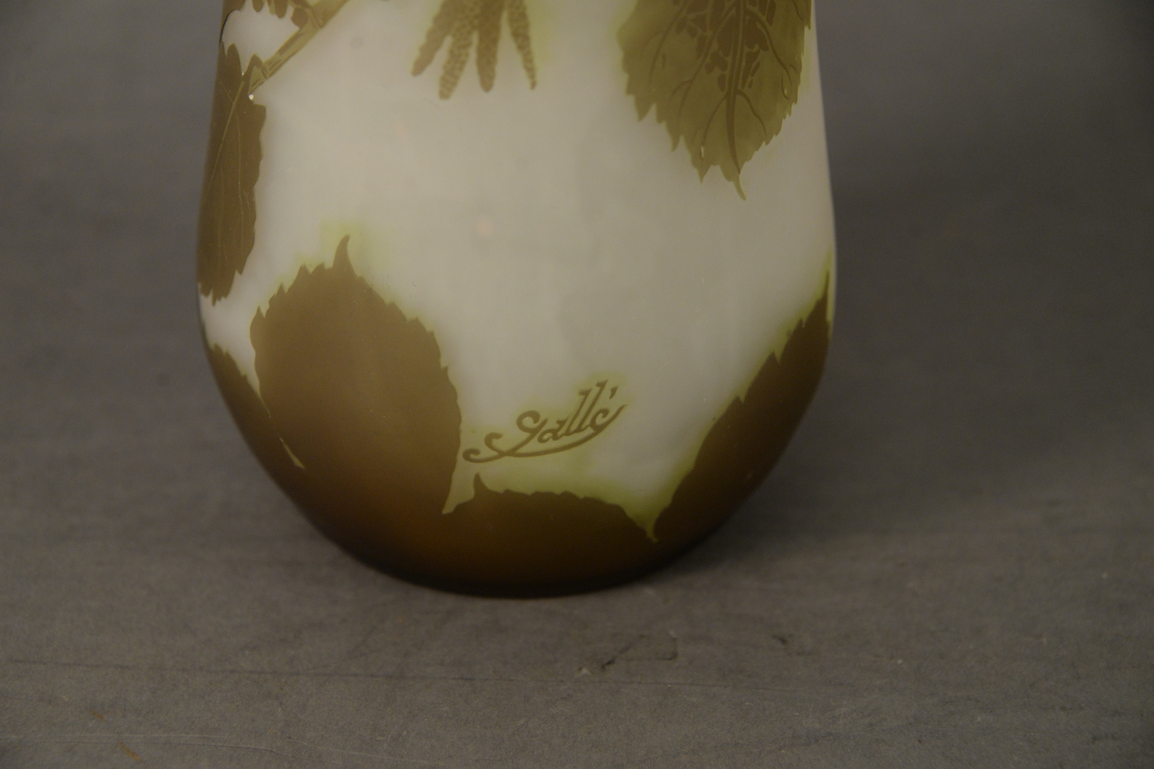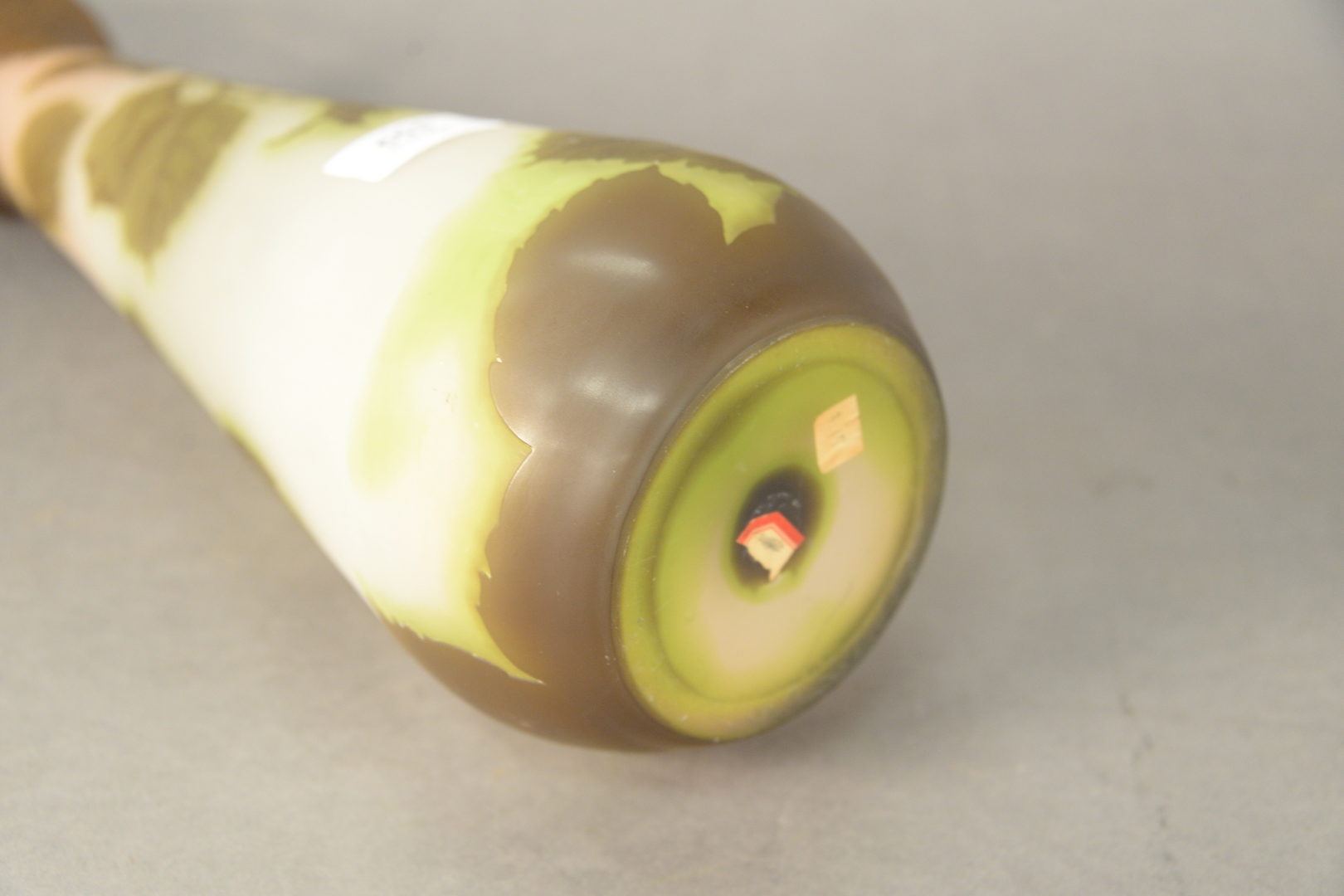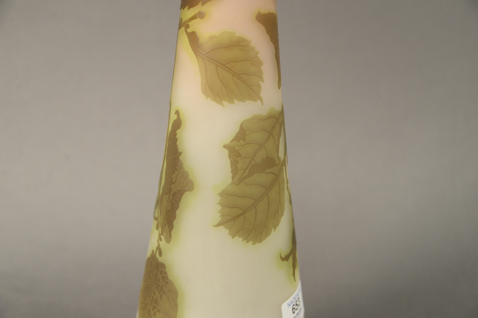Lot 653: Large Emile Galle Cameo Vase having green leaf decorations, marked Galle in cameo along the base, height 16 inches.